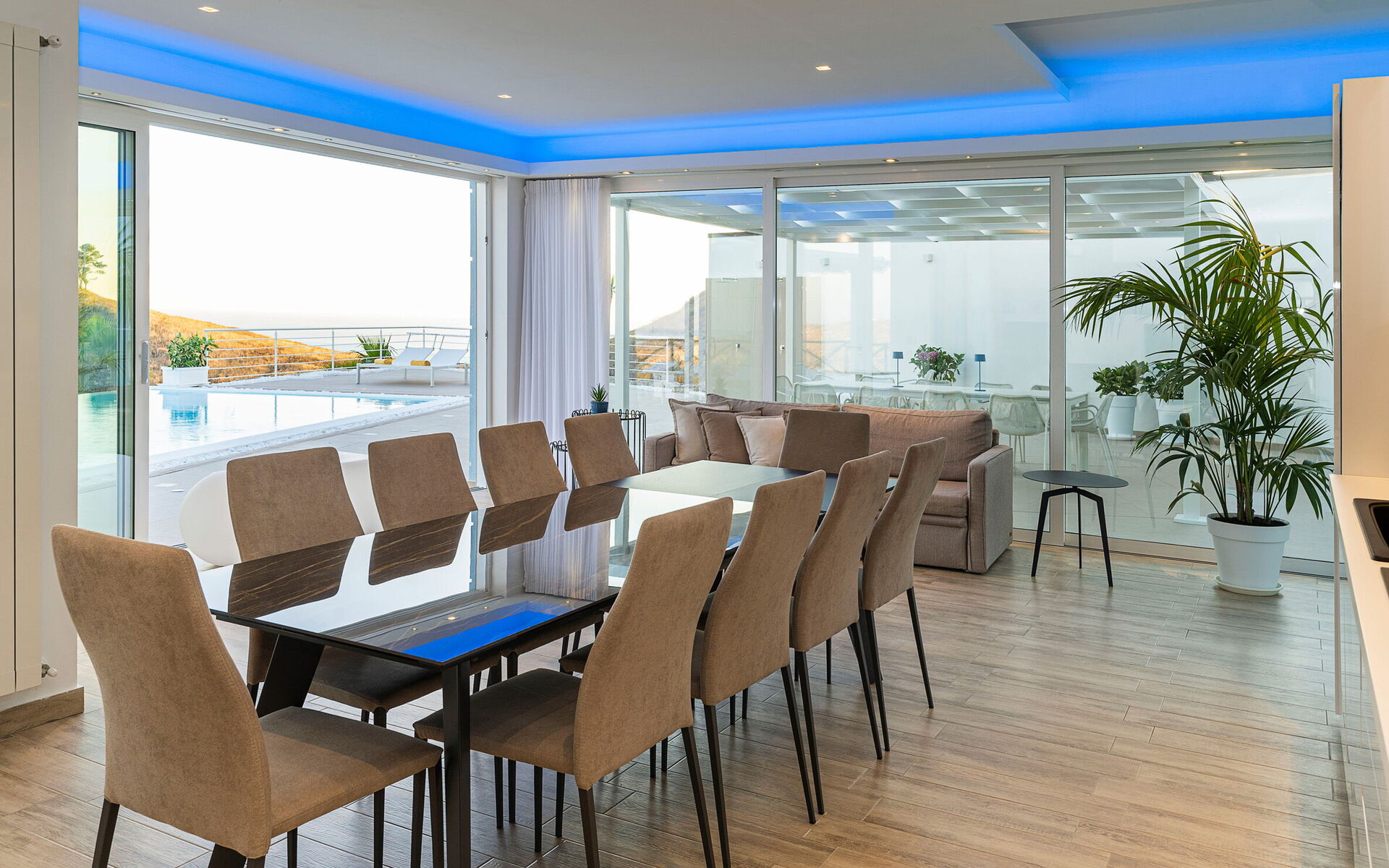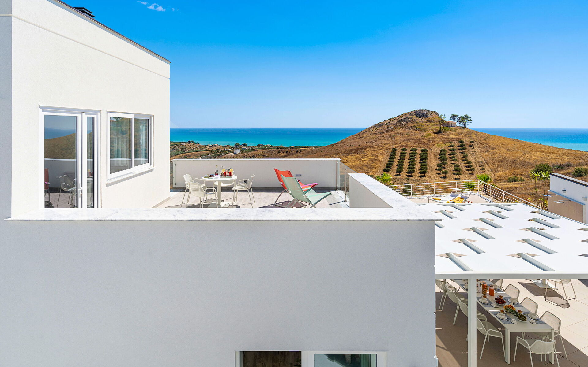 Villa Domizia can comfortably accommodate up to 8 guests and is set on two levels connected by an external staircase. The villa opens into a bright and welcoming open-plan living area featuring a sofa, TV, and dining table with chairs. The modern kitchen is fully equipped and includes a refrigerator and freezer, oven, dishwasher, microwave, espresso coffee machine, kettle, blender, induction hob, American coffee machine, toaster and a high chair for children. On the ground floor there is one double bedroom, one twin bedroom and one bathroom with shower. Going up to the first floor, through the external staircase that links the levels, there are two double bedrooms, both with en-suite bathroom with shower. Complete the first floor a small living area with a kitchenette and a terrace. Outside, guests can enjoy a beautiful private swimming pool with sun loungers, umbrellas, barbecue and outdoor shower surrounded by the peaceful Sicilian countryside. A covered veranda is furnished with an al fresco dining area, ideal for relaxing and enjoying the stunning views. The villa is equipped with air conditioning, heating, Wi-Fi internet connection, washing machine, hairdryer and iron.