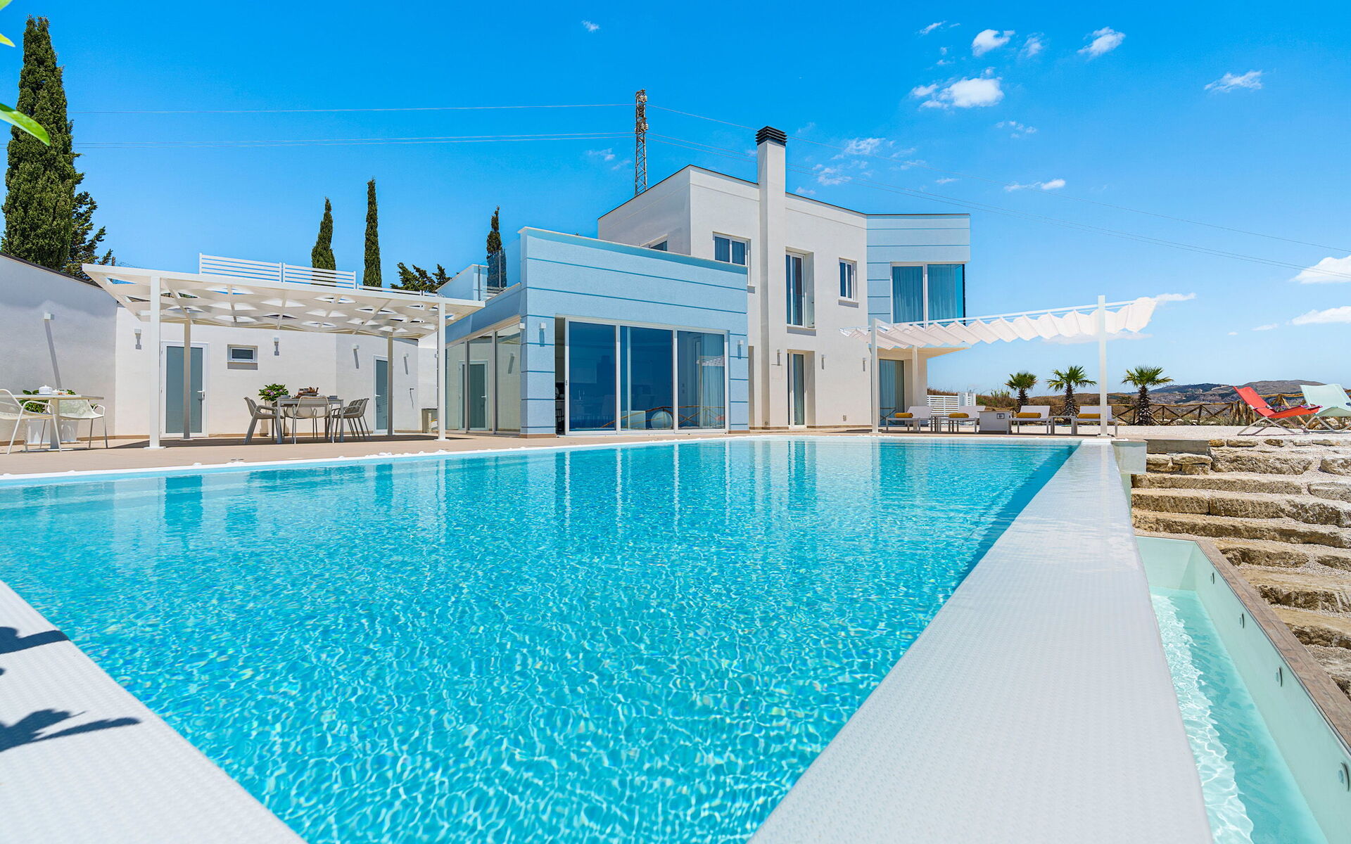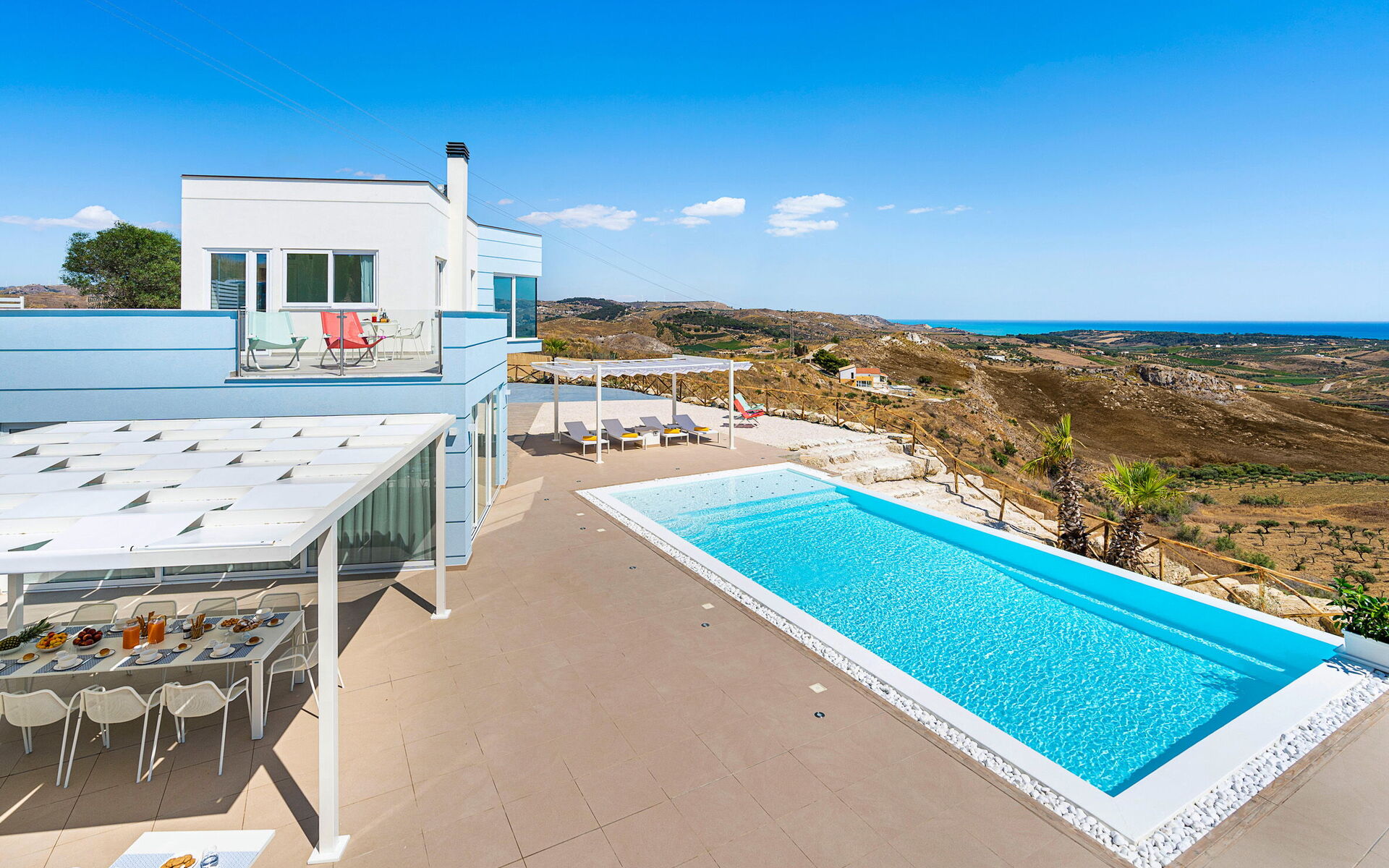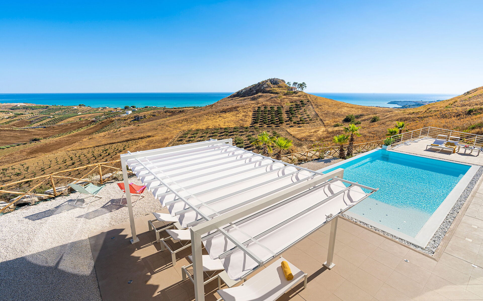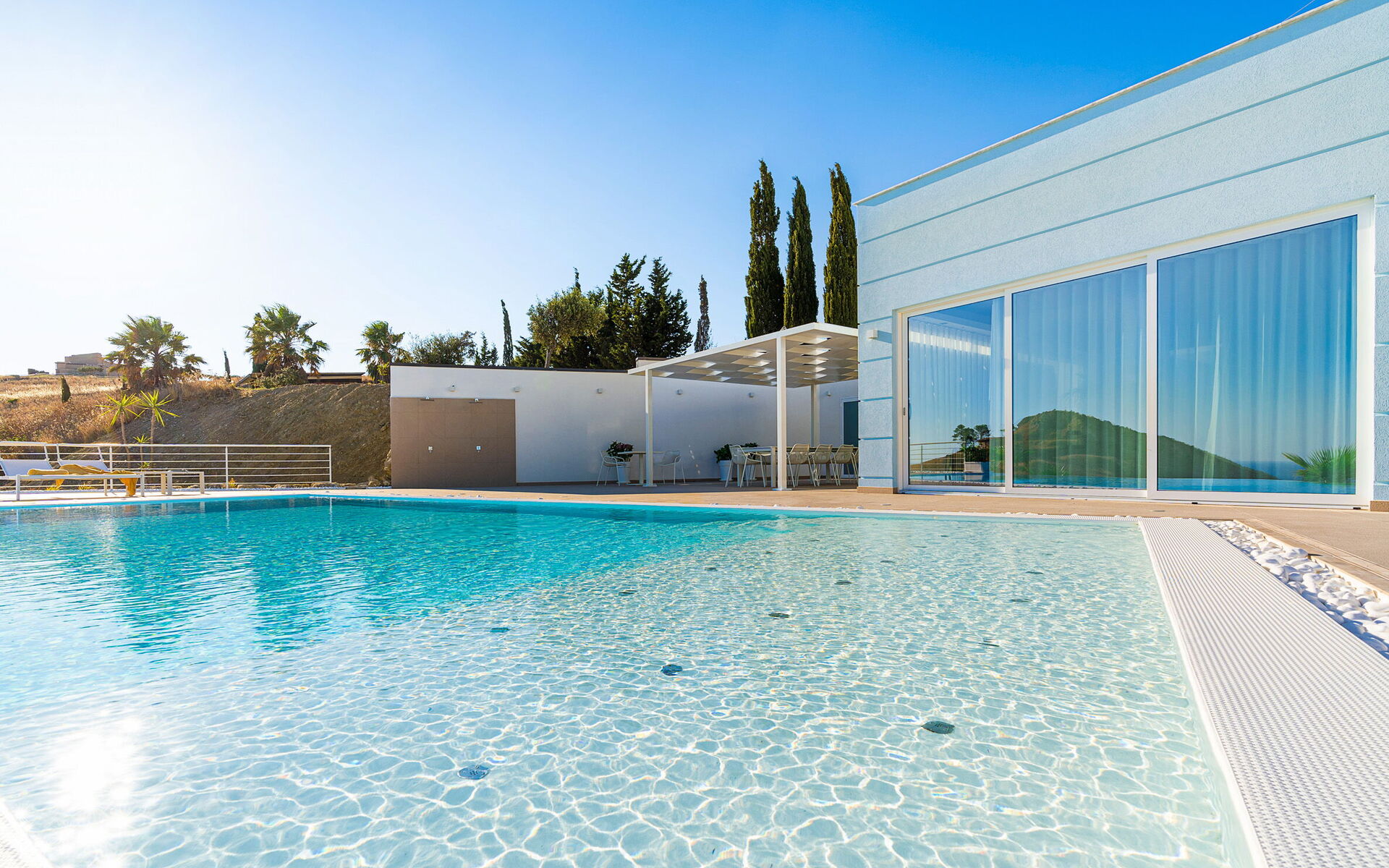 Villa Domizia is a charming and elegant residence located near the beautiful town of Agrigento, on the southern coast of Sicily. Surrounded by the vibrant colors and authentic scents of the Sicilian countryside, this wonderful property offers the perfect setting for a holiday dedicated to relaxation, comfort, and discovery. Its strategic location allows guests to easily reach the nature reserves of Torre Salsa and Foce del Fiume Platani, the sandy beaches of Bovo Marina and Eraclea Minoa, the spectacular white cliffs of Scala dei Turchi, as well as cultural landmarks such as the Valley of the Temples in Agrigento, Sciacca, and Selinunte. Villa Domizia enjoys a privileged position, just a few kilometers from the sea, offering magnificent views over the surrounding countryside. Outdoors, guests can unwind by the beautiful private swimming pool ( 5,0 mt x 11,00 mt, deep min 0,30 mt - max 1,70 mt), equipped with sun loungers — perfect for cooling off on warm summer days. A covered veranda features a comfortable al fresco dining area, ideal for enjoying relaxing meals surrounded by the peace and beauty of the Sicilian landscape.