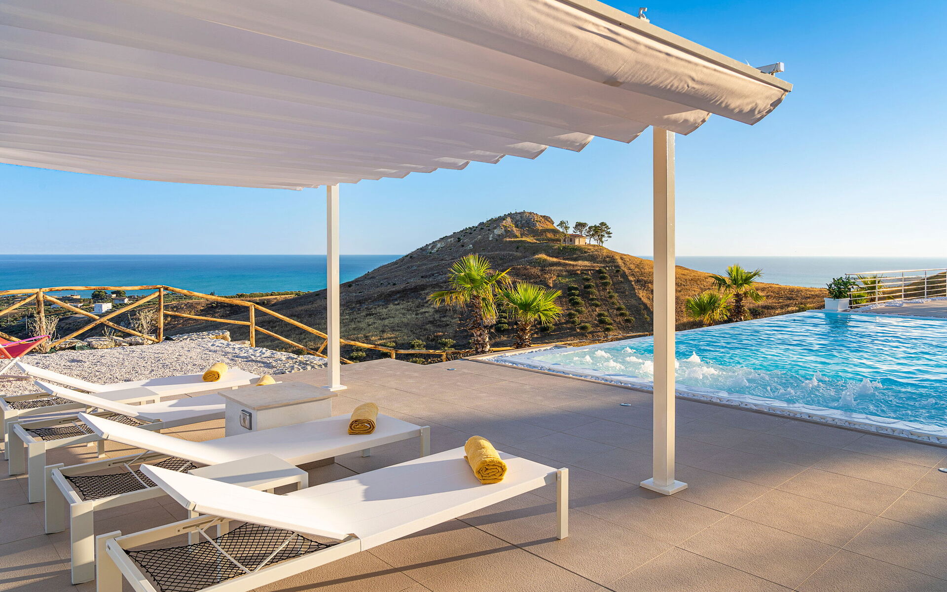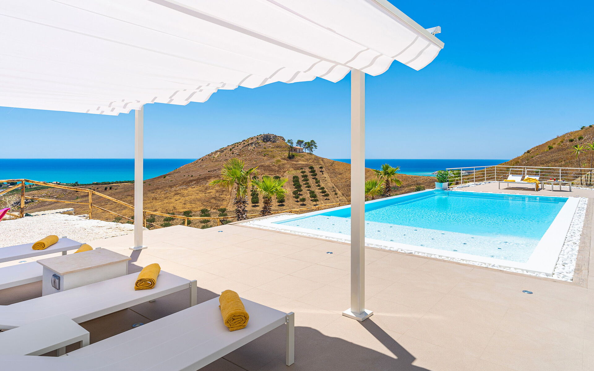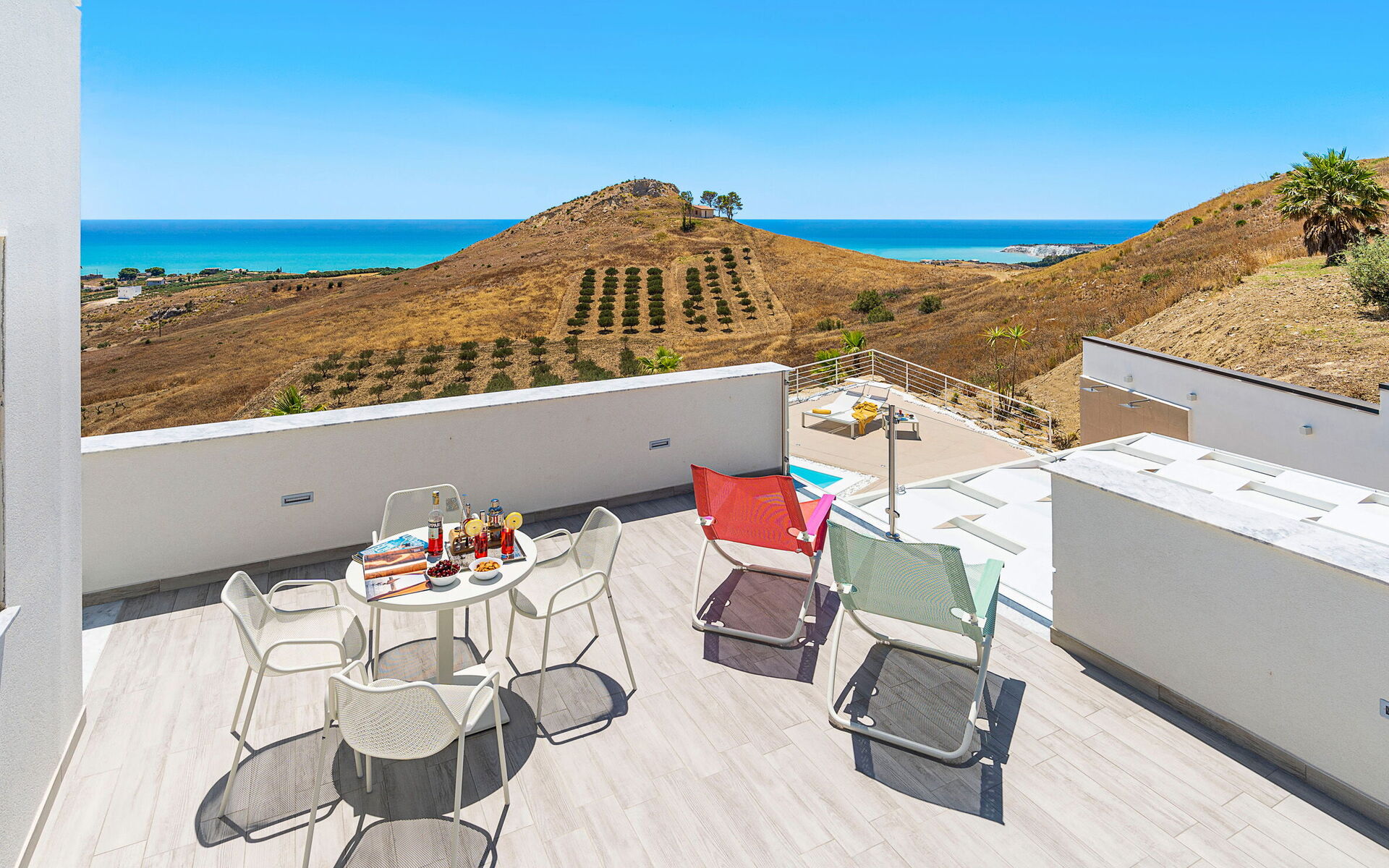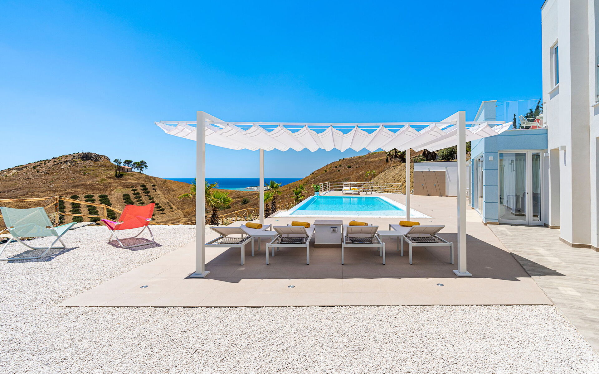 Villa Domizia is a charming and elegant residence located near the beautiful town of Agrigento, on the southern coast of Sicily. Surrounded by the vibrant colors and authentic scents of the Sicilian countryside, this wonderful property offers the perfect setting for a holiday dedicated to relaxation, comfort, and discovery. Its strategic location allows guests to easily reach the nature reserves of Torre Salsa and Foce del Fiume Platani, the sandy beaches of Bovo Marina and Eraclea Minoa, the spectacular white cliffs of Scala dei Turchi, as well as cultural landmarks such as the Valley of the Temples in Agrigento, Sciacca, and Selinunte. Villa Domizia enjoys a privileged position, just a few kilometers from the sea, offering magnificent views over the surrounding countryside. Outdoors, guests can unwind by the beautiful private swimming pool ( 5,0 mt x 11,00 mt, deep min 0,30 mt - max 1,70 mt), equipped with sun loungers — perfect for cooling off on warm summer days. A covered veranda features a comfortable al fresco dining area, ideal for enjoying relaxing meals surrounded by the peace and beauty of the Sicilian landscape.