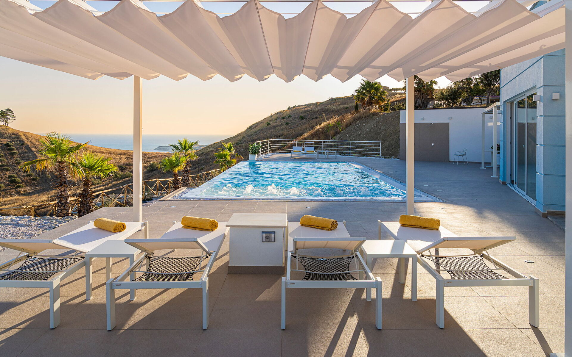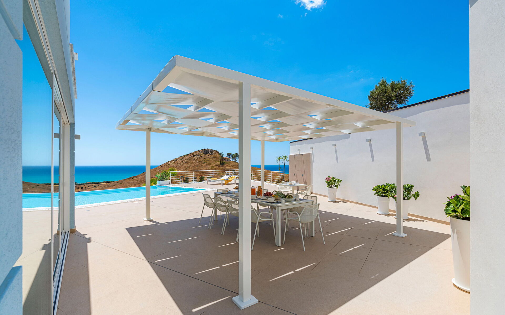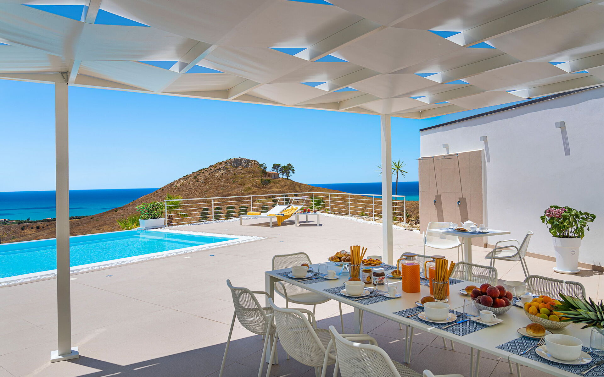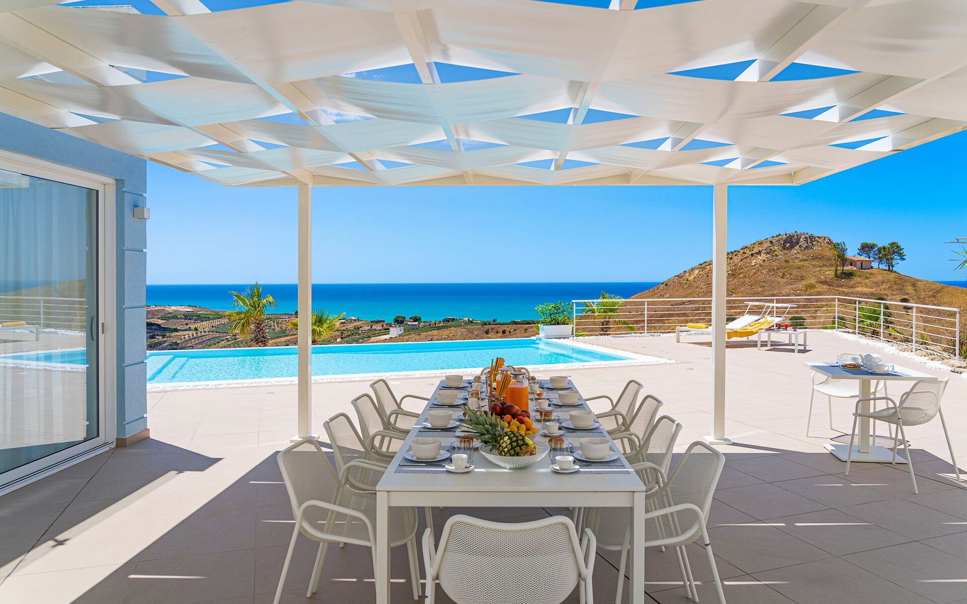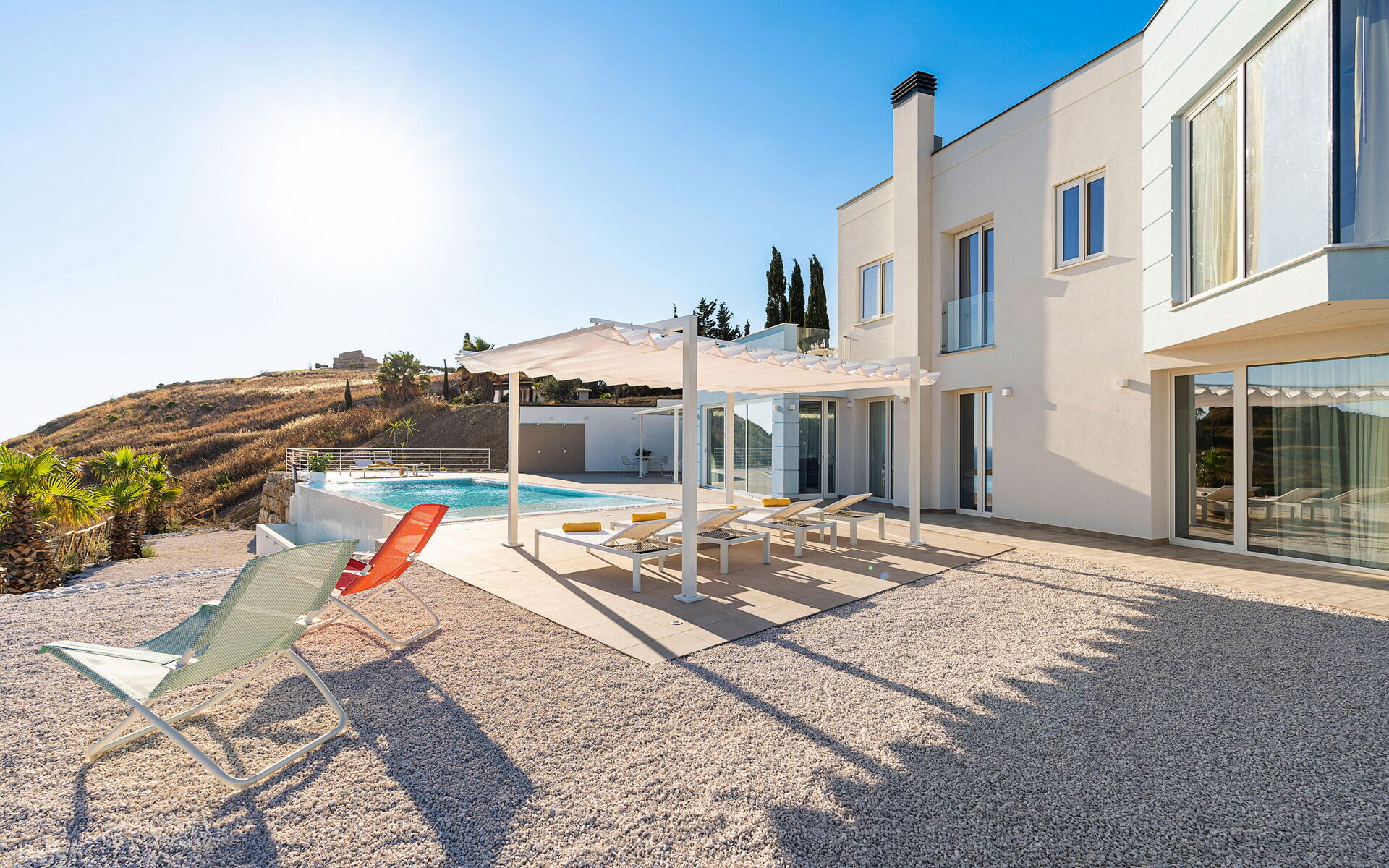 Villa Domizia is a charming and elegant residence located near the beautiful town of Agrigento, on the southern coast of Sicily. Surrounded by the vibrant colors and authentic scents of the Sicilian countryside, this wonderful property offers the perfect setting for a holiday dedicated to relaxation, comfort, and discovery. Its strategic location allows guests to easily reach the nature reserves of Torre Salsa and Foce del Fiume Platani, the sandy beaches of Bovo Marina and Eraclea Minoa, the spectacular white cliffs of Scala dei Turchi, as well as cultural landmarks such as the Valley of the Temples in Agrigento, Sciacca, and Selinunte. Villa Domizia enjoys a privileged position, just a few kilometers from the sea, offering magnificent views over the surrounding countryside. Outdoors, guests can unwind by the beautiful private swimming pool ( 5,0 mt x 11,00 mt, deep min 0,30 mt - max 1,70 mt), equipped with sun loungers — perfect for cooling off on warm summer days. A covered veranda features a comfortable al fresco dining area, ideal for enjoying relaxing meals surrounded by the peace and beauty of the Sicilian landscape.