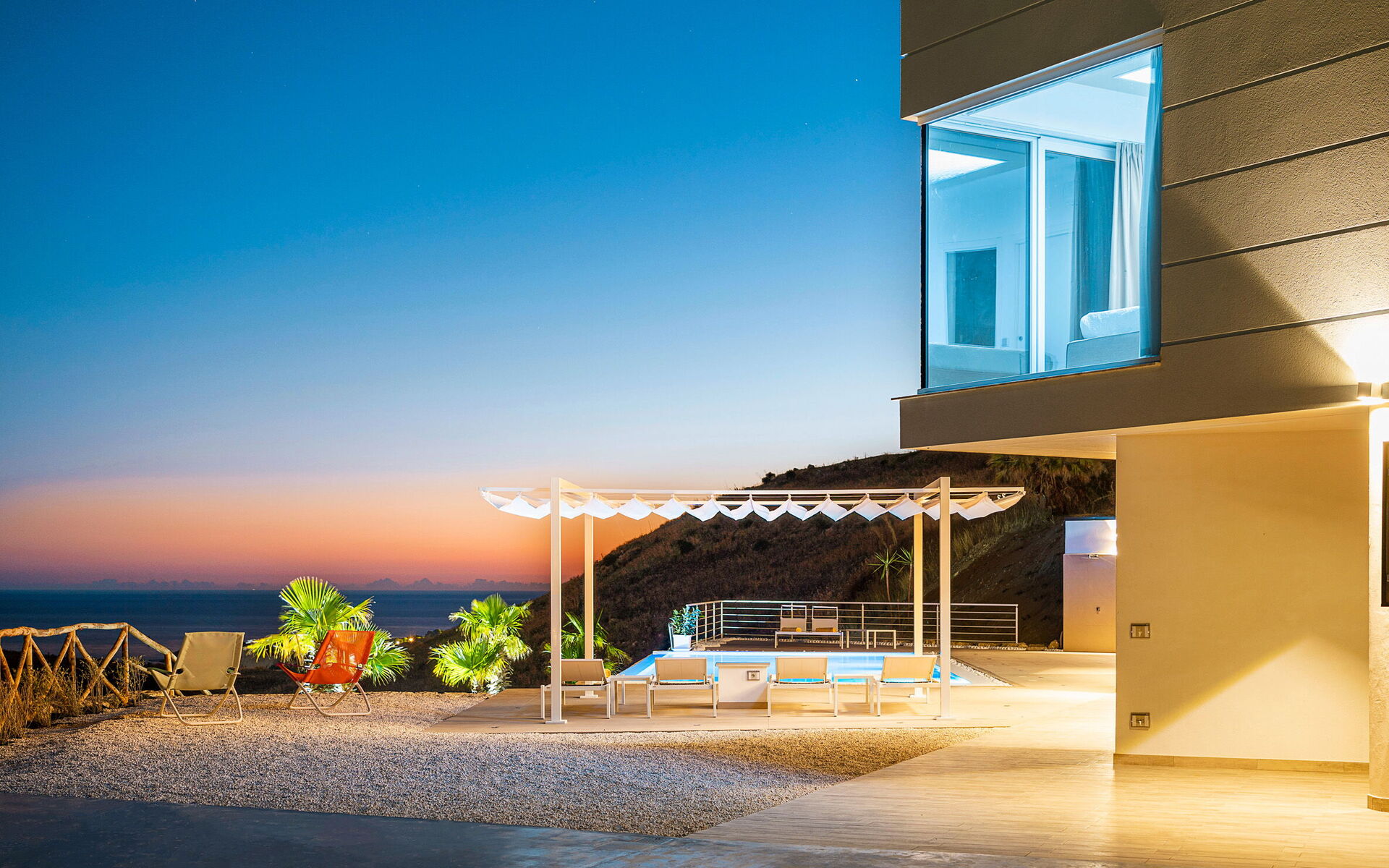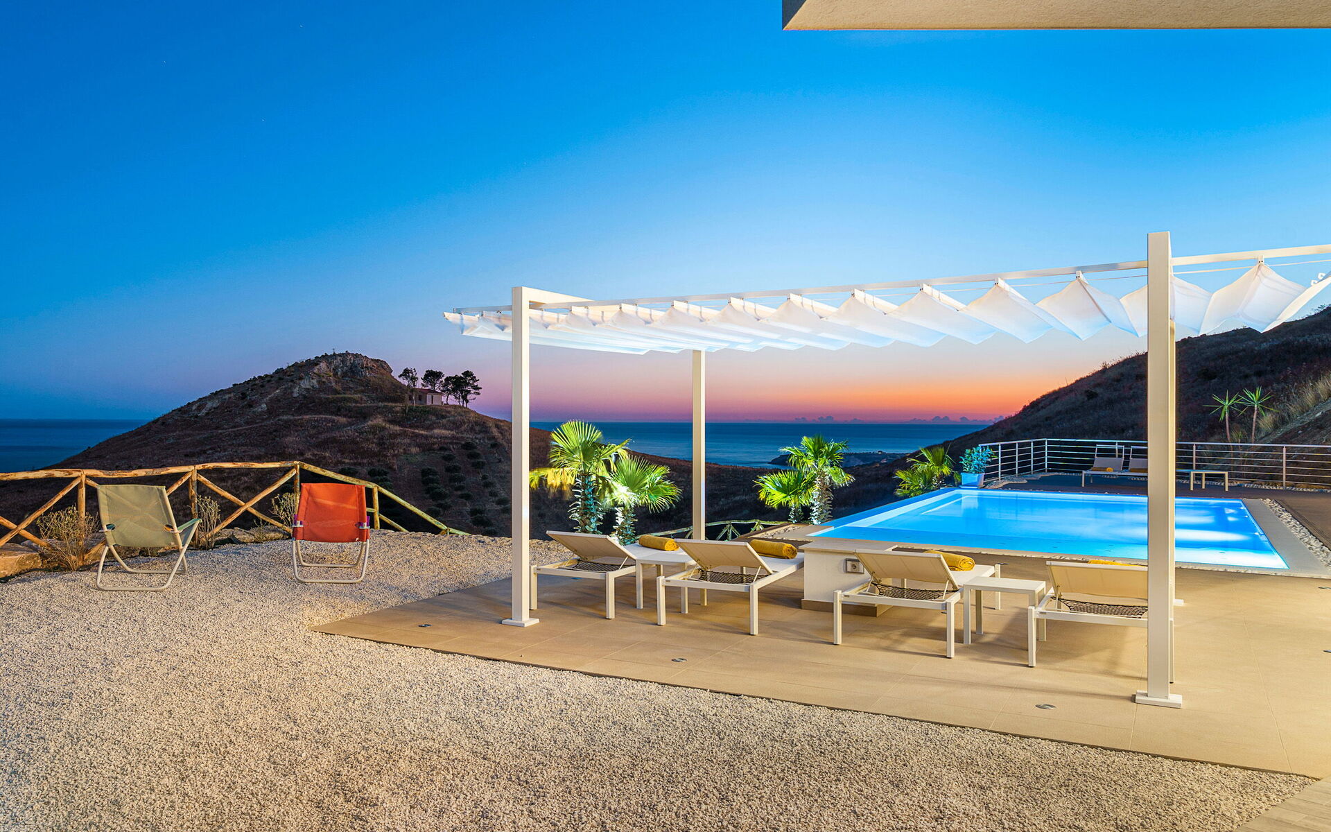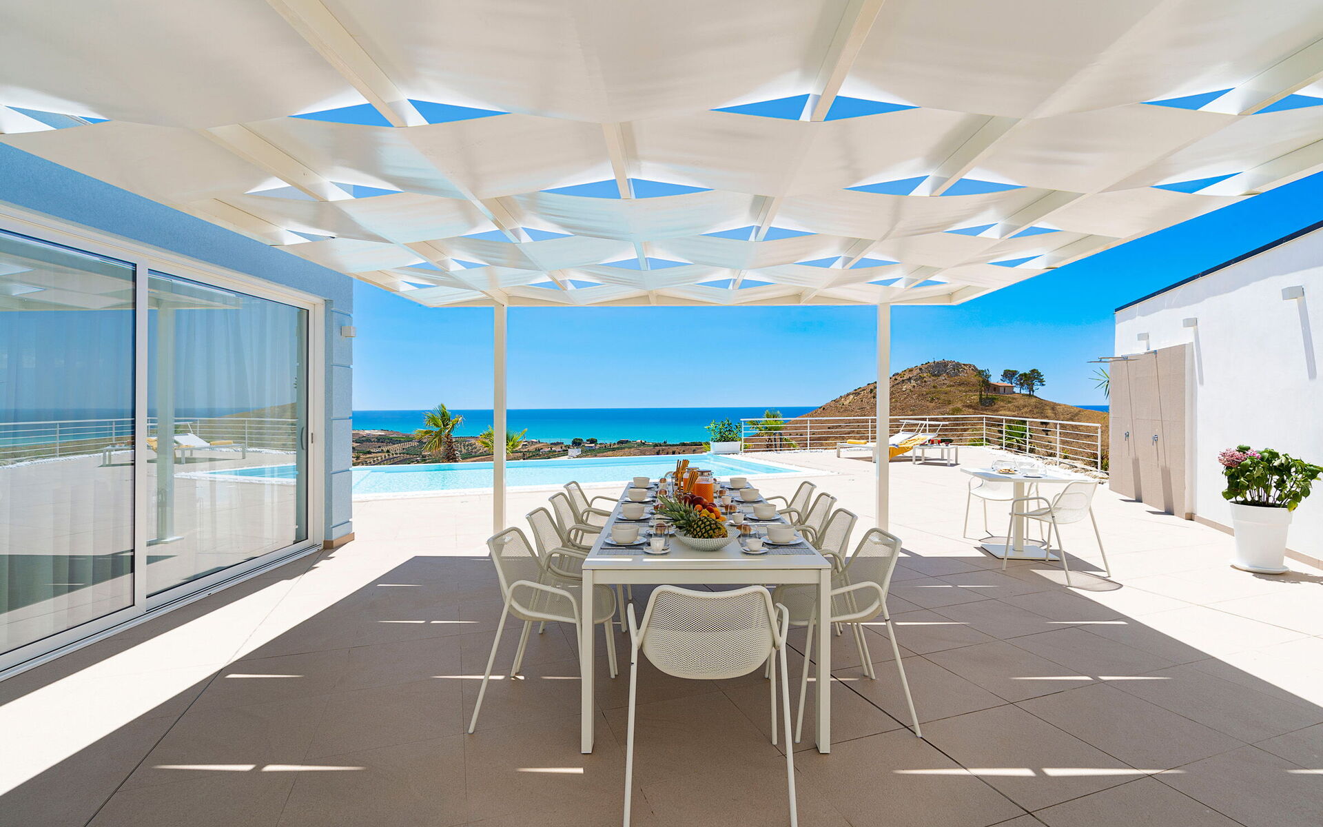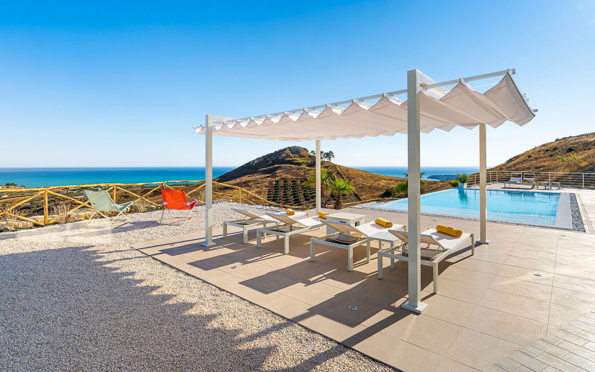 Villa Domizia is a charming and elegant residence located near the beautiful town of Agrigento, on the southern coast of Sicily. Surrounded by the vibrant colors and authentic scents of the Sicilian countryside, this wonderful property offers the perfect setting for a holiday dedicated to relaxation, comfort, and discovery. Its strategic location allows guests to easily reach the nature reserves of Torre Salsa and Foce del Fiume Platani, the sandy beaches of Bovo Marina and Eraclea Minoa, the spectacular white cliffs of Scala dei Turchi, as well as cultural landmarks such as the Valley of the Temples in Agrigento, Sciacca, and Selinunte. Villa Domizia enjoys a privileged position, just a few kilometers from the sea, offering magnificent views over the surrounding countryside. Outdoors, guests can unwind by the beautiful private swimming pool ( 5,0 mt x 11,00 mt, deep min 0,30 mt - max 1,70 mt), equipped with sun loungers — perfect for cooling off on warm summer days. A covered veranda features a comfortable al fresco dining area, ideal for enjoying relaxing meals surrounded by the peace and beauty of the Sicilian landscape.