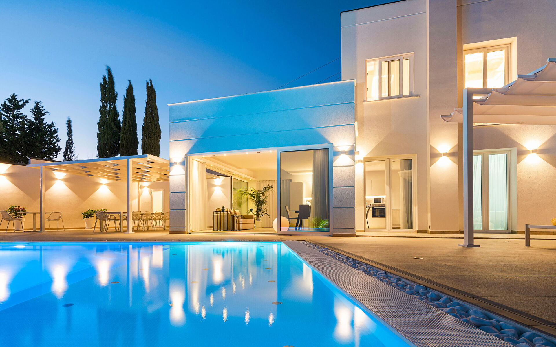 Property 3 km far from the sea, garden, private swimming pool 5,00 mt x 11 mt, deep min 0,30 mt – max 1,70 mt, equipped with sun loungers, umbrellas, barbecue, outdoor shower, a covered veranda features a comfortable al fresco dining area. Weekly linen change, air conditioning, heating, free Wi-Fi, TV, washer, iron, baby chair, sofa, dining table and chairs, fully equipped kitchen with: refrigerator and freezer, oven, dishwasher, microwave, espresso coffee machine, kettle, blender, induction hob, American coffee machine, toaster and a high chair for children.
