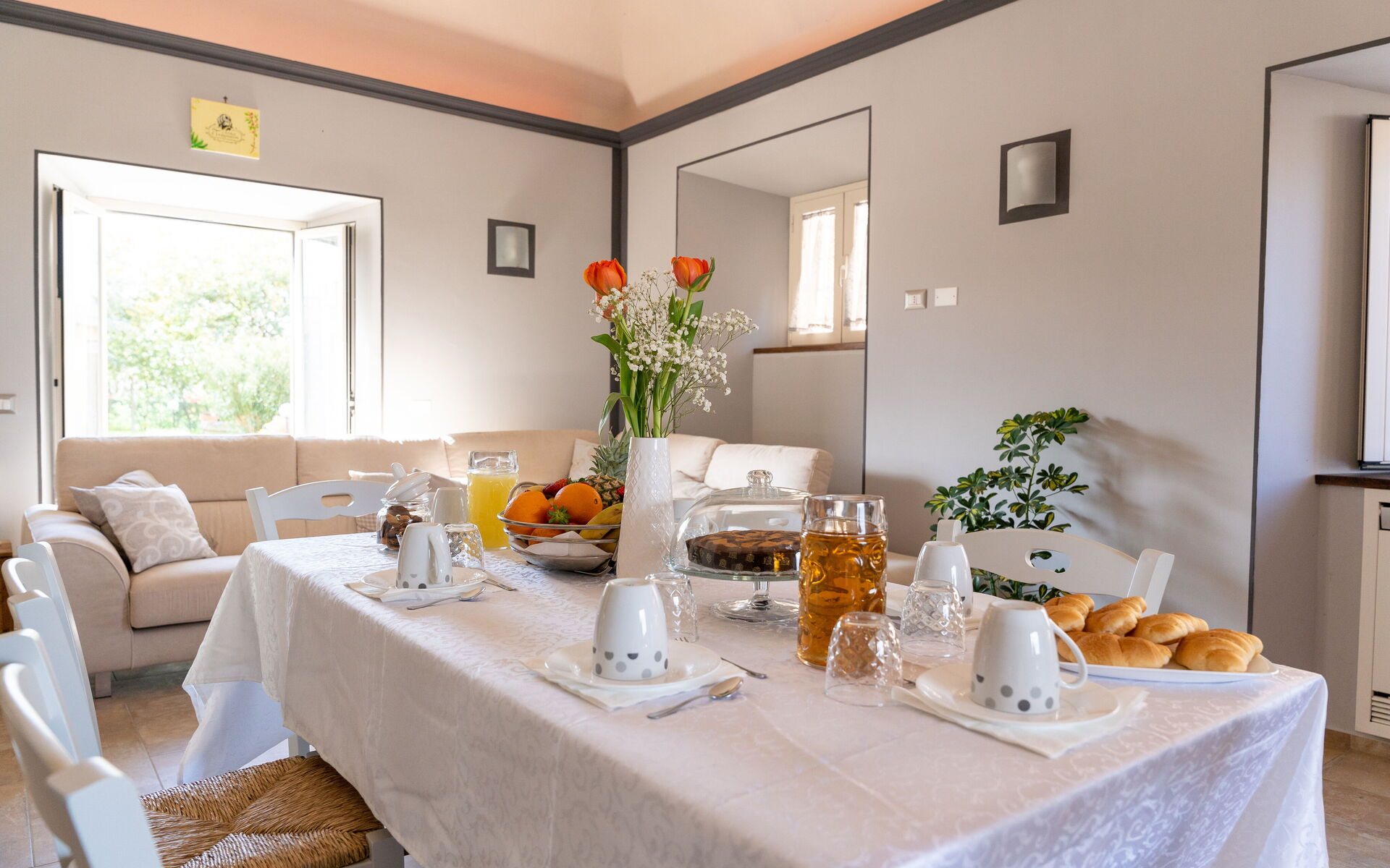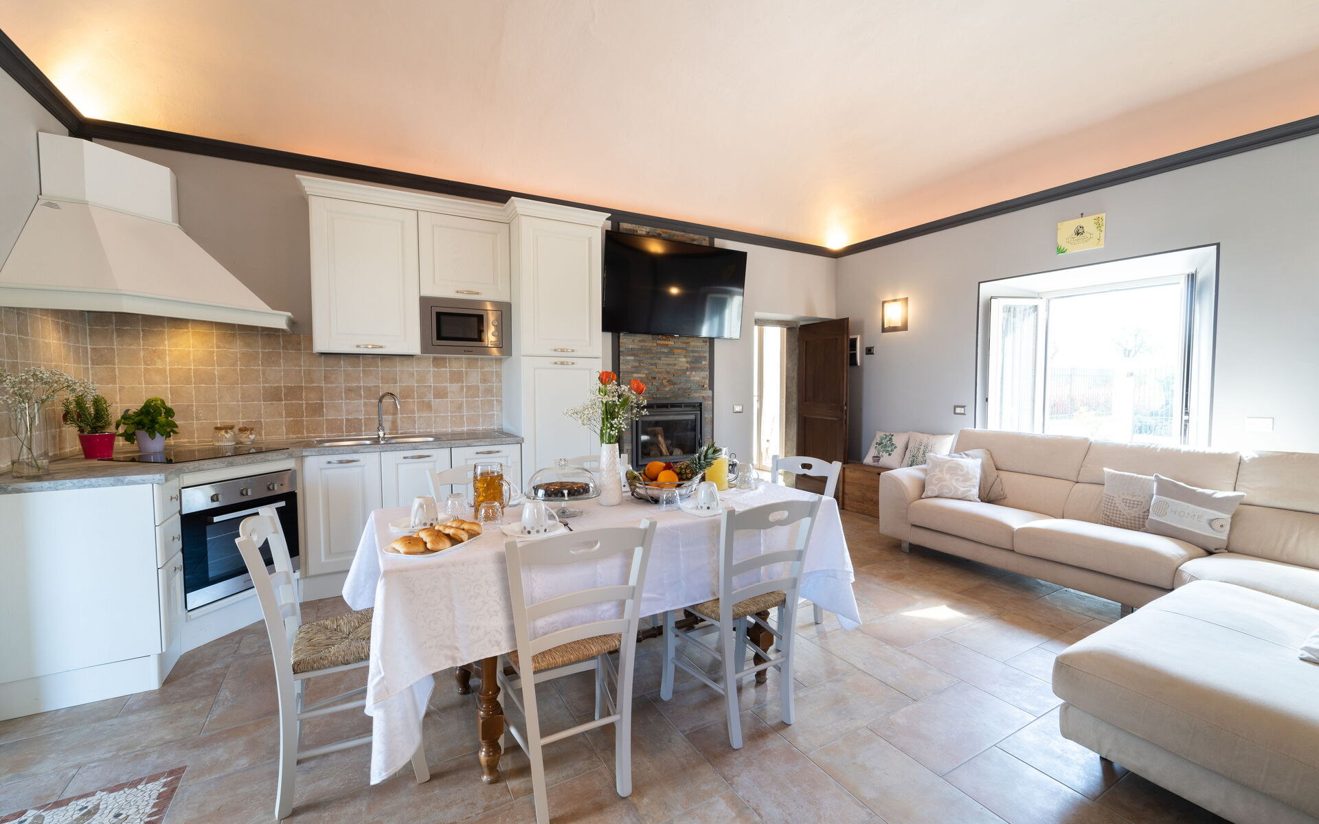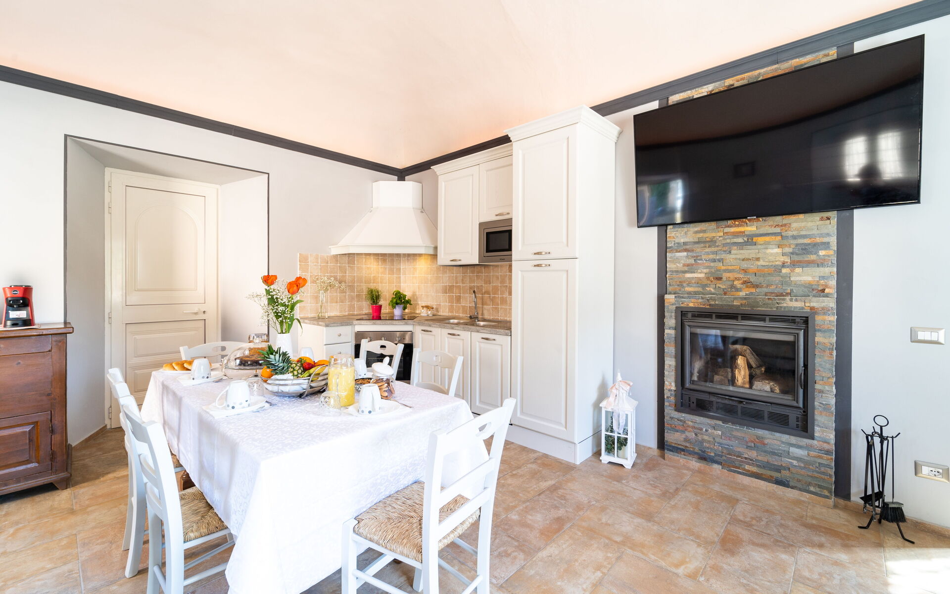 - Living room and kitchen area complete with Air Conditioning, Fireplace, Well Equipped Kitchen, Sofa, Oven, Freezer, Fridge, WiFi Internet, Dishwasher, Italian Coffee Machine, Microwave, Stove Top, Dining Table, Television, Toaster, Exit to the garden, Exit to the veranda