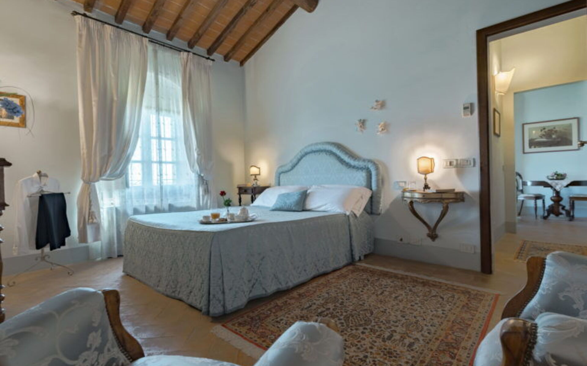 Die Innenräume der Villa Michelangelo sind geräumig (800 m²) und hell und zeichnen sich durch freiliegende Holzbalken und Terrakottaböden aus, die an den traditionellen toskanischen Stil erinnern, der auf der ganzen Welt bekannt ist. Die Villa verfügt über 9 Schlafzimmer und 11 Badezimmer und bietet Platz für bis zu 18 Personen. Jedes Zimmer verfügt über Klimaanlage. Es erstreckt sich über 3 Etagen und ist intern über Treppen und einen Aufzug miteinander verbunden. Das Erdgeschoss besteht aus einem bequemen Eingang und einem geräumigen Wohnzimmer mit Kamin, Bar und Essbereich. Vom Wohnbereich aus hat man direkten Zugang zur professionellen, modernen, voll ausgestatteten Küche und zum beheizten Innenpool. (3x5 Meter, feste Tiefe 1,10 Meter) mit Gegenstromsystem und Hydromassage, Sauna und Bad mit Dusche. Der Wellnessbereich ist wöchentlich kostenpflichtig und muss im Voraus reserviert werden. Ein Schlafzimmer mit Doppelbett und eigenem Bad mit eigener Dusche, ein Wäschebereich (Waschmaschine, Trockner, Bügeleisen und Bügelbrett) und ein Service-Badezimmer vervollständigen das Erdgeschoss. Im ersten Stock finden Sie 2 wunderschöne Suiten, die jeweils aus einem Schlafzimmer mit Doppelbett, einem Wohnbereich mit Kamin und einem eigenen Bad mit Whirlpool bestehen. Immer im ersten Stock finden Sie weitere 5 Doppelzimmer mit eigenem Bad mit Dusche. Im zweiten Stock, der Mansarde, befindet sich ein schönes Schlafzimmer mit Doppelbett und eigenem Bad mit Dusche.