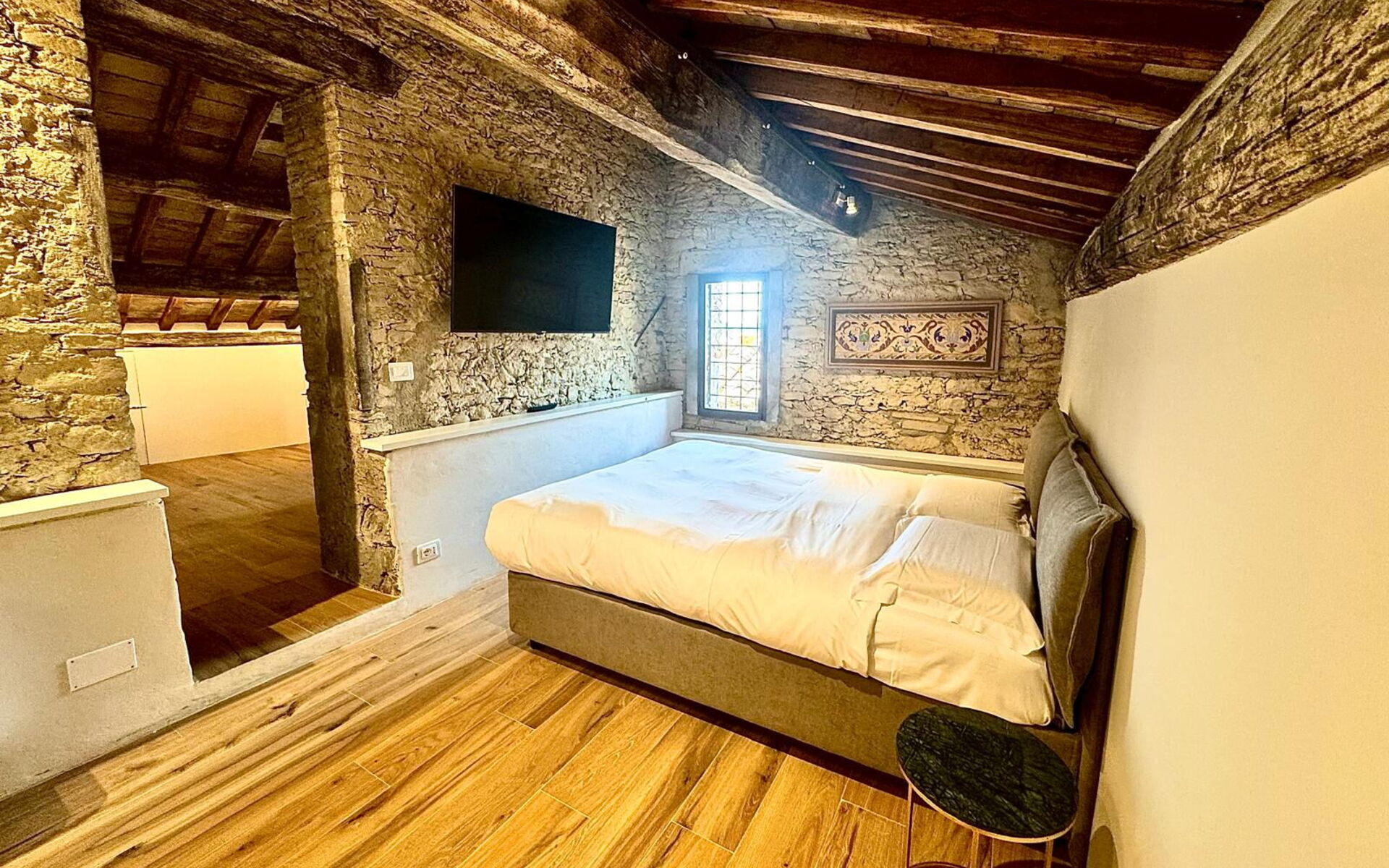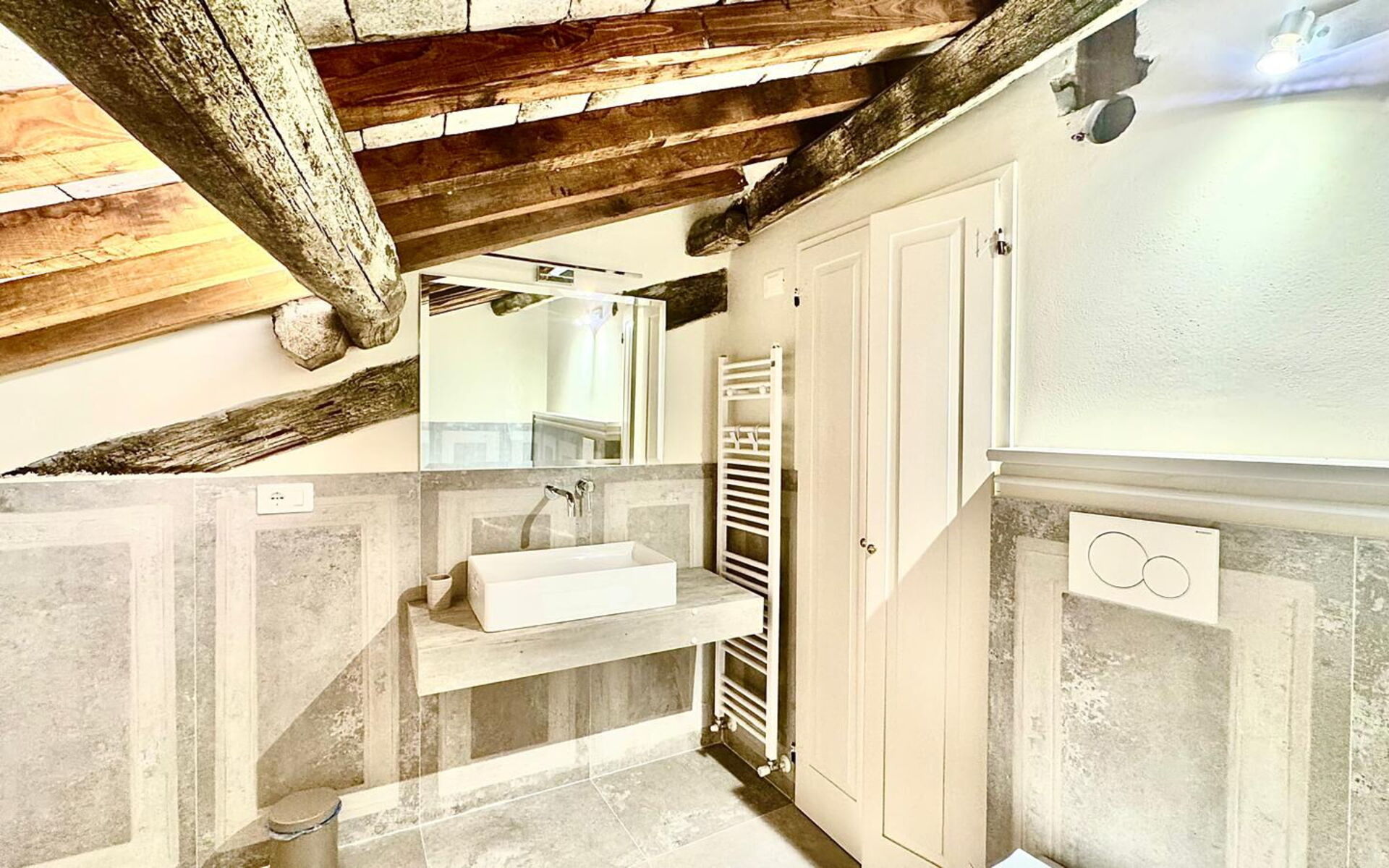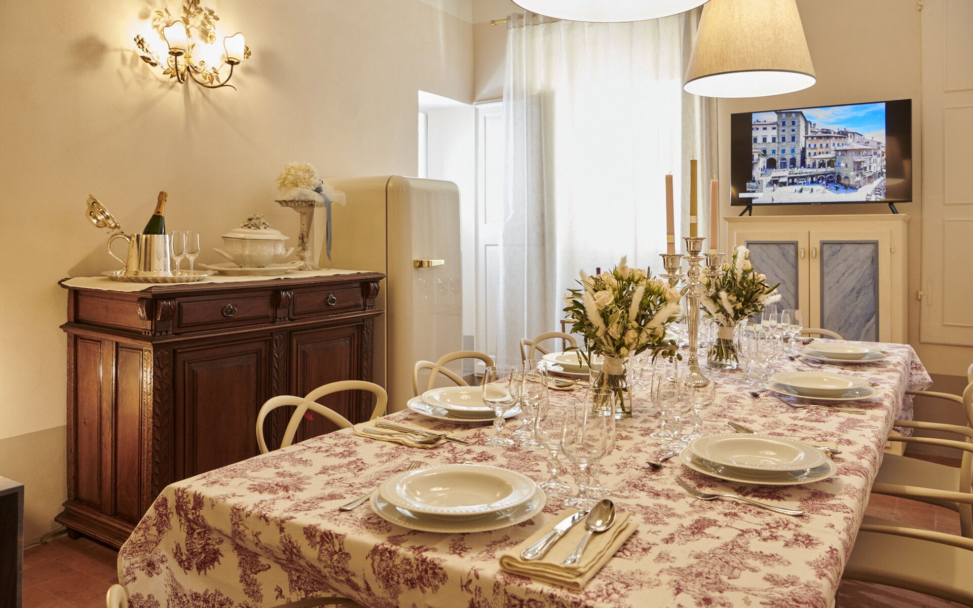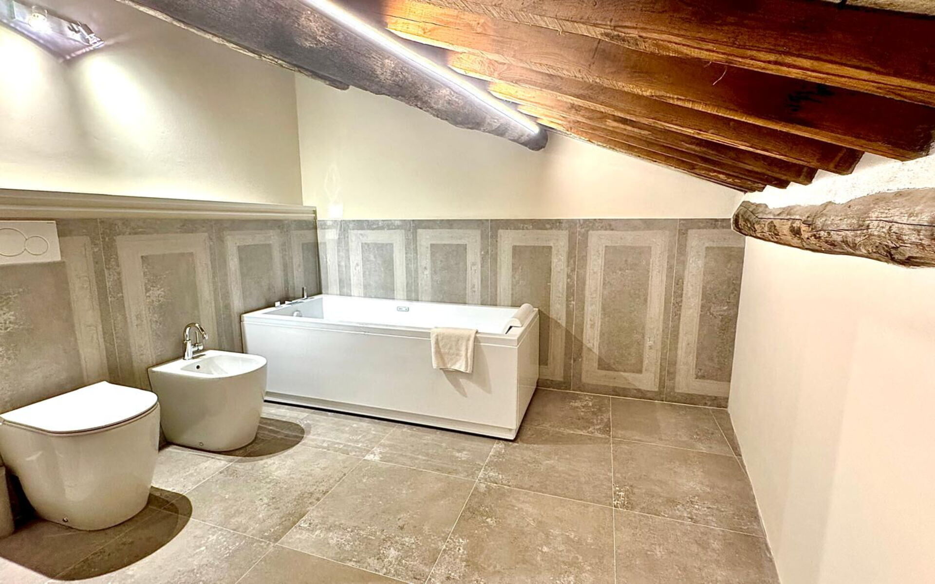 The apartment is about 125 square meters, on 2 floors and can comfortably accommodate up to 8 people. It is characterized by an elegant and refined design, with great attention to detail and an eye to the conservation of the historical details of the structure. The frescoed walls, the original terracotta floors and the exposed wooden beams combine to create a refined and relaxing environment, ideal for both short and long stays.