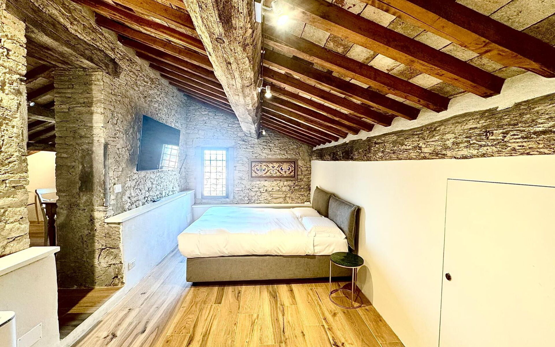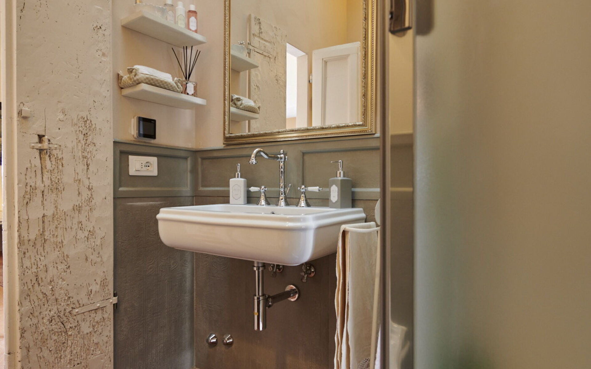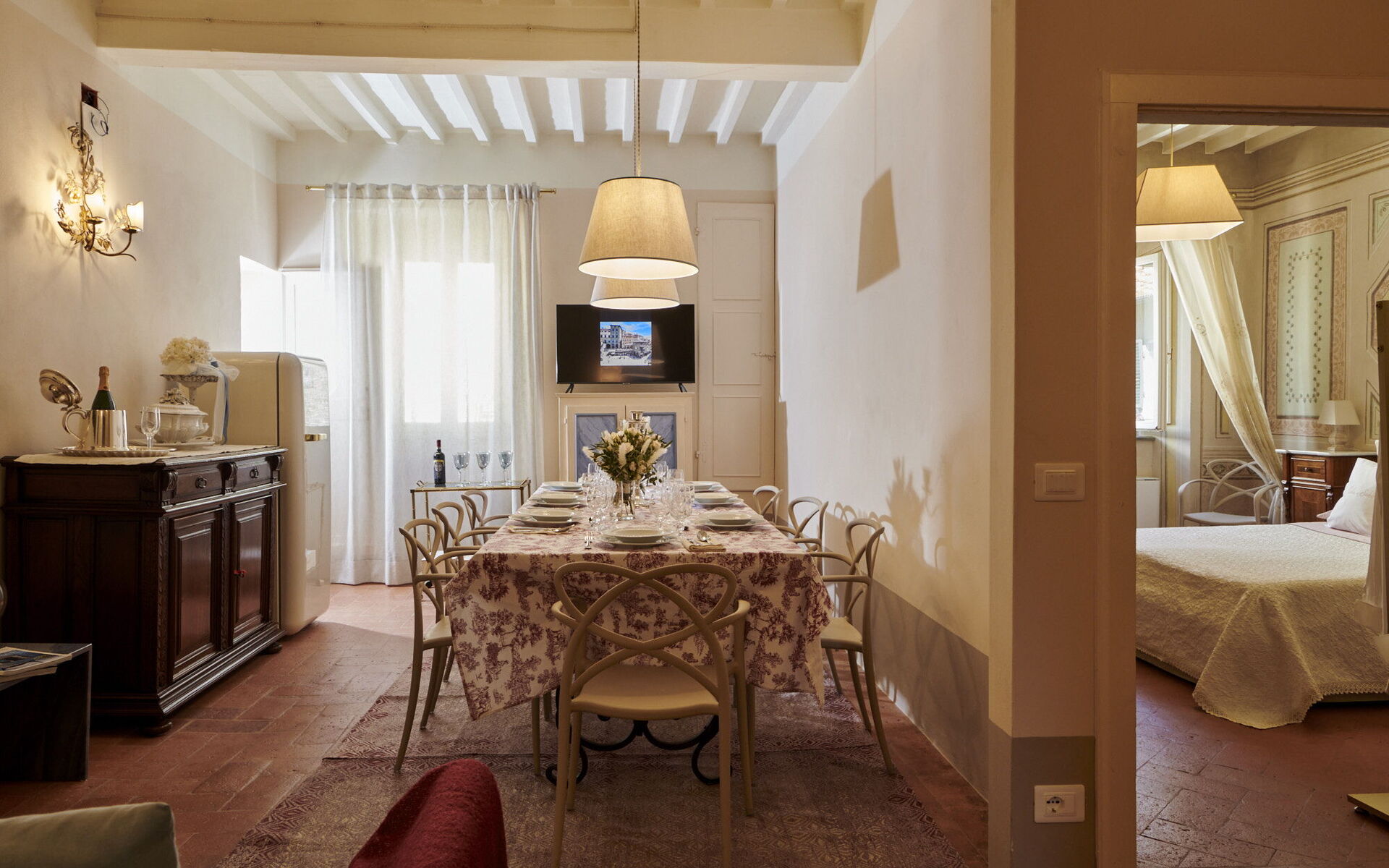 The apartment is about 125 square meters, on 2 floors and can comfortably accommodate up to 8 people. It is characterized by an elegant and refined design, with great attention to detail and an eye to the conservation of the historical details of the structure. The frescoed walls, the original terracotta floors and the exposed wooden beams combine to create a refined and relaxing environment, ideal for both short and long stays.