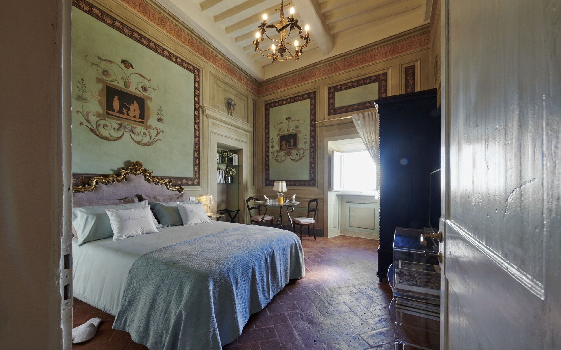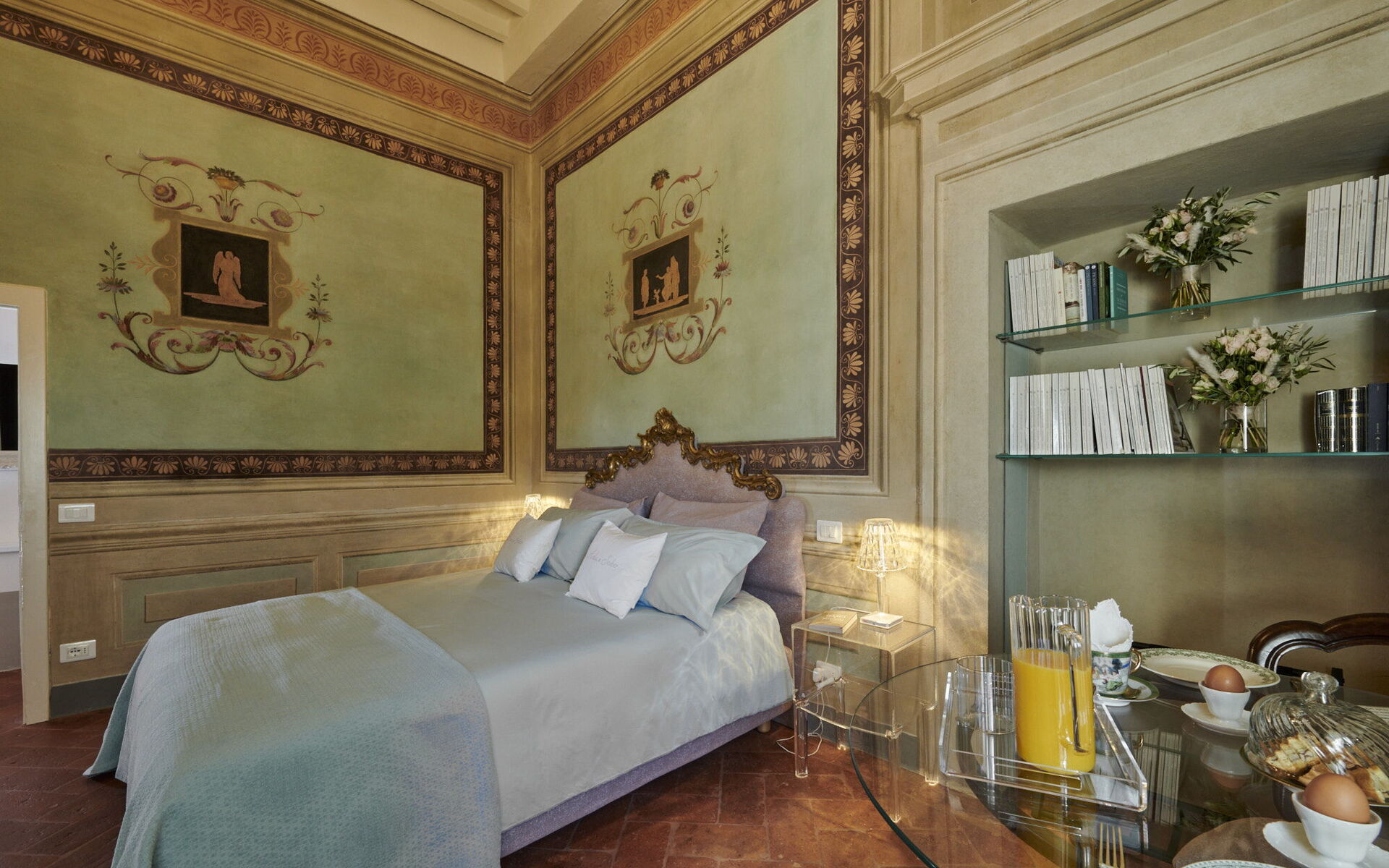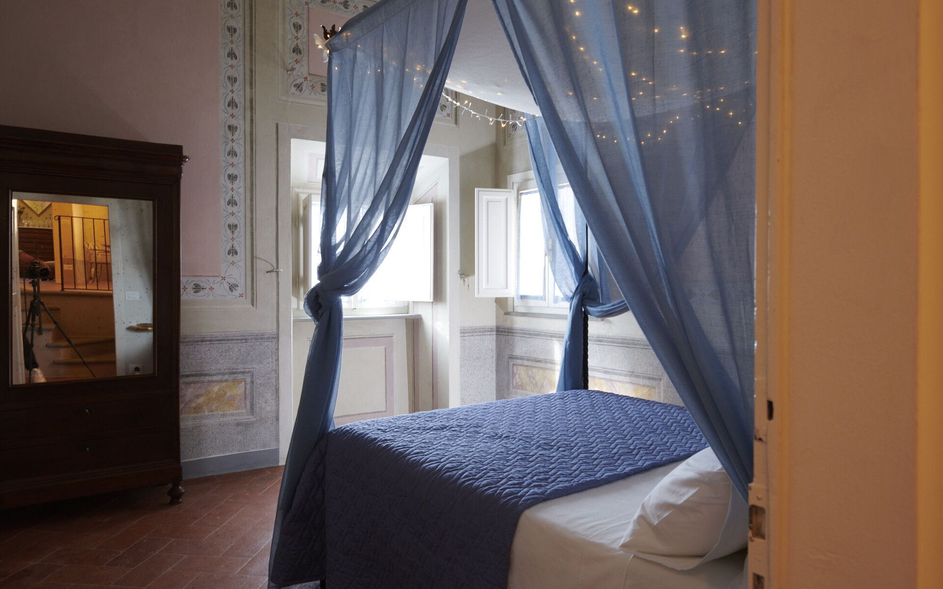 Then we find the 4 double bedrooms, all with their own personality: the first is the "Room of the amphorae", a beautiful 19th-century neoclassical room decorated with scenes from the classical myth and overlooking the city. The second is the "Room of the bees" characterized by decorative panels embellished with a frame of stylized bees and two beautiful windows that offer two unforgettable points of view over the city and the landscape. The third is the "Garden Room" decorated with geometric and floral motifs and characterized by the view on the palace garden. On the same floor there are Two bathrooms with shower. The fourth bedroom is on the loft, it has a studio and a bathroom wtih bathtub.