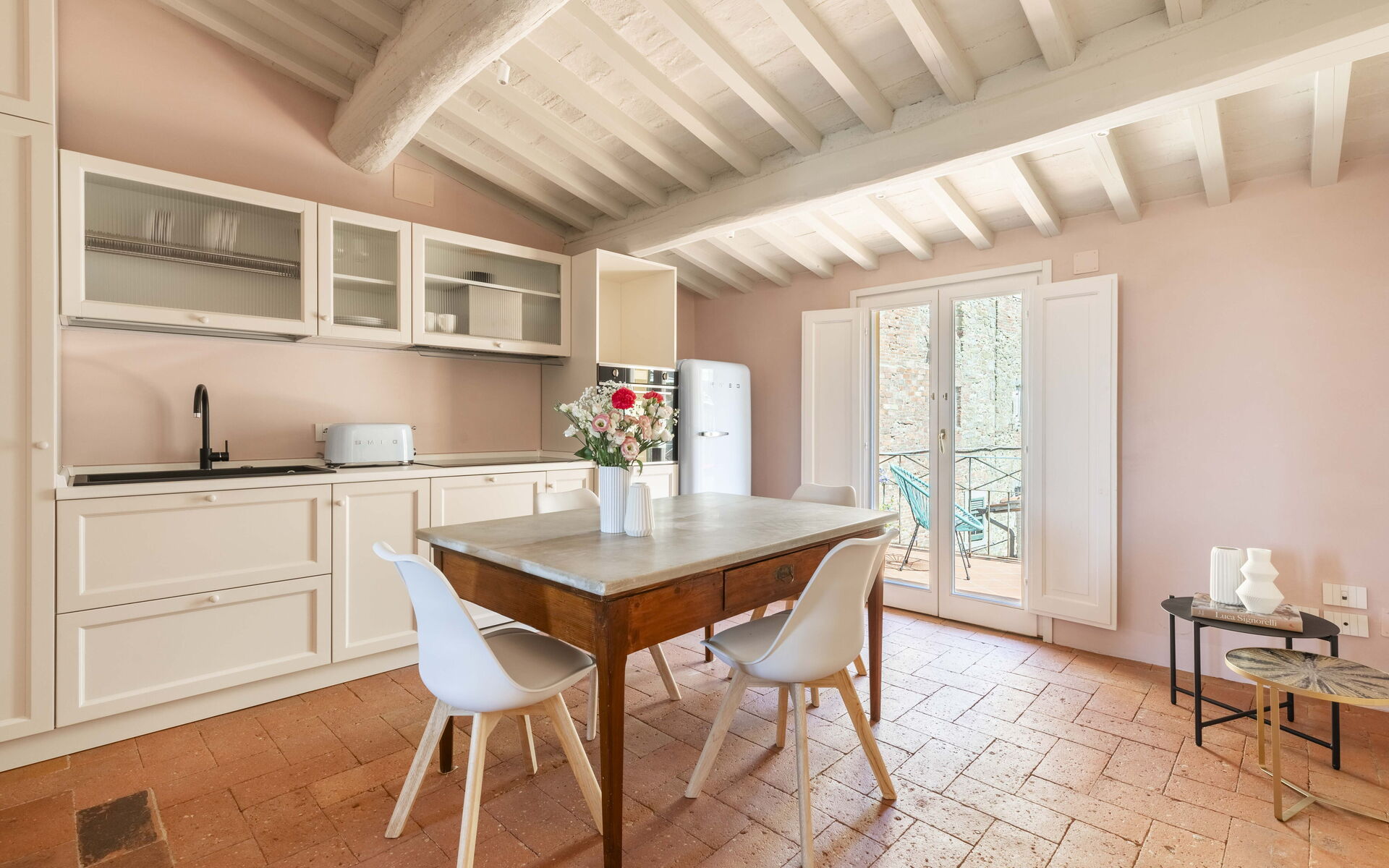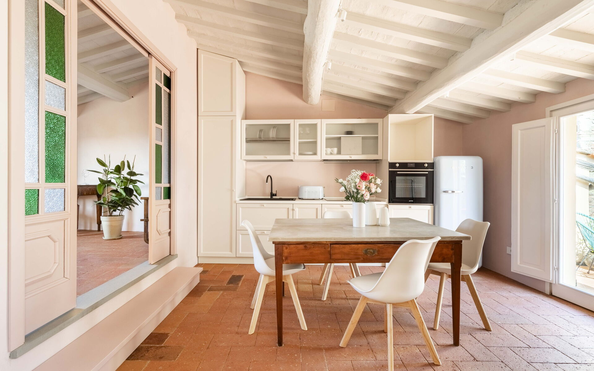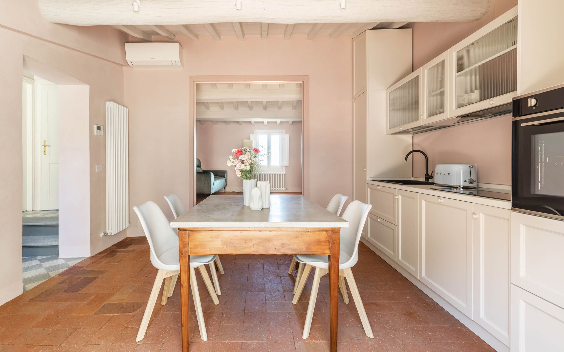 - Kitchen with a dining table, Smart TV and fully equipped with: toaster, moka, oven, microwave, induction cooktop, fridge and freezer.