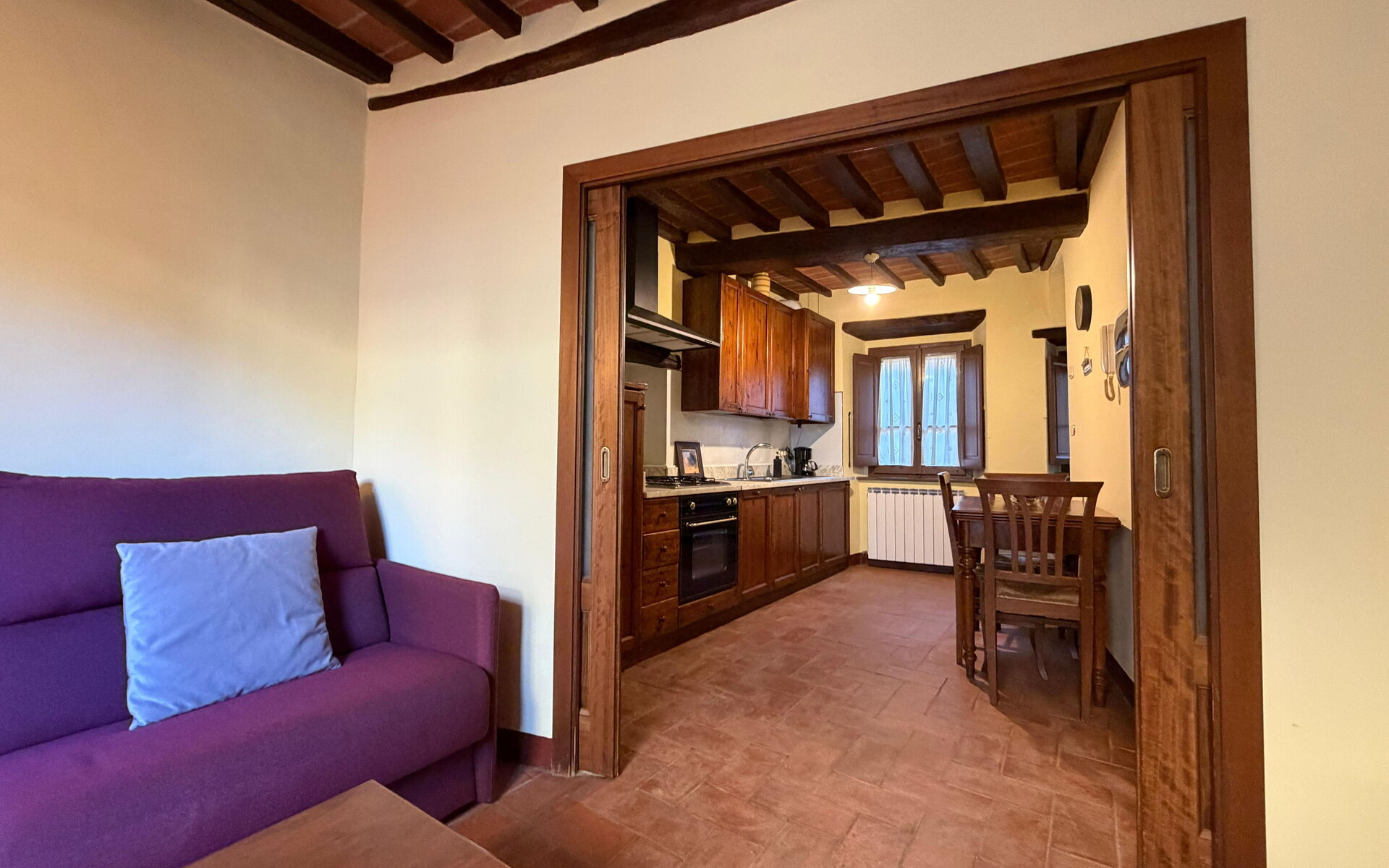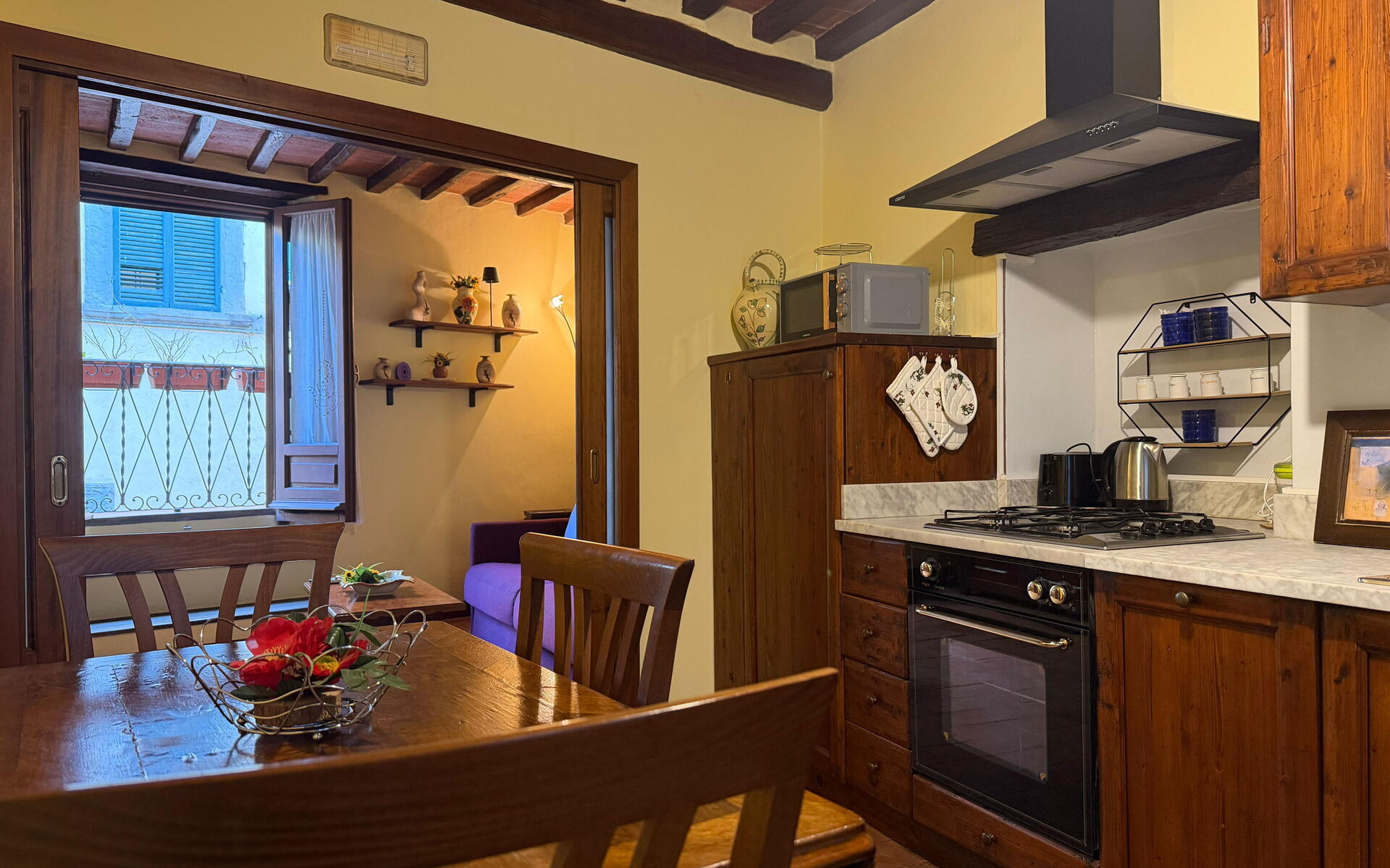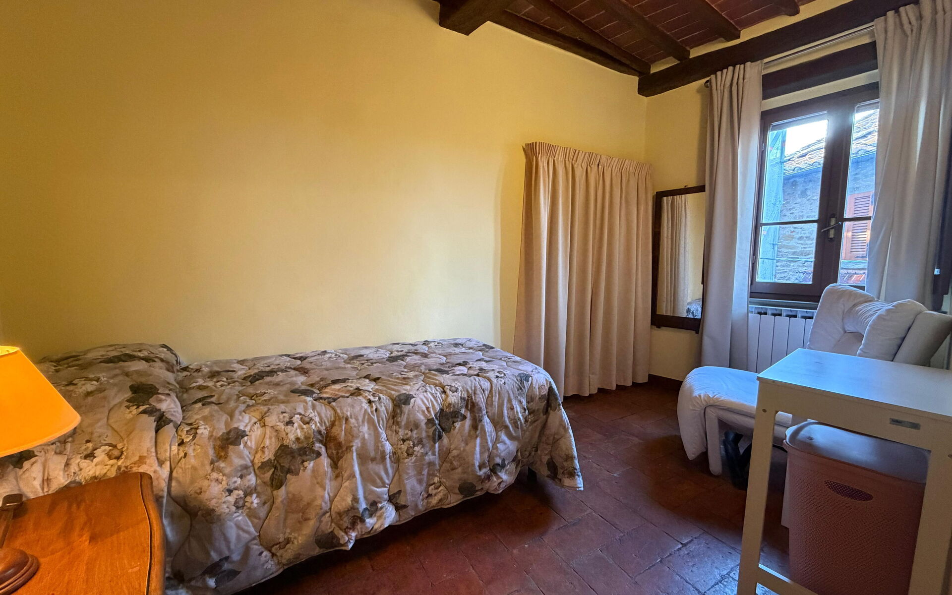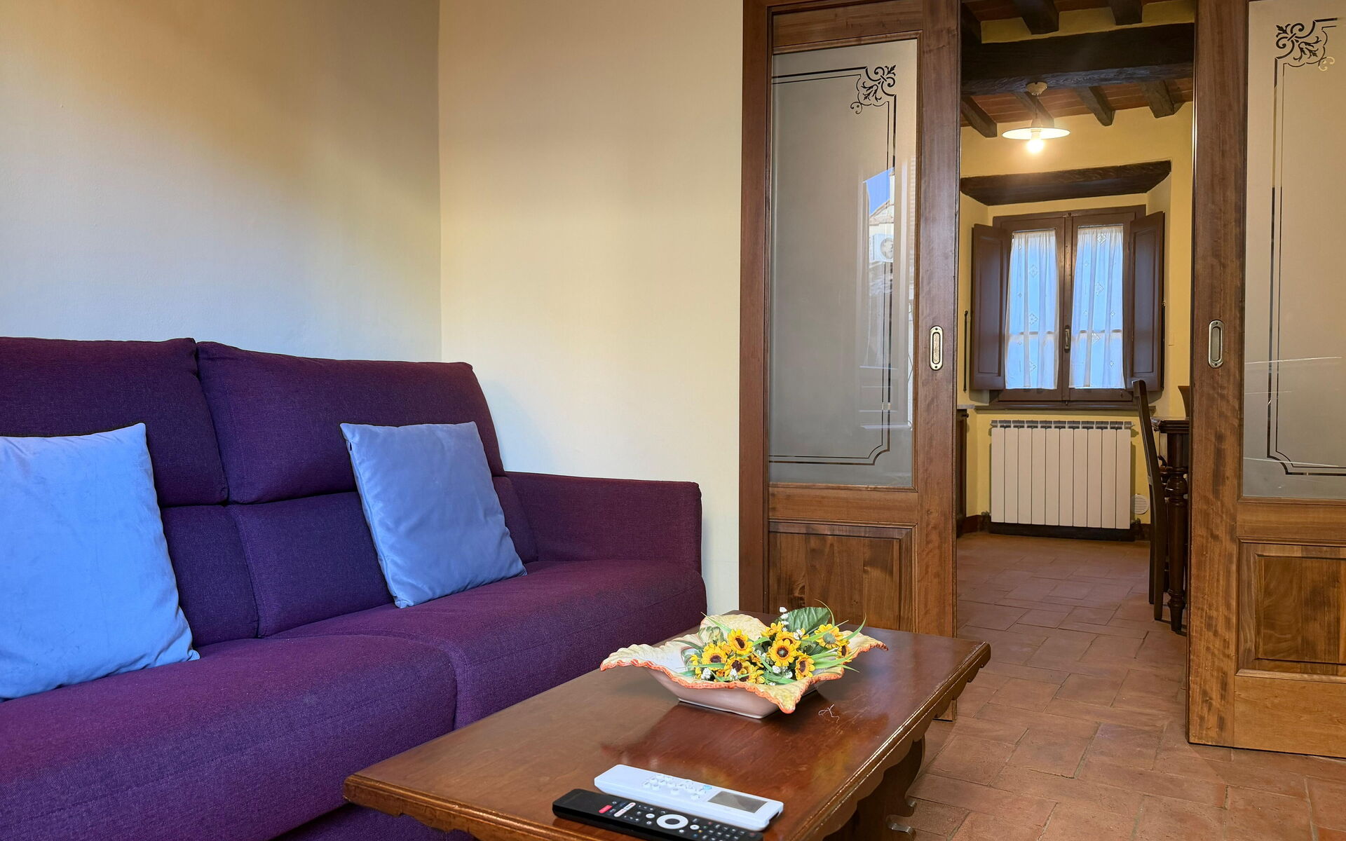 On the first floor there is a fully equipped kitchen with all the necessary utensils, appliances and stove to prepare your favorite dishes. The kitchen is separated from the large living room by sliding doors. In the living room there is a comfortable sofa bed and a small terrace with a pleasant panoramic view that gives you a particular point of view of Cortona.