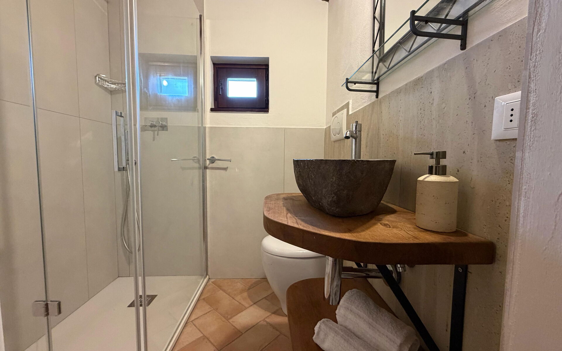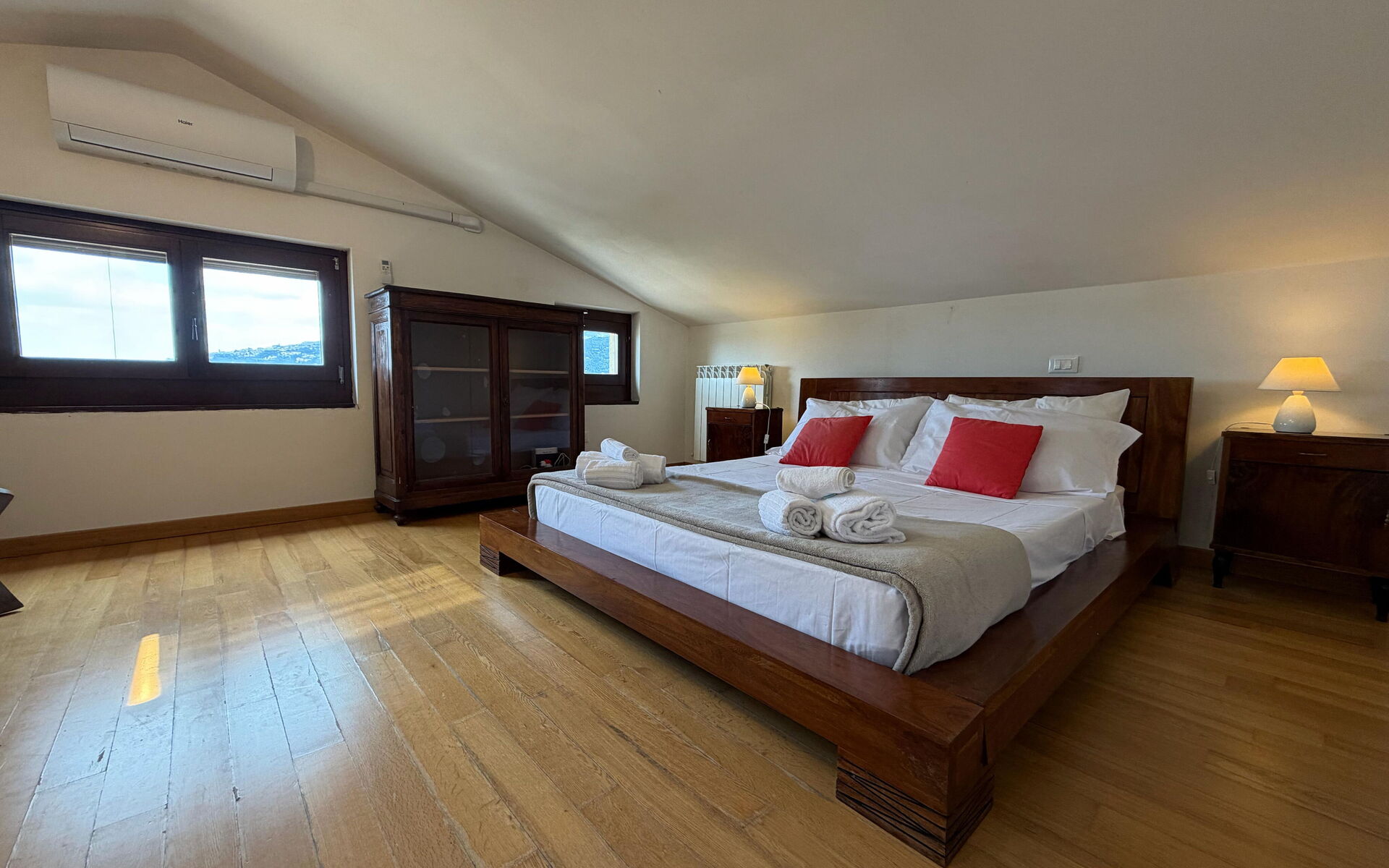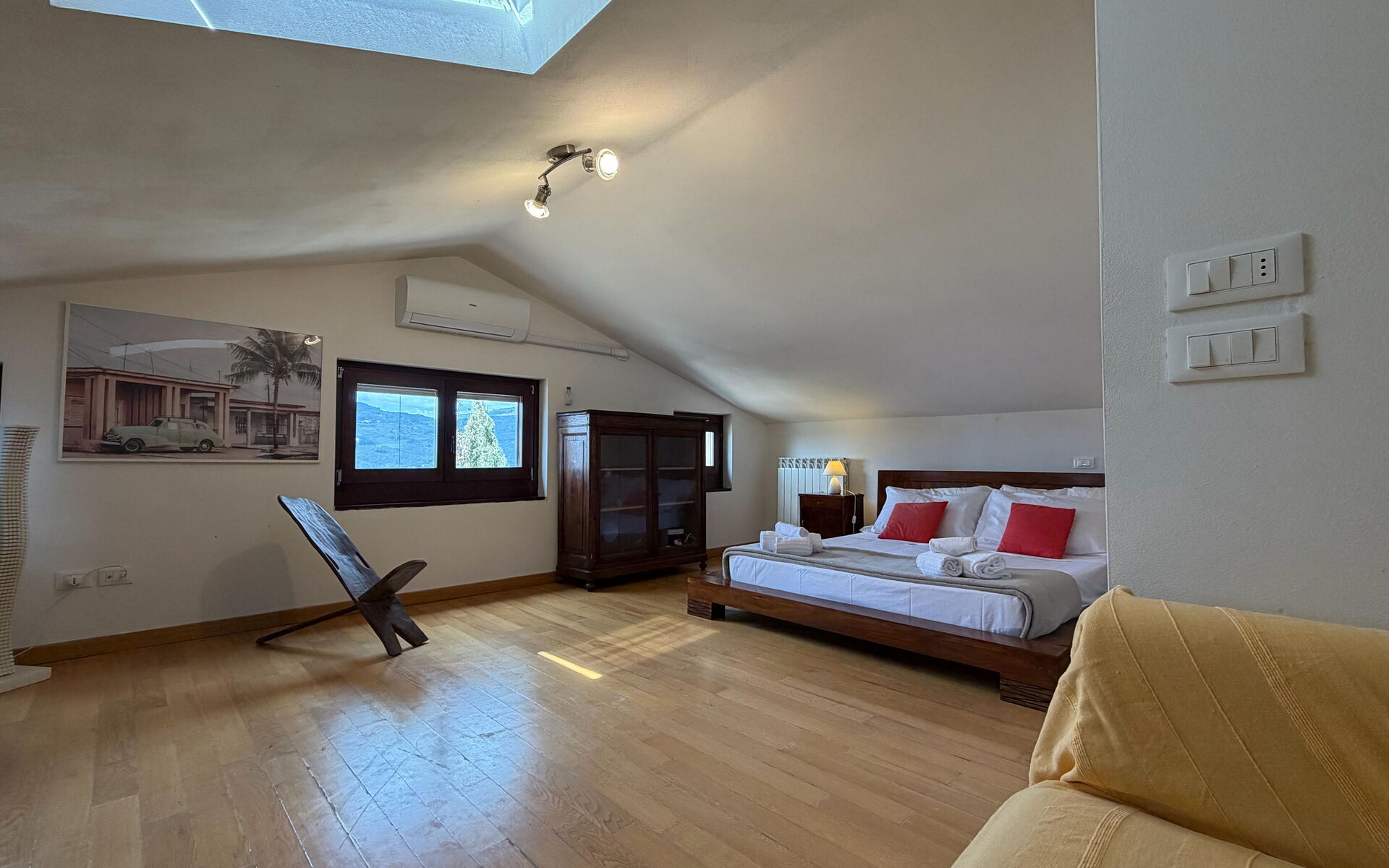Durch eine interne Treppe erreicht man das letzte Zimmer, ein großer Dachboden mit Doppelbett und einem Doppelschlafsofa (auf Anfrage gegen Aufpreis). Das Badezimmer ist en-suite und verfügt über eine Dusche.