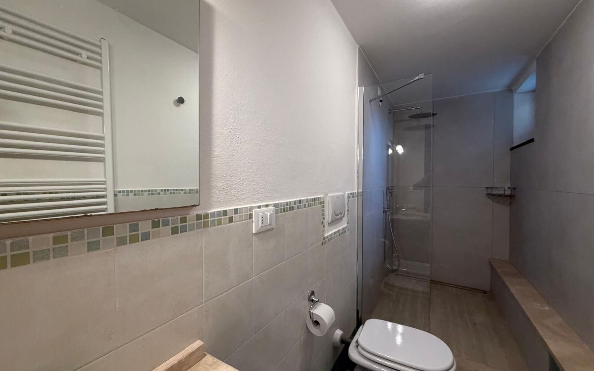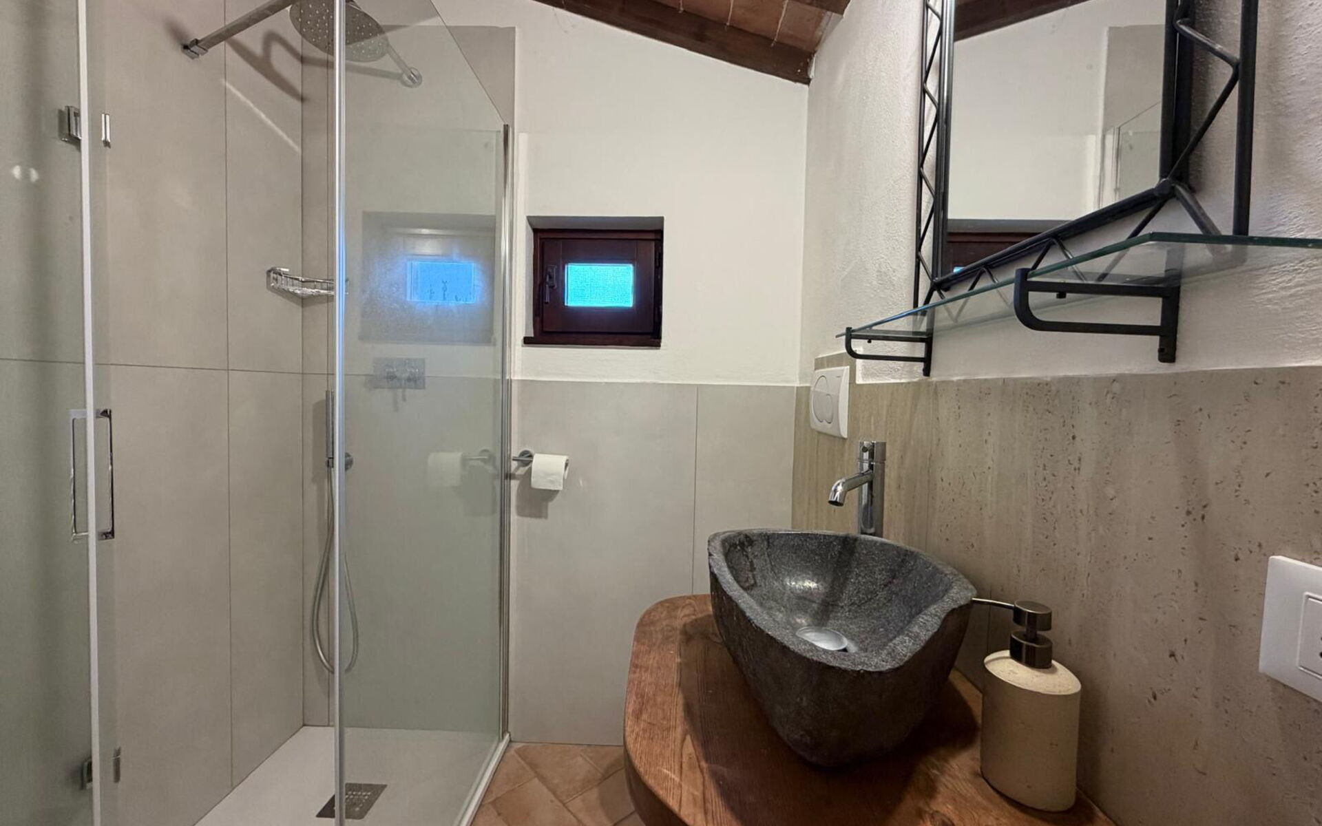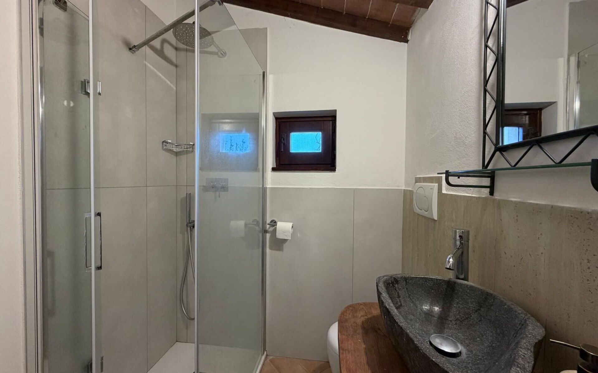 Der erste Stock ist über eine Innentreppe zugänglich; hier befindet sich der Schlafbereich bestehend aus einem Schlafzimmer mit Doppelbett und ein Badezimmer mit Dusche.