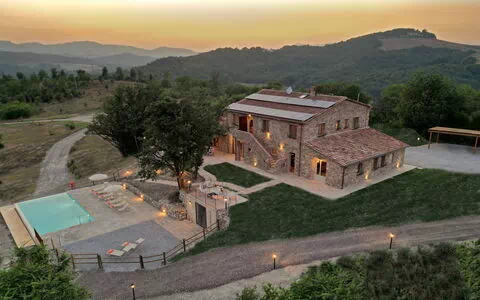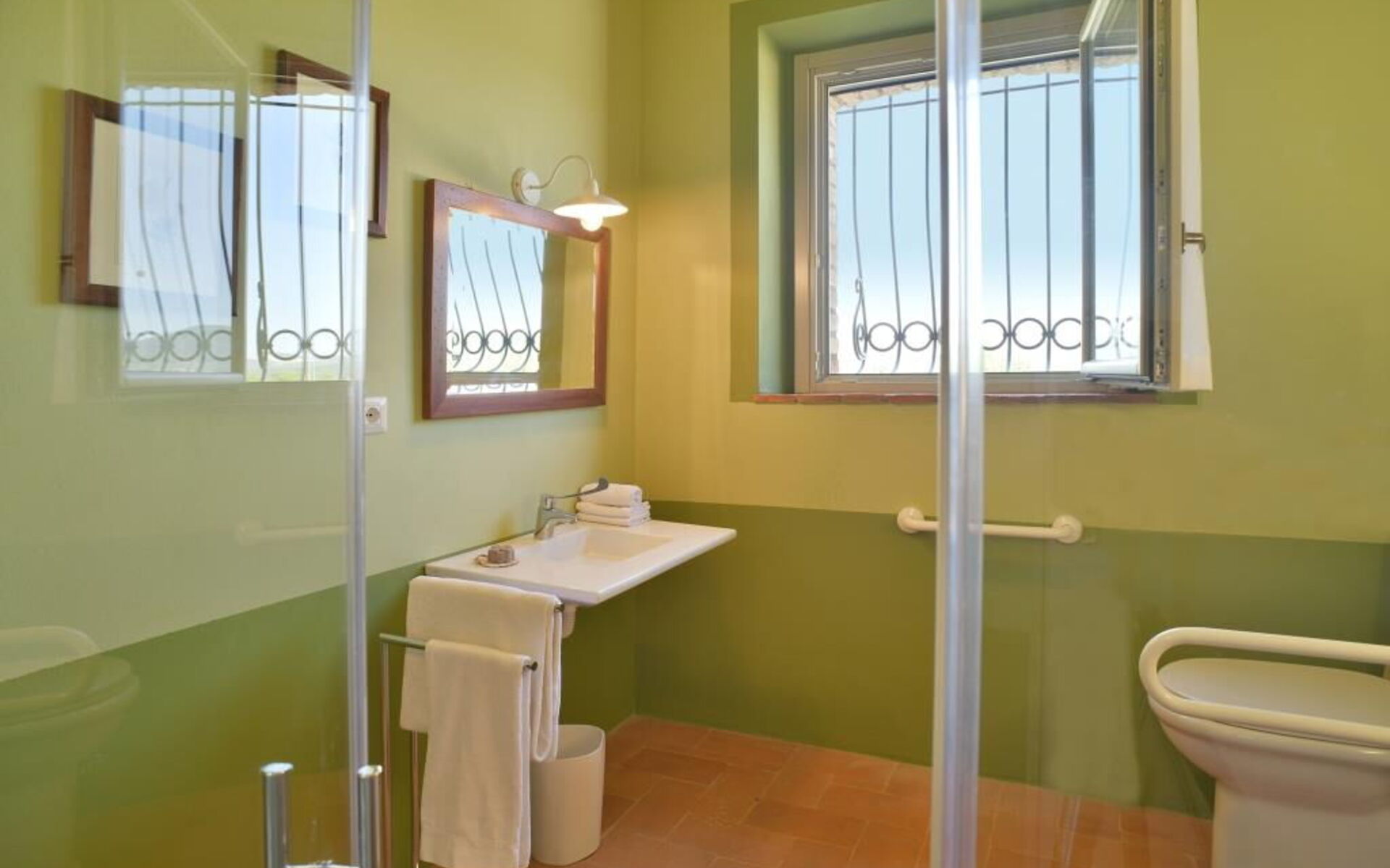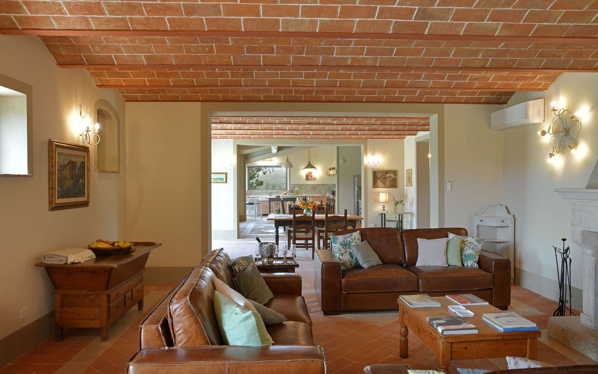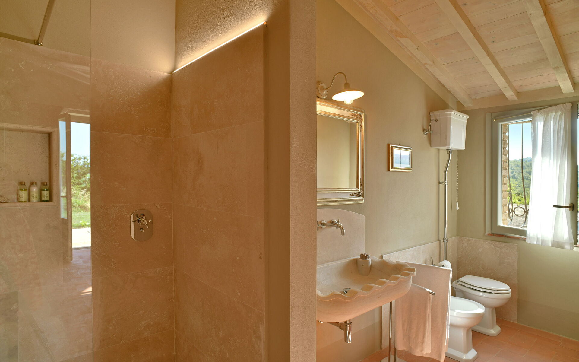 Villa il Noccioleto can easily host up to 12 guests, and it spreads on two levels. On the ground floor, the villa opens into a wide dining room provided with dining table with chairs. On the right of the dining room, there is the living room composed by three sofas, a beautiful fireplace and tv. Going further the dining room, you have the access to the kitchen, fully equipped and provided with: stove, fridge and freezer, toaster, blender, oven, Espresso coffee machine, dishwasher. The ground floor is completed by three double bedrooms with en-suite bathroom and a toilet. Going up through a stair that internally links the two levels, you access to the first floor where there is, a living room composed by a sofa-bed, another sofa and a tv, two double bedrooms both with en-suite bathroom, and a bedroom with single beds with en-suite bathroom.