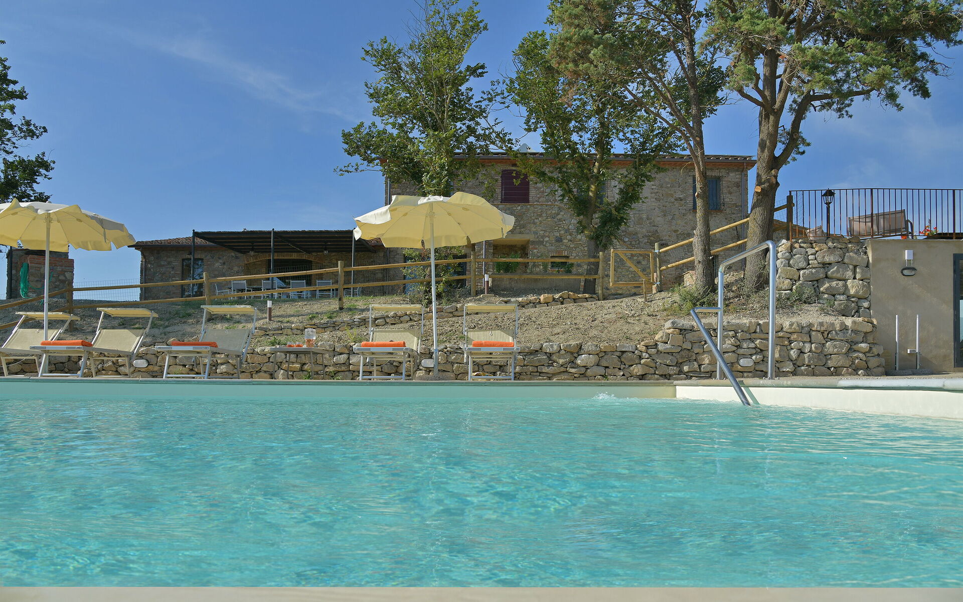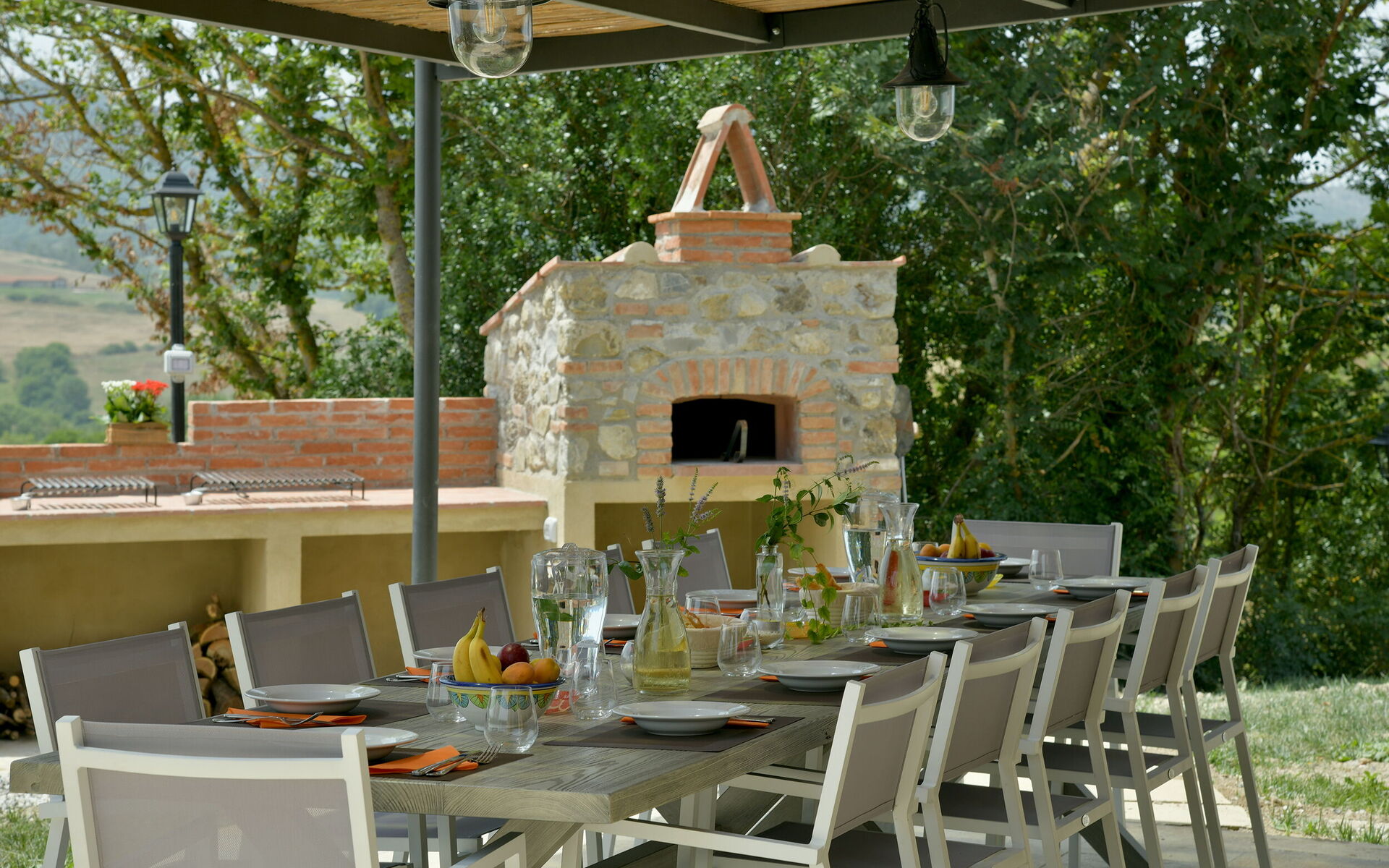 Villa il Noccioleto is a beautiful villa with private swimming pool immersed in the green rolling Tuscan hills of Montecatini in Val di Cecina. The villa is the perfect place for both who are looking for a holiday under the sign of relax, and for those who want to explore all the beauties of the surrounding area. The villa rises on the top of the hill, South-exposed, and it disposes of a breathtaking view that goes from the Castello di Querceto, to the peculiar town of Sassa, places that characterized these boarder areas between the Val di Cecina and the Val di Cornia. The sea is few kilometres distant from the villas, about 20 km, and it gives to the area a mild weather and a light breeze even during the hottest days. Villa il Noccioleto is immersed inside a stunning and well-kept garden, full of many varieties of local plants. The name of the villa comes from the cultivation of hazelnuts, that is produced in one part of the green area that surrounds the property. In front of the villa there is the swimming pool (10mtx5mt with fixed depth of 140 mt), perfectly sun-exposed and complete with sun decks, sun umbrellas, outdoor shower, perfect to relax and refresh during the hottest summer days. The outside of the villa is completed by a comfortable and practical barbecue area, complete also of a veranda with dining table with chairs, where you can cook and taste your favourite dishes outside in company of your friends and family. Nearby the pool there is also a fitness area, complete with gym equipment.