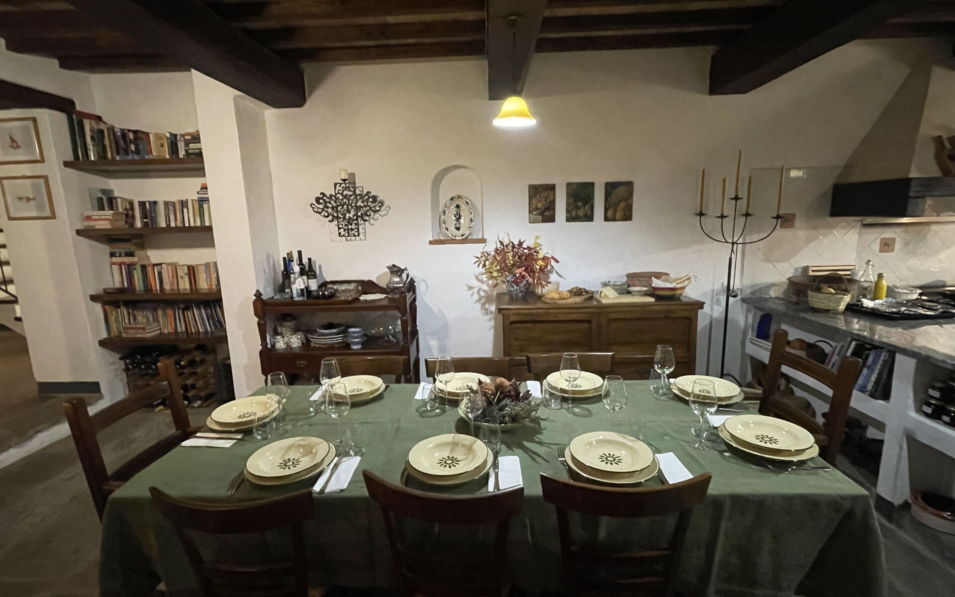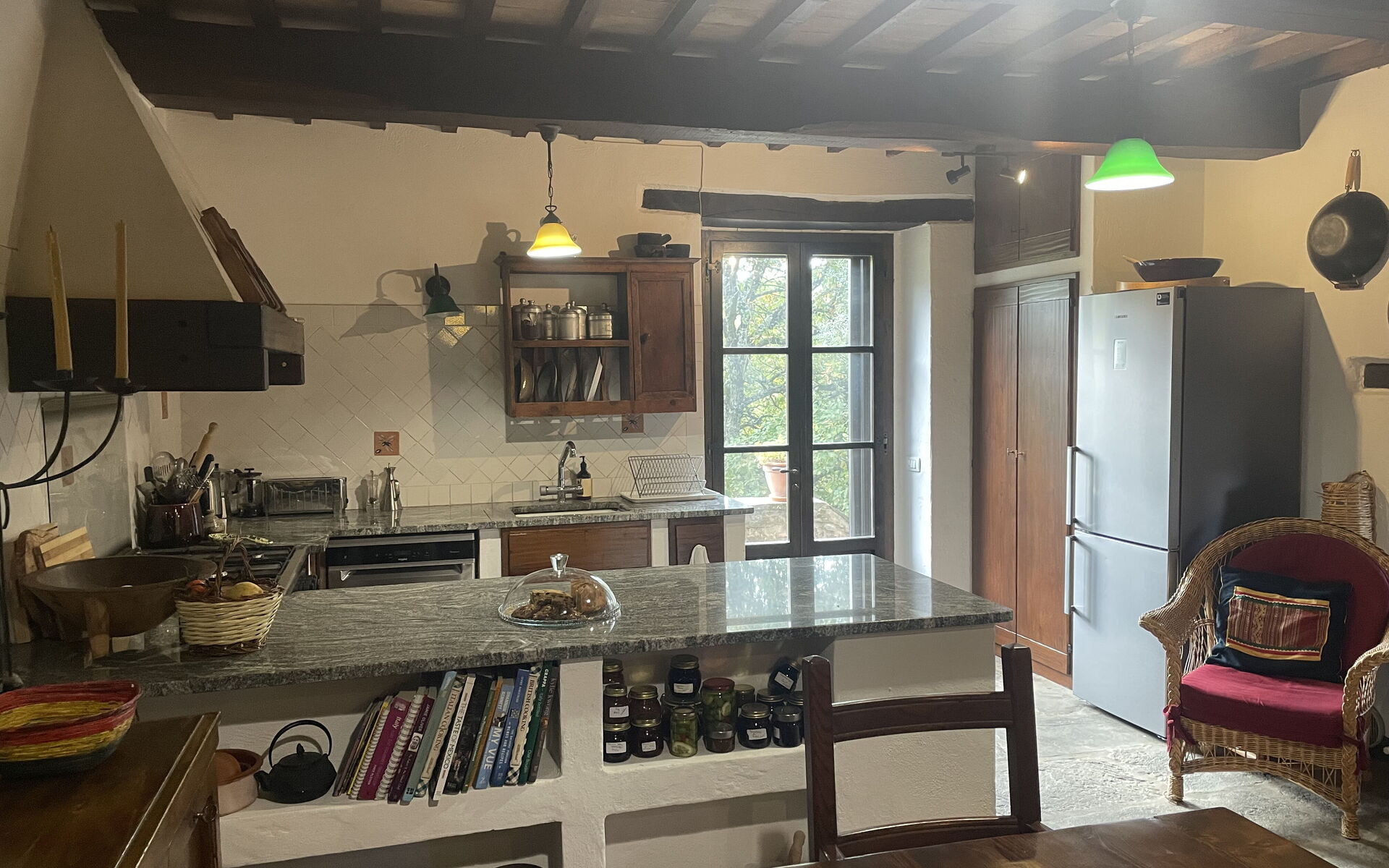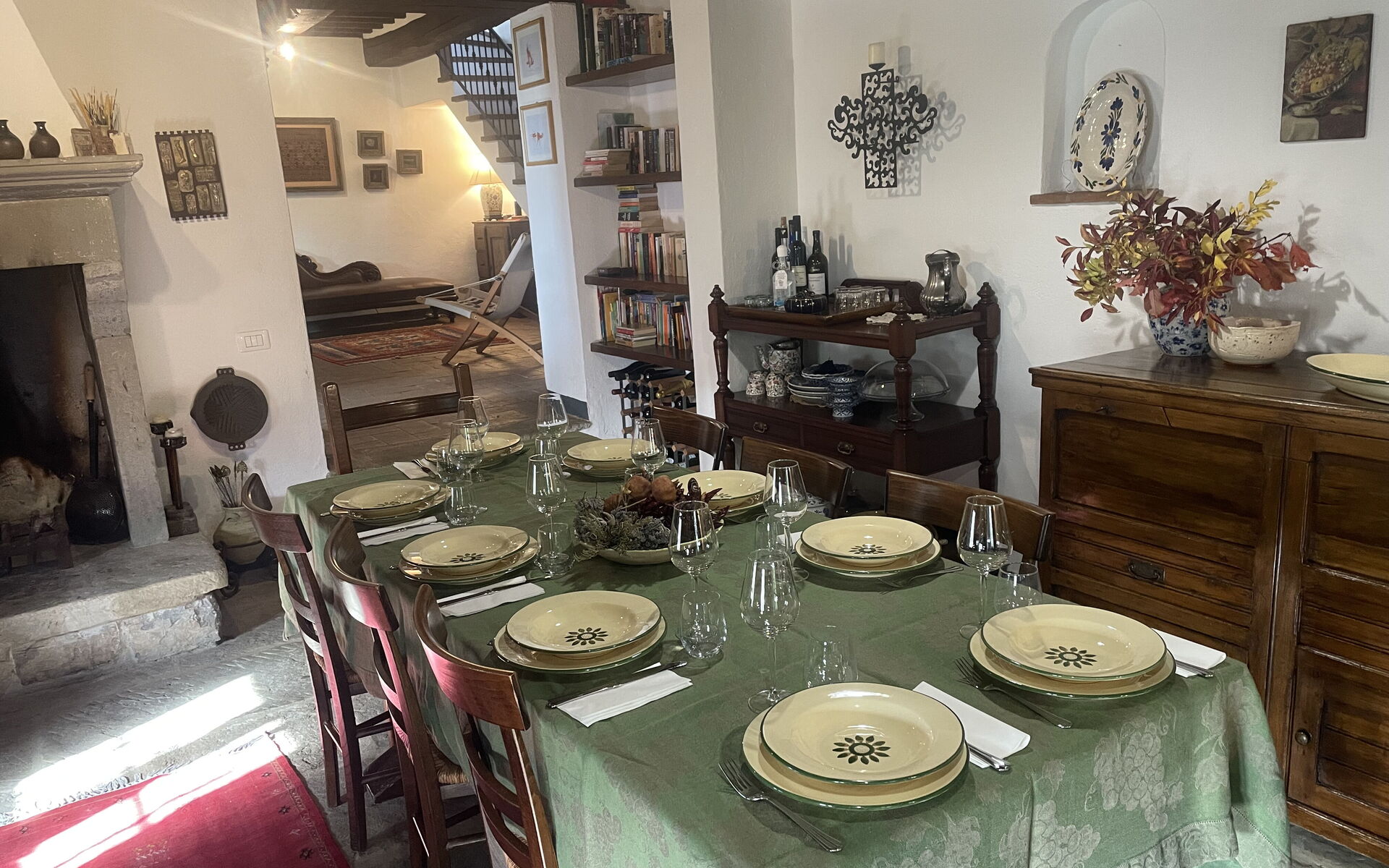 - Kitchen and Dining Room with a large rustic Tuscan-style wooden table, a 14th-century original fireplace, and access to a shaded stone courtyard furnished for outdoor dining. The kitchen is fully equipped with an oven, hob, fridge with freezer, dishwasher, high-quality cookware, microwave, toaster, coffee moka and utensils