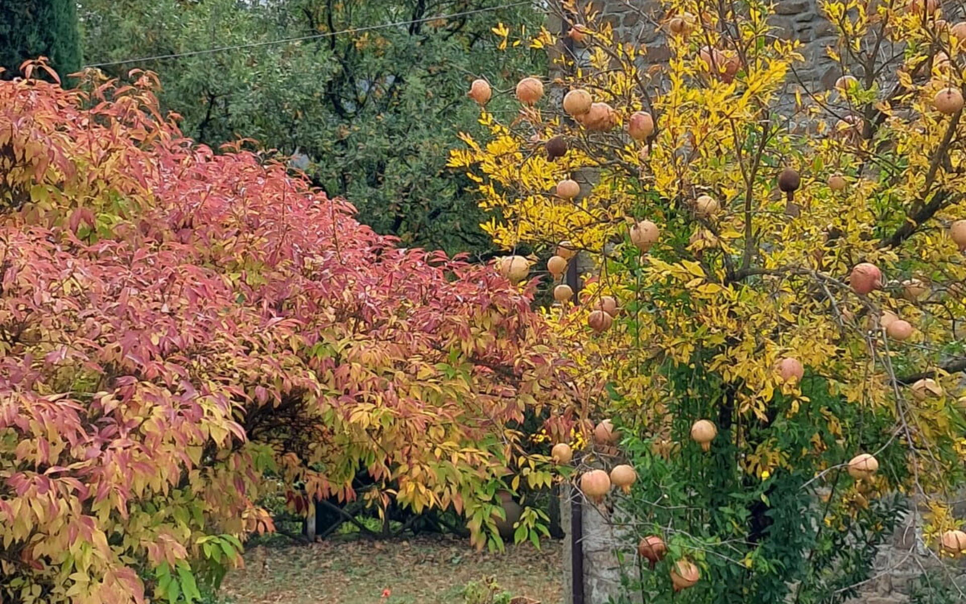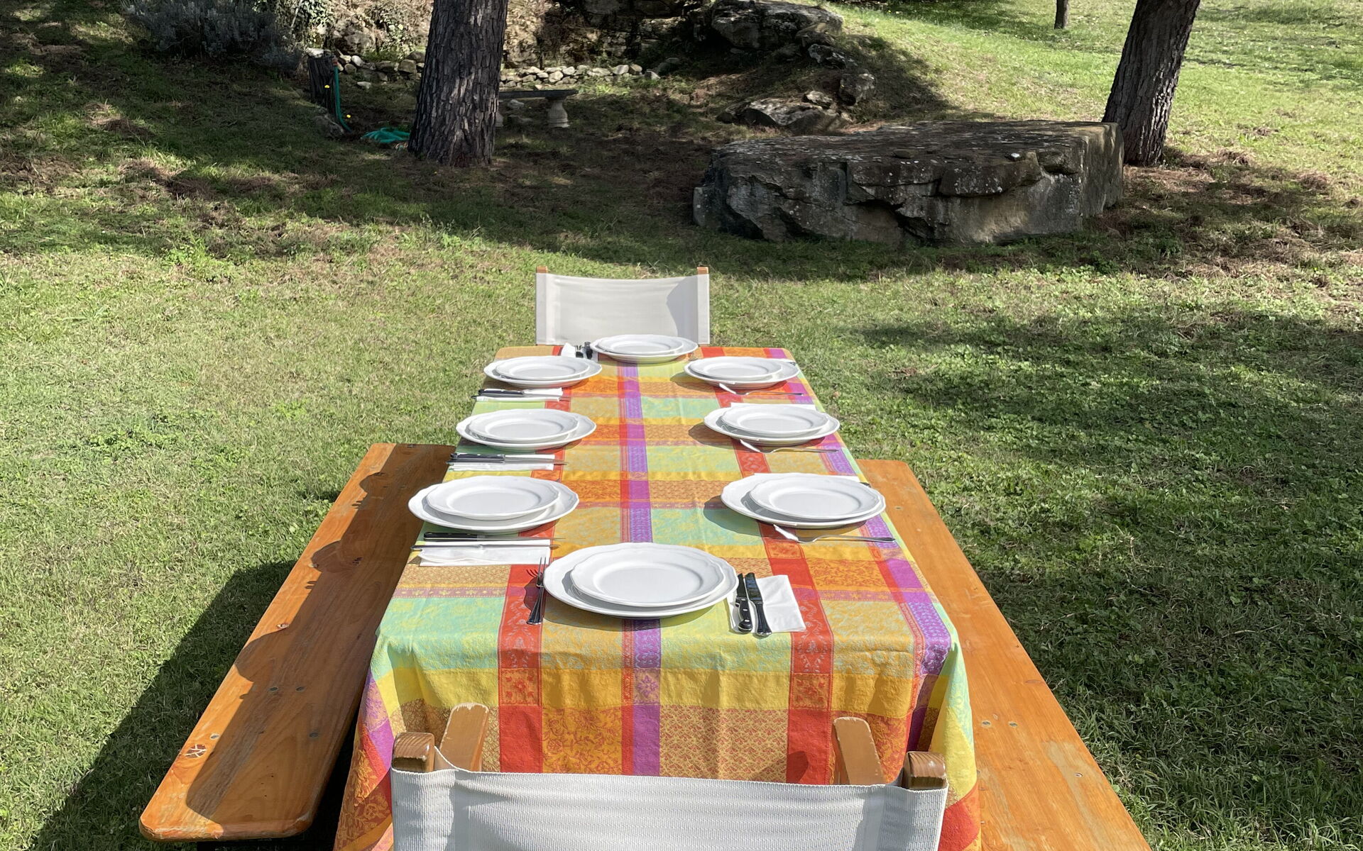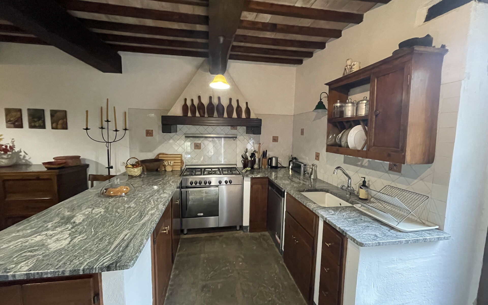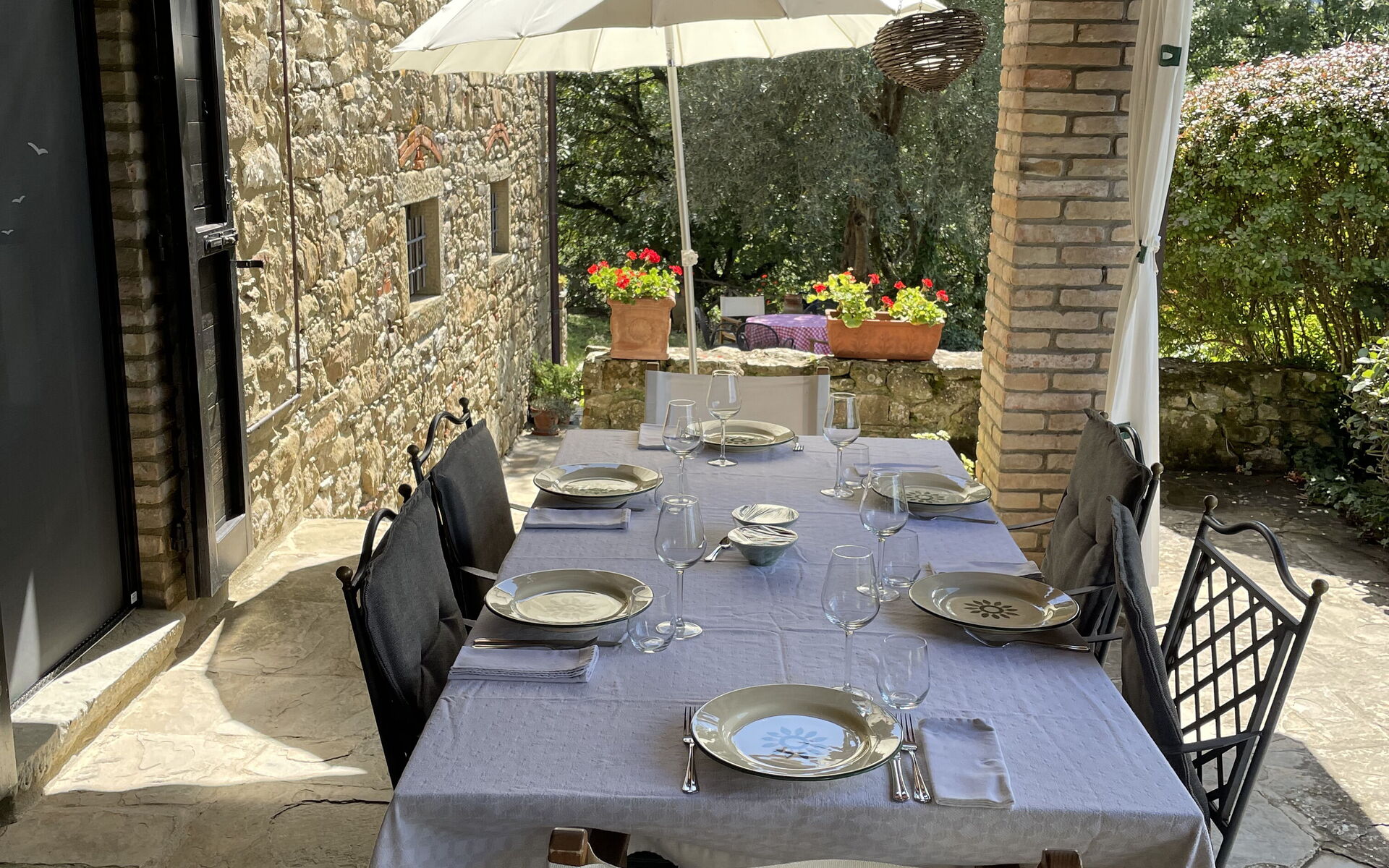 - Kitchen and Dining Room with a large rustic Tuscan-style wooden table, a 14th-century original fireplace, and access to a shaded stone courtyard furnished for outdoor dining. The kitchen is fully equipped with an oven, hob, fridge with freezer, dishwasher, high-quality cookware, microwave, toaster, coffee moka and utensils