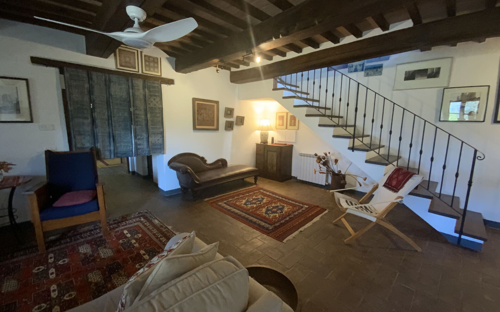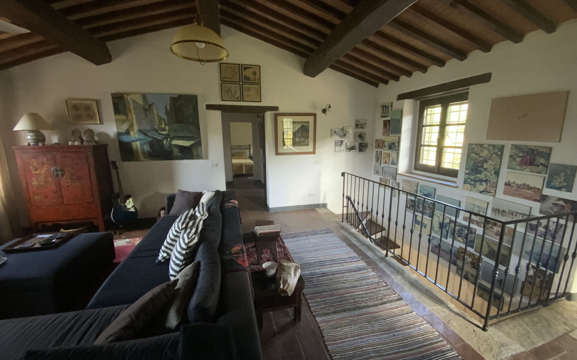 Nestled in the lush heart of the Tuscan countryside, Villa Castellino welcomes its guests with spacious interiors, natural light, and enchanting views that stretch across rolling hills and olive groves. Spread over two floors connected by an internal staircase, the villa offers generous indoor and outdoor spaces — perfect for relaxing moments with family or friends. The main entrance, through a traditional Tuscan stone loggia, leads to the bright main living room on the first floor. Here, comfortable sofas, a coffee table, TV, and DVD player create a welcoming atmosphere — perfect for relaxing after a day exploring the surrounding countryside. On one side of the living room, there are two bedrooms that share a modern bathroom with a shower; on the other side, the master bedroom with an en-suite bathroom offers comfort and privacy. Descending the internal staircase, you reach the living area on the lower floor, which features a second spacious lounge, a kitchen with dining area, a double bedroom, a bathroom, and a fully equipped laundry room. The large French doors from the living room open directly onto a covered patio, furnished with a table and chairs for delightful al fresco lunches and dinners while enjoying the stunning views over the hills of Tuscany and Umbria. The shaded veranda is also the perfect spot to read a book or catch up on some work in complete peace and quiet.
