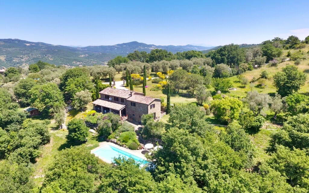 Villa Castellina is the ideal place to spend a holiday surrounded by the beauty and tranquility of Umbria and nearby Tuscany. The property is located on the gentle hills surrounding the village of Lisciano Niccone, in a panoramic and secluded position, yet just a short distance from the main services of the town. From here, guests can enjoy an incomparable view over the Niccone Valley and the lush, authentic landscape that characterizes this border area between Umbria and Tuscany. Immersed in the colors and scents of the Umbrian countryside, Villa Castellina offers spectacular sunsets and moments of absolute relaxation thanks to its dominant position. The villa’s central location allows guests to easily reach the main tourist destinations of Umbria and Tuscany, such as Cortona, Perugia, Assisi, Lake Trasimeno, and Montepulciano. A large lawn surrounds the entire property, where there is also an area equipped with a panoramic canopy, table and chairs, and a barbecue for delightful outdoor dinners. In front of the house lies the swimming pool with sun loungers, offering a wonderful view over the valley and moments of pure well-being.