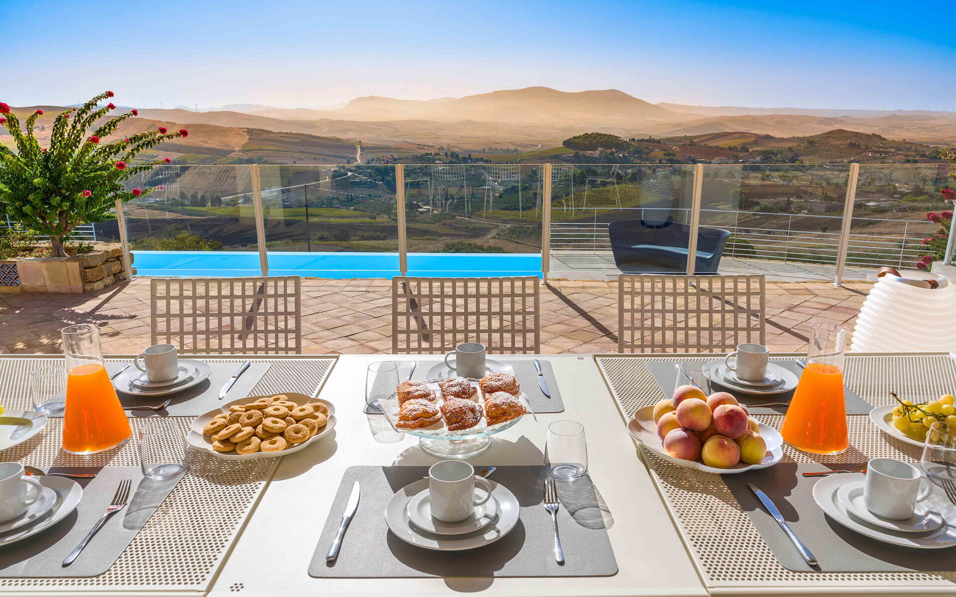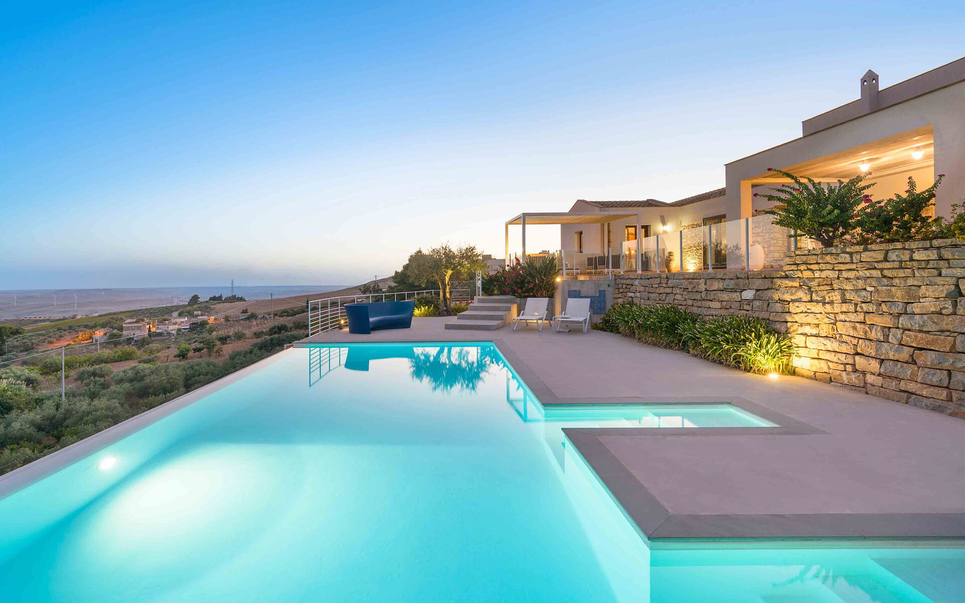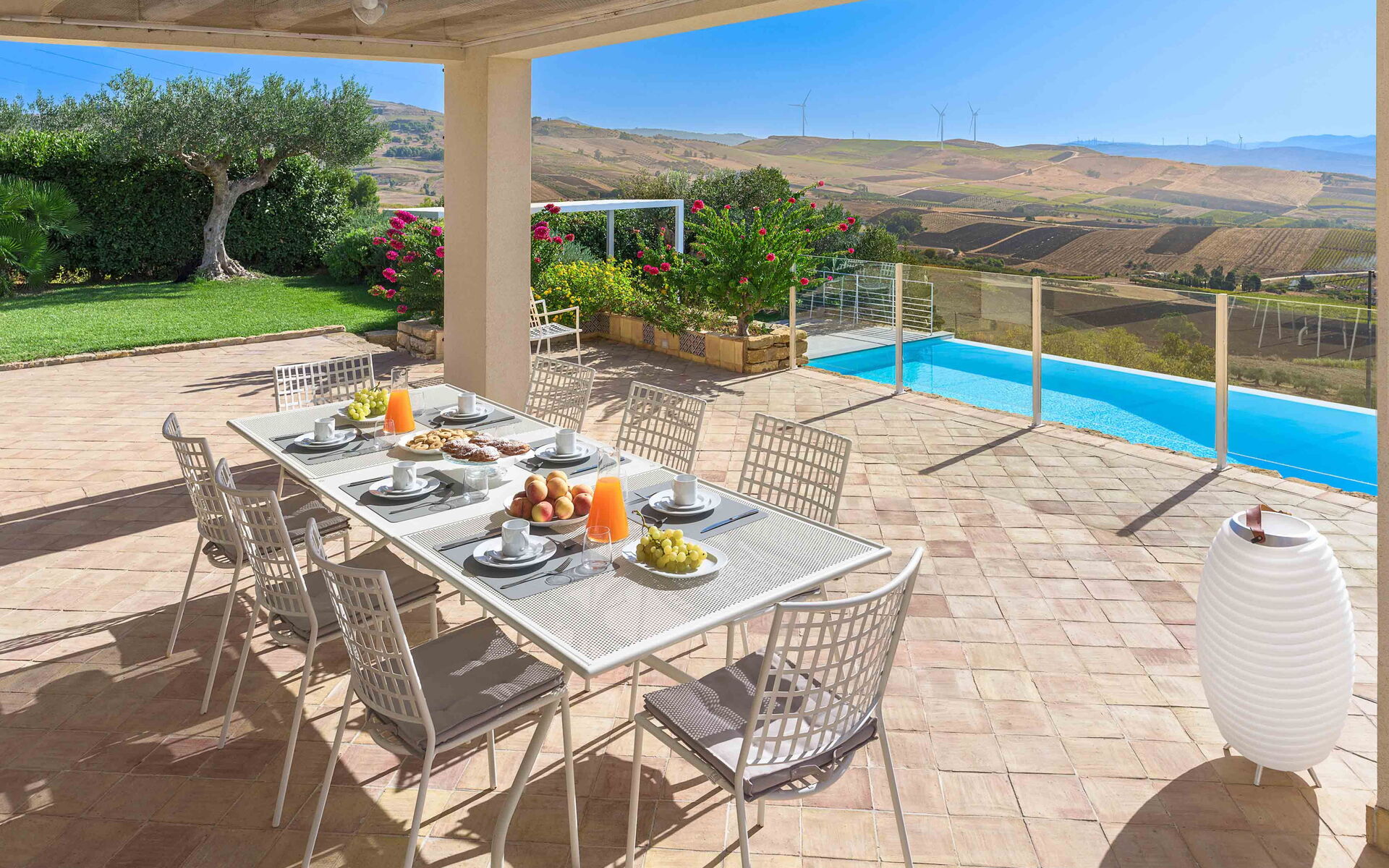 Tra le località di Erice e Segesta, immersa all’interno della campagna trapanese, si trova Tangi, un’esclusiva villa con piscina privata a sfioro. La struttura è il luogo perfetto dove trascorrere una vacanza all’insegna del relax e, allo stesso tempo, scoprire tutte le bellezze che la zona circostante può offrire ai suoi ospiti. La villa è la base perfetta da cui partire per esplorare le bellezze storiche e artistiche della meravigliosa Sicilia, come Mothia, Segesta, Selinunte ed Erice, le saline di Trapani e Marsala, Scopello, San Vito e la riserva dello Zingaro. Ciò che rende Tangi unica nel suo genere è la sua posizione dominante che vi offre un bellissimo panorama sull’area circostante. Tangi è situata all’interno di un meraviglioso e rigoglioso giardino, ricco di molte varietà di piante autoctone di queste zone. Di fronte alla villa invece è situata la bellissima piscina privata a sfioro (10mt x 4mt, profondità min 1,20mt - max 2,20mt), perfettamente esposta al sole durante la giornata e dotata di sdraio e doccia esterna dove potrete rilassarvi e rinfrescarvi durante le giornate estive più calde, godendovi una vista mozzafiato sul paesaggio che si apre davanti a voi. Gli esterni della villa sono completati da ampie terrazze, dove troviamo un’area barbecue attrezzata e completa di tavolo da pranzo, sedie e divanetti, ideale per preparare o gustare i vostri piatti preferiti all’aria aperta, o trascorrere del tempo in compagnia di un buon libro.