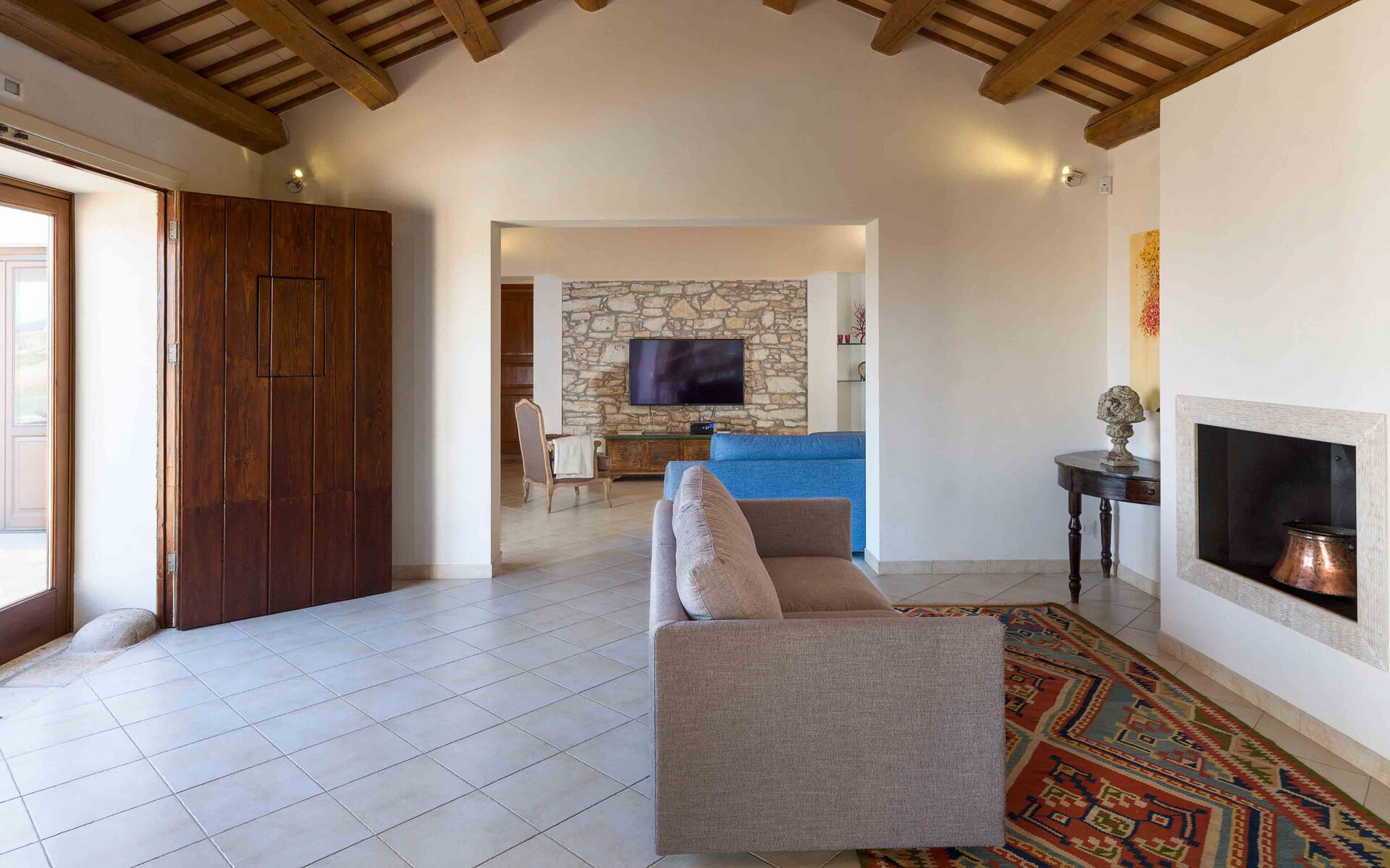 - Soggiorno completo di divani, TV e camino.