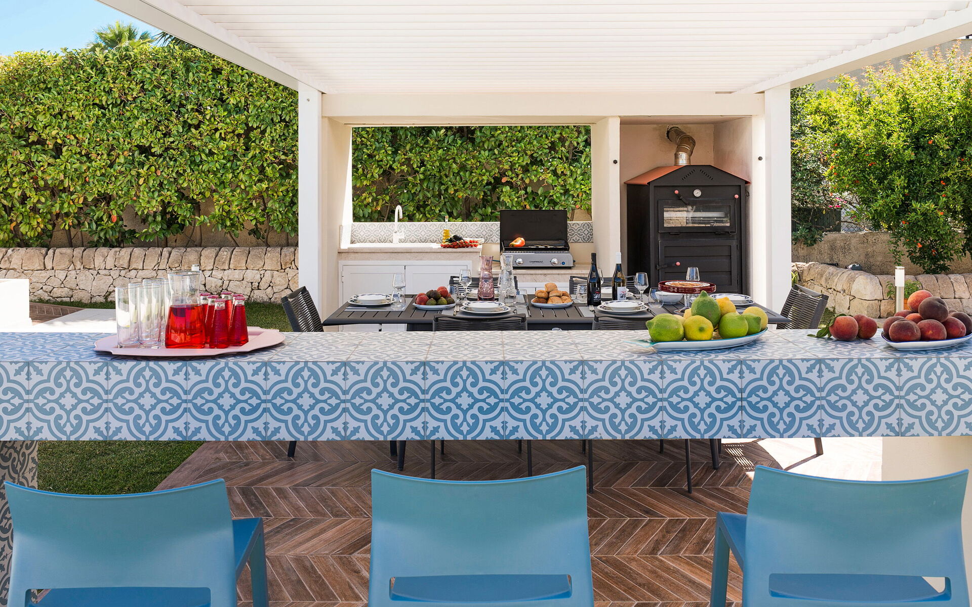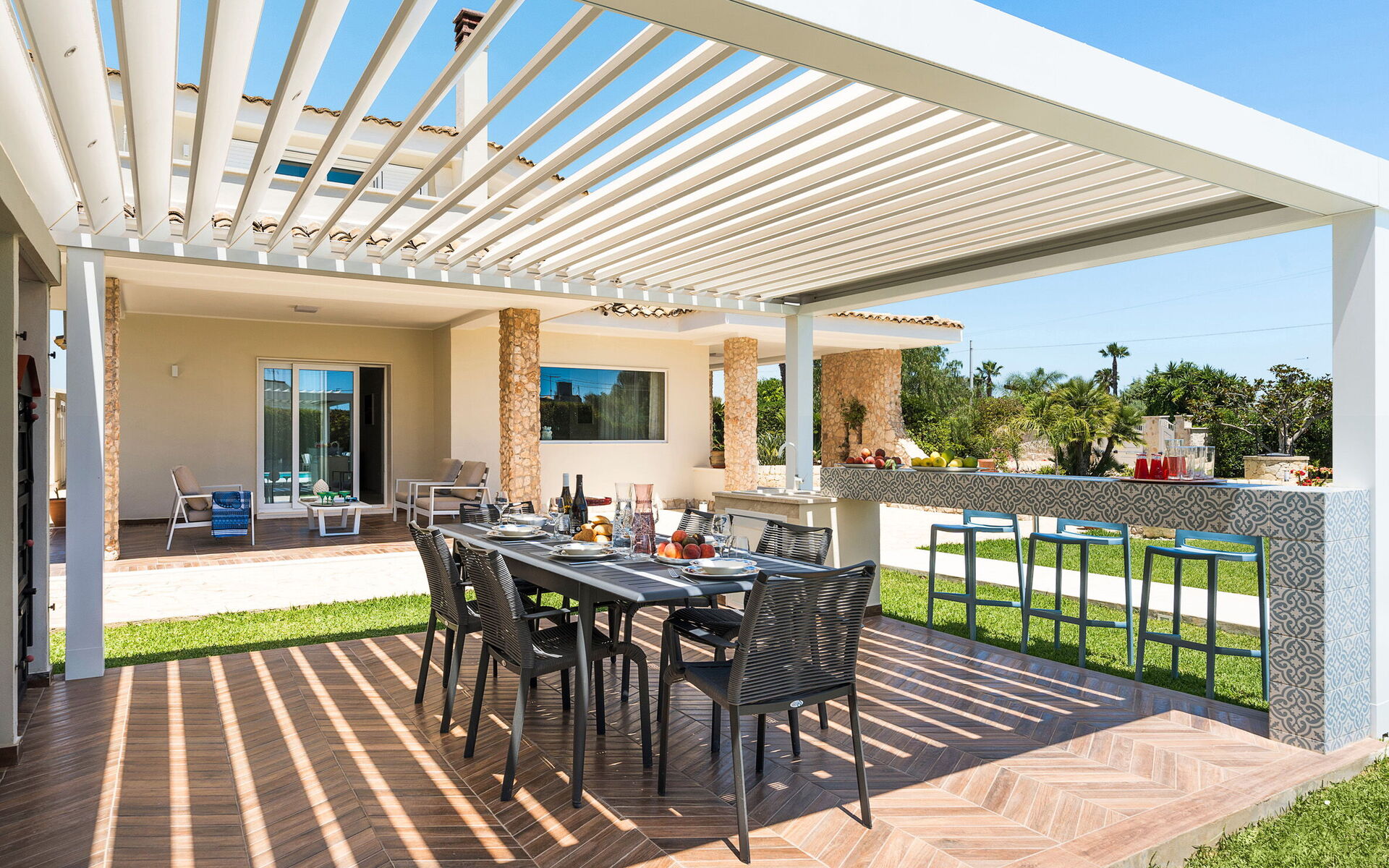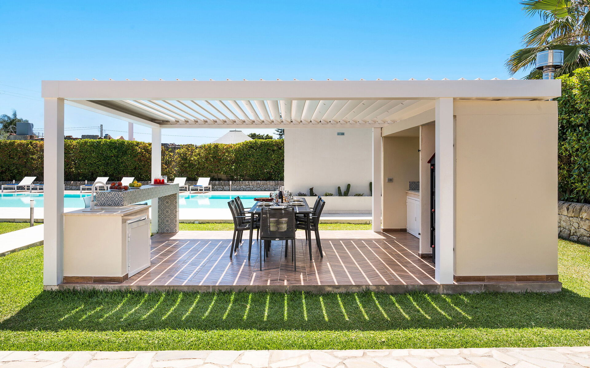 La villa mette a disposizione aria condizionata, smart TV, connessione Wi-Fi, lavatrice, veranda con pergola bioclimatica, area barbecue e forno a legna, giardino curato, piscina con solarium, due bagni e due docce. La cucina è completamente accessoriata con tutti gli elettrodomestici utili: bollitore, ferro da stiro, forno a legna, forno elettrico, freezer, frigorifero, frullatore, piano cottura a induzione, lavastoviglie, macchina da caffè americana, macchina da caffè espresso, fabbricatore di ghiaccio, seggiolone e tostapane.