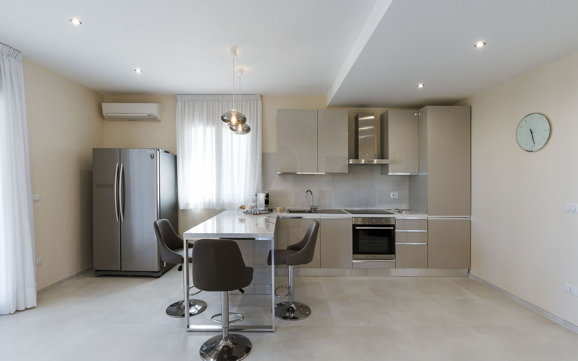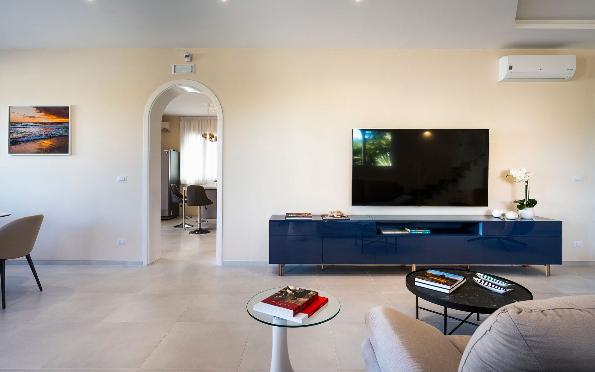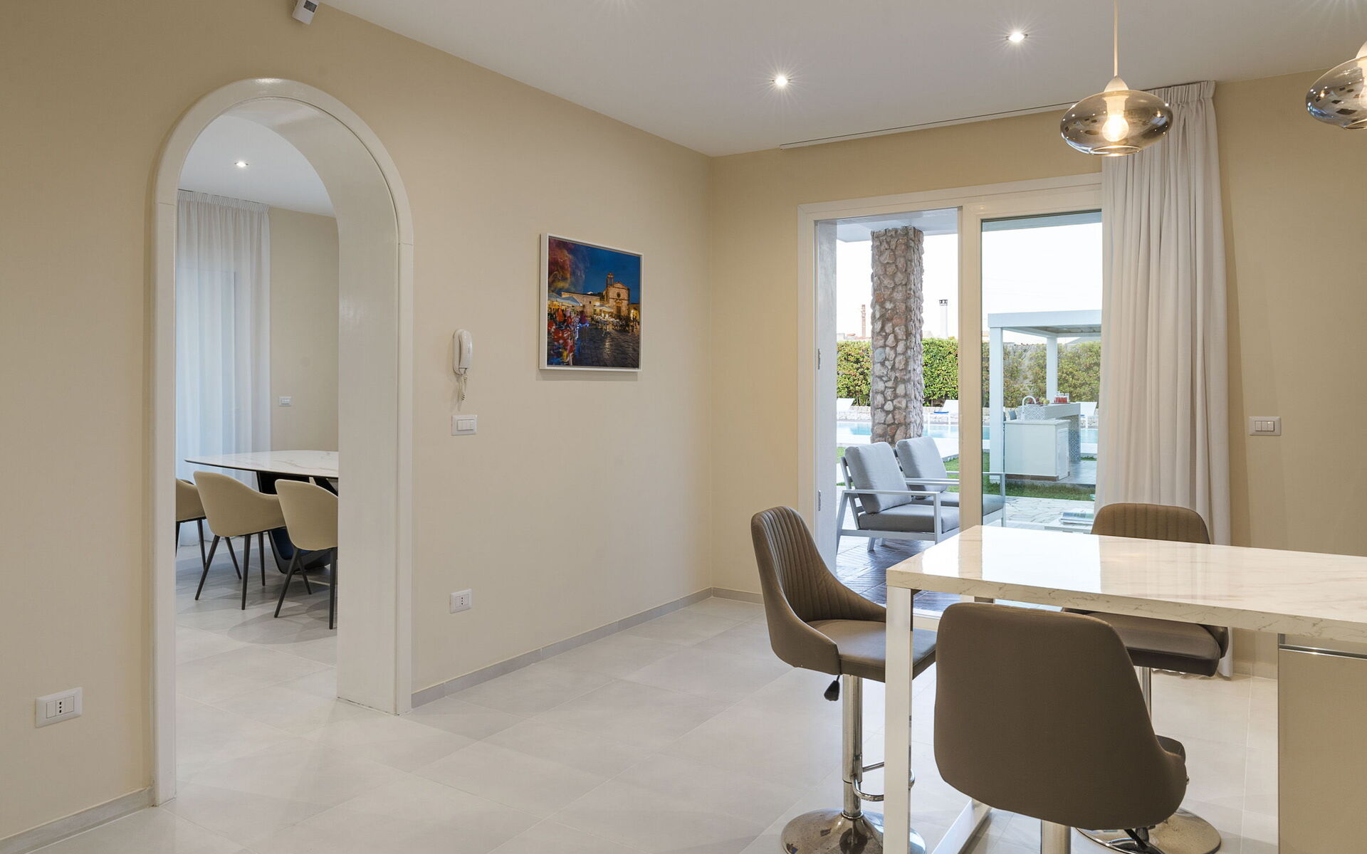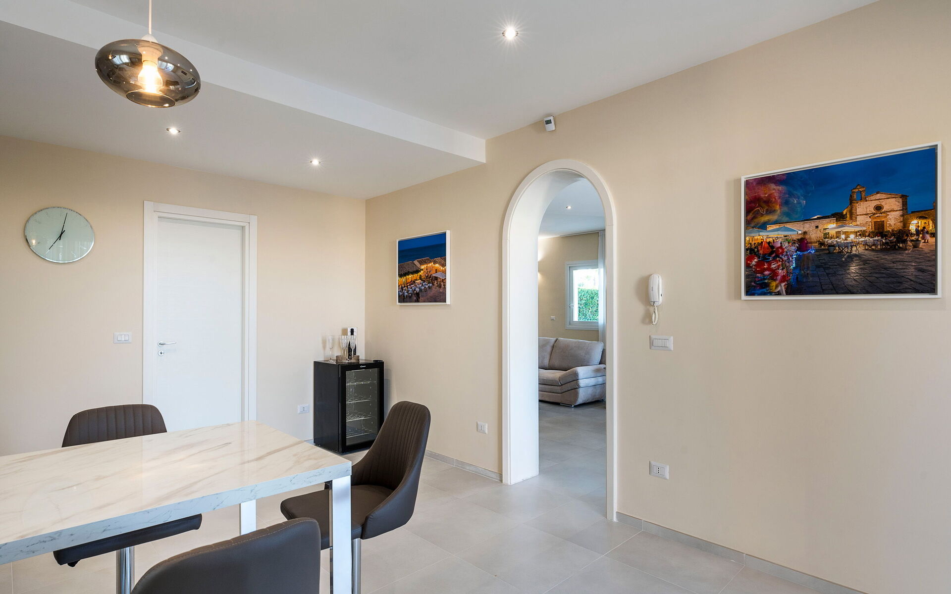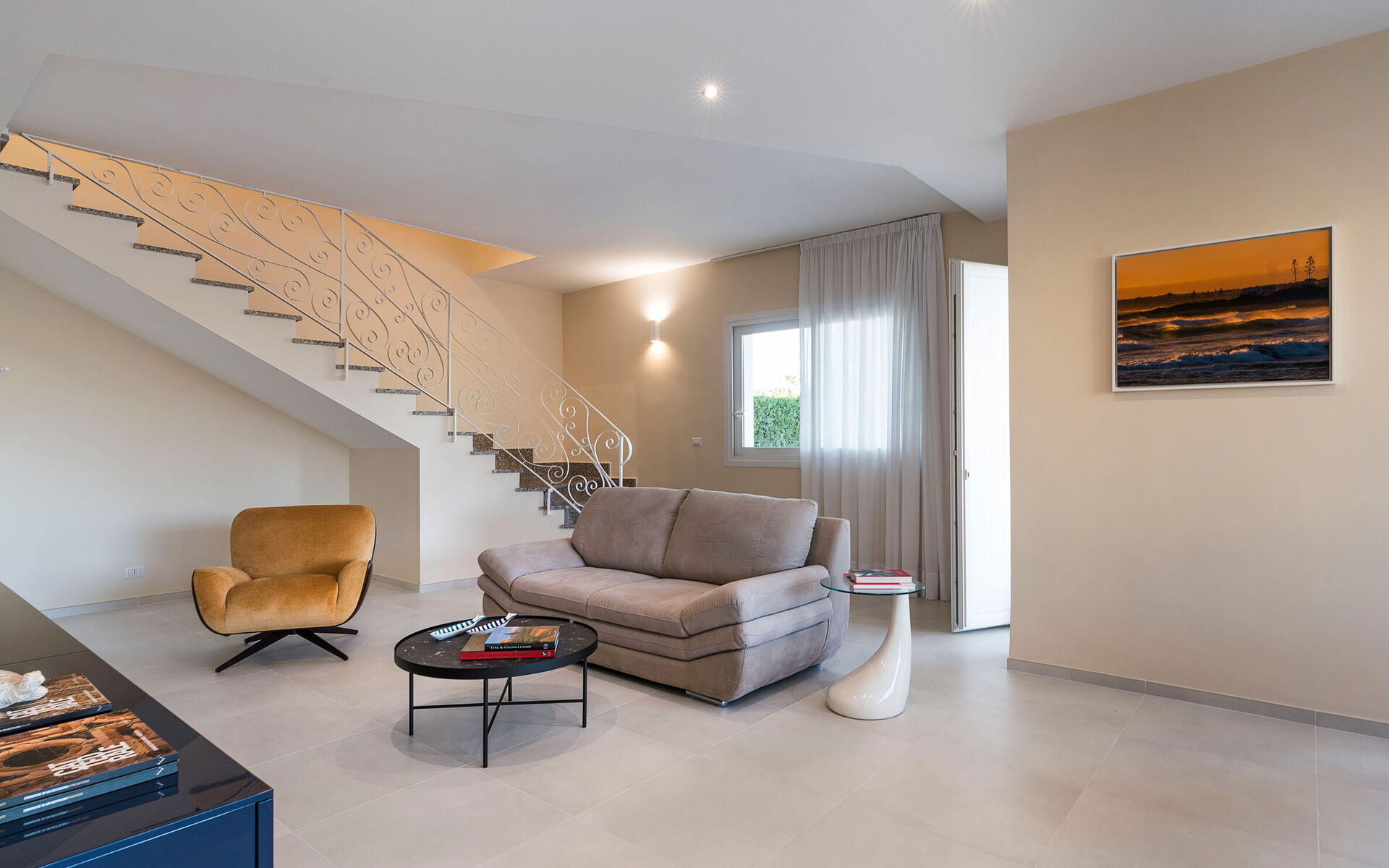 Gli interni, accoglienti e ben organizzati, si sviluppano su due livelli. Al piano terra si trovano un ampio soggiorno con zona pranzo, una cucina completamente accessoriata, una lavanderia e un bagno con doccia. Il primo piano, raggiungibile tramite una comoda scala interna, ospita la zona notte: una camera matrimoniale con bagno privato dotato di doccia, una seconda camera matrimoniale, un ulteriore bagno con doccia e una cameretta con due letti singoli. La villa è interamente climatizzata e dispone di aria condizionata in ogni ambiente, Wi-Fi, smart TV, lavatrice, lavastoviglie, macchine per caffè espresso e americano, macchina del ghiaccio, forno a legna, barbecue e parcheggio privato.