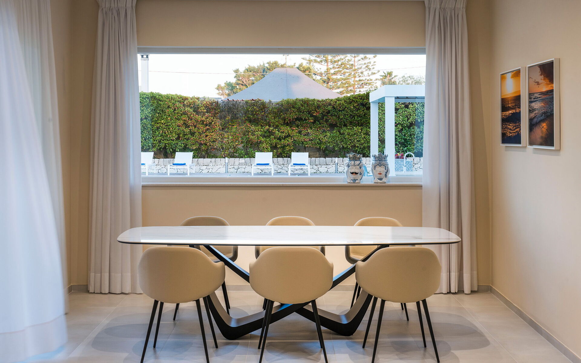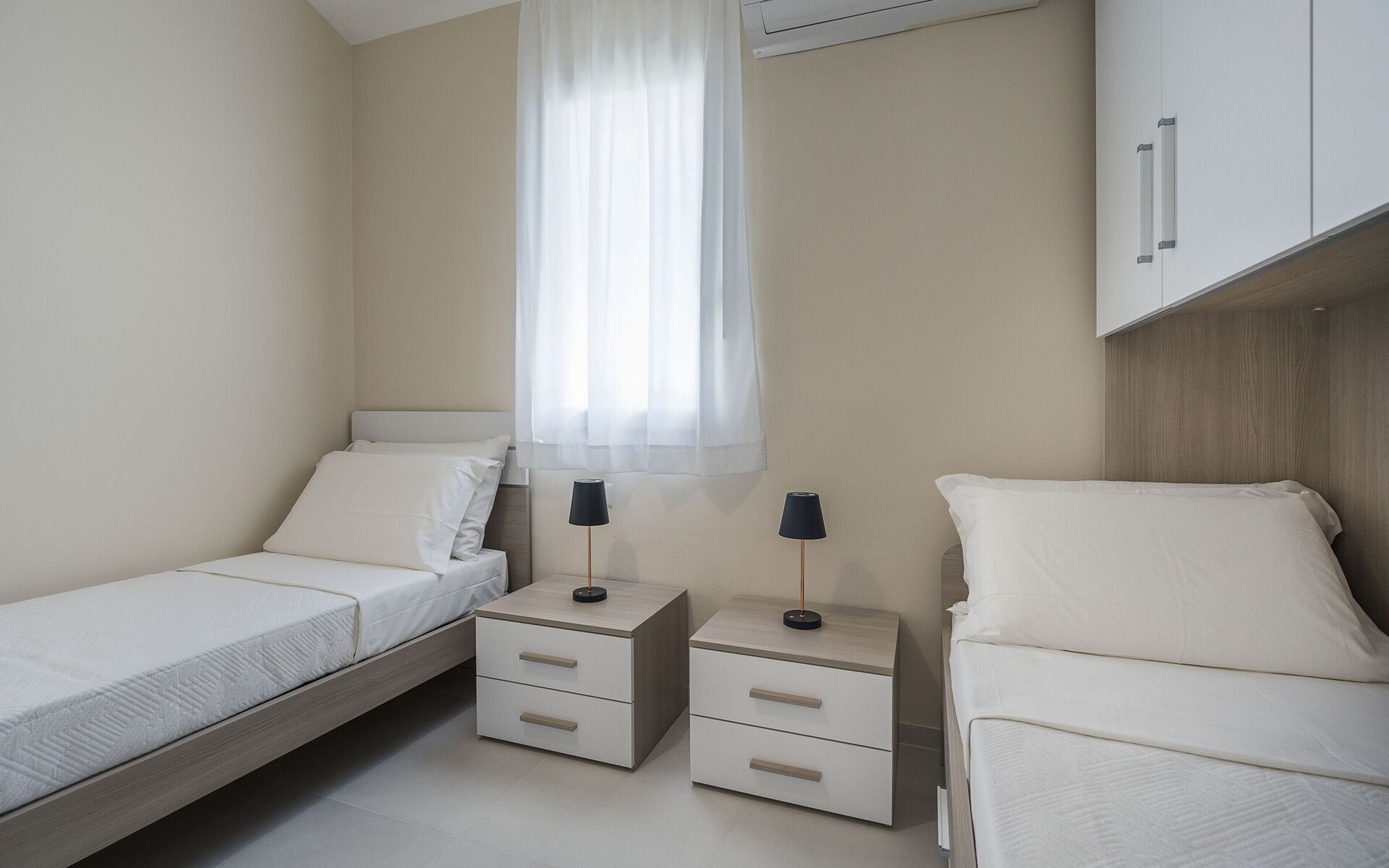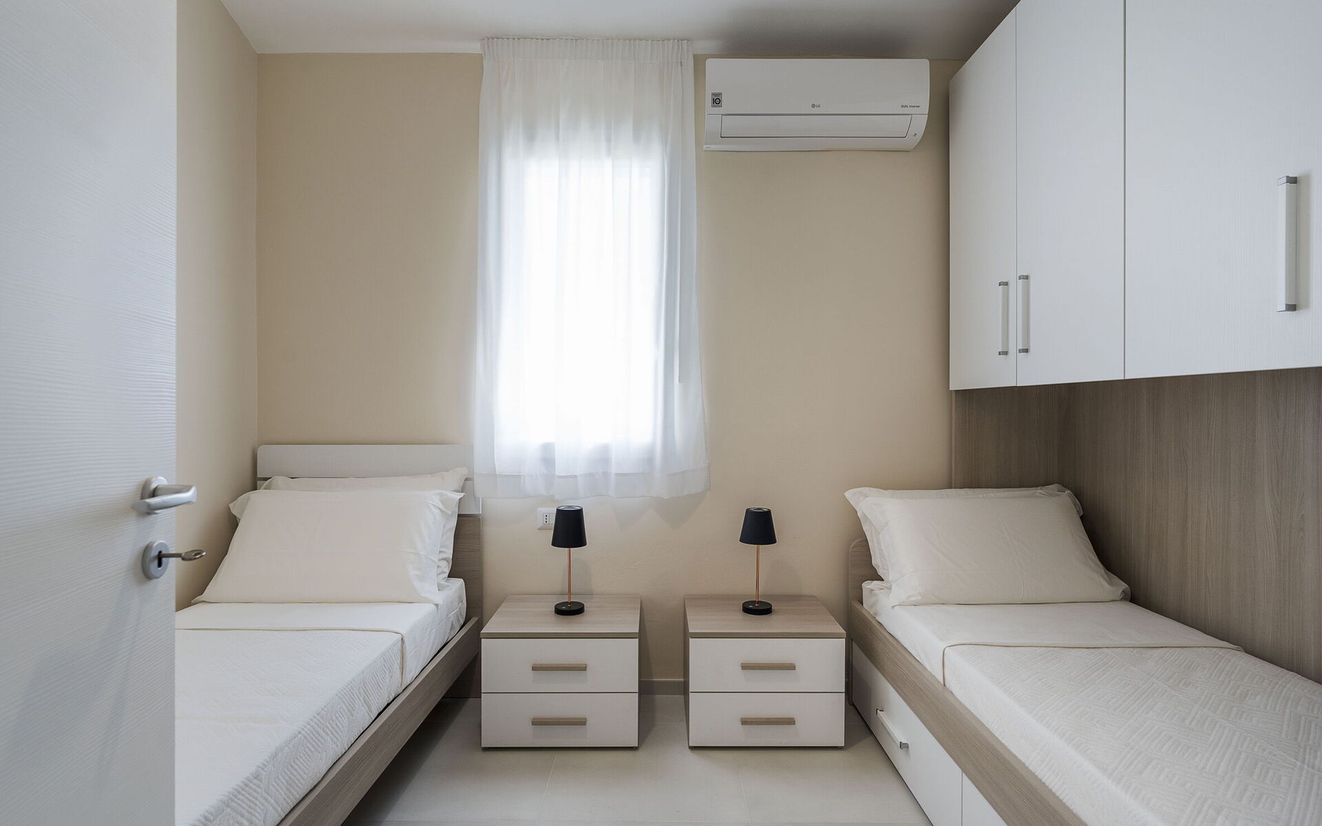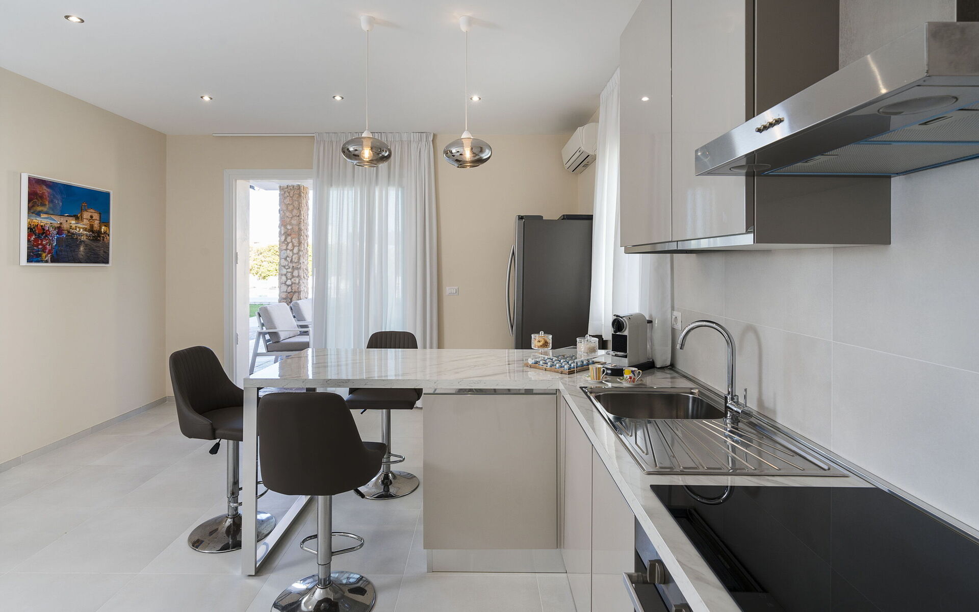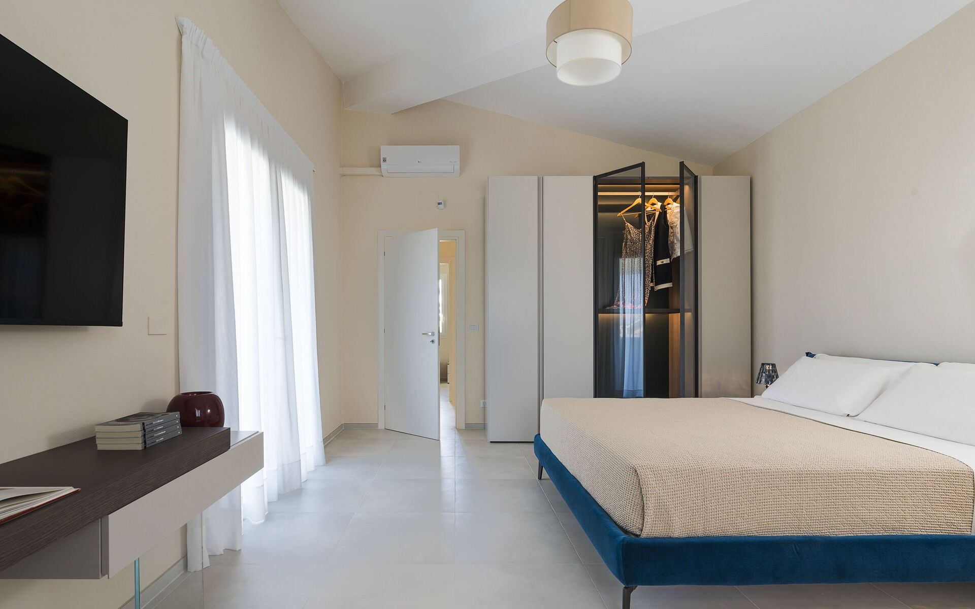 Gli interni, accoglienti e ben organizzati, si sviluppano su due livelli. Al piano terra si trovano un ampio soggiorno con zona pranzo, una cucina completamente accessoriata, una lavanderia e un bagno con doccia. Il primo piano, raggiungibile tramite una comoda scala interna, ospita la zona notte: una camera matrimoniale con bagno privato dotato di doccia, una seconda camera matrimoniale, un ulteriore bagno con doccia e una cameretta con due letti singoli. La villa è interamente climatizzata e dispone di aria condizionata in ogni ambiente, Wi-Fi, smart TV, lavatrice, lavastoviglie, macchine per caffè espresso e americano, macchina del ghiaccio, forno a legna, barbecue e parcheggio privato.