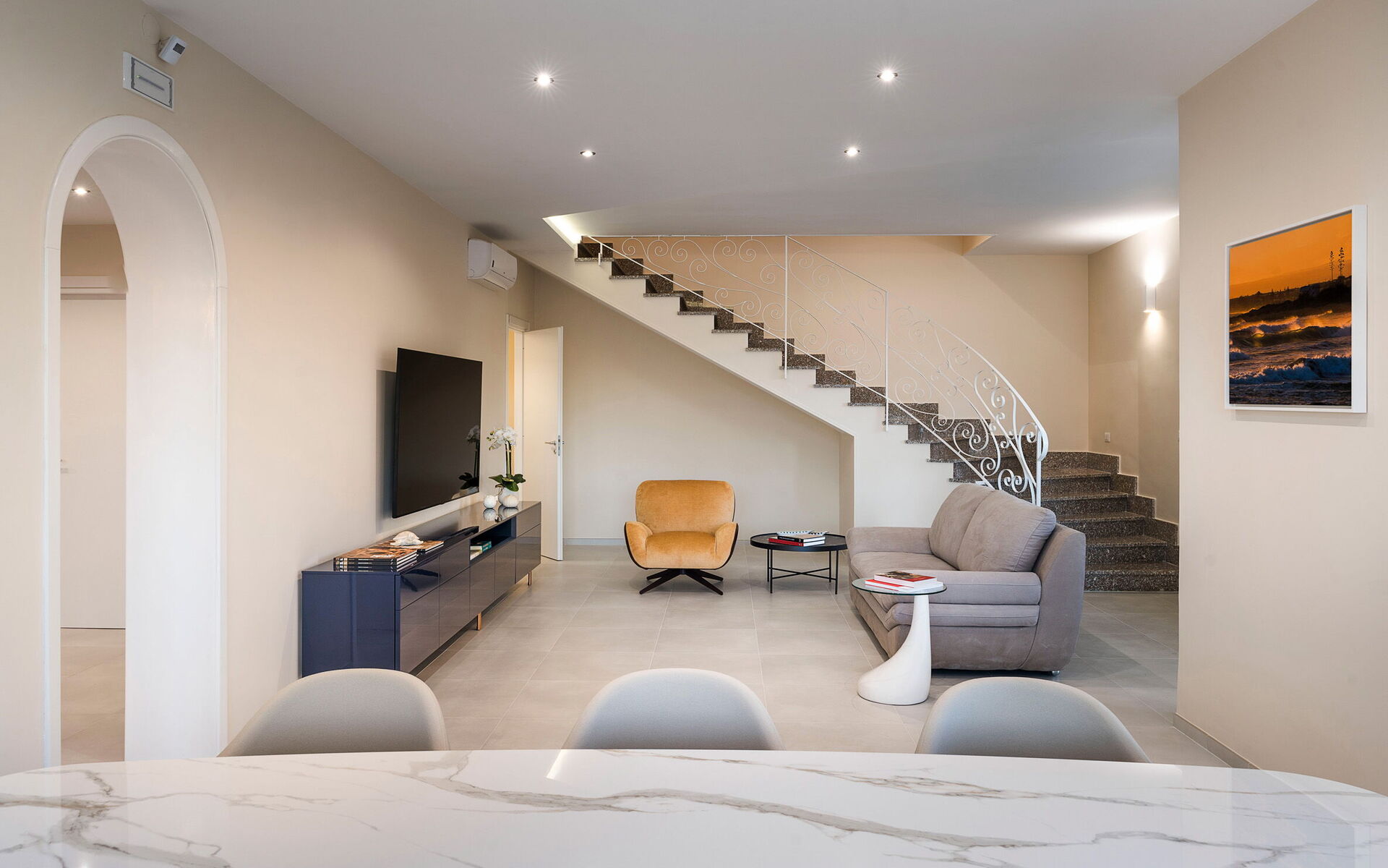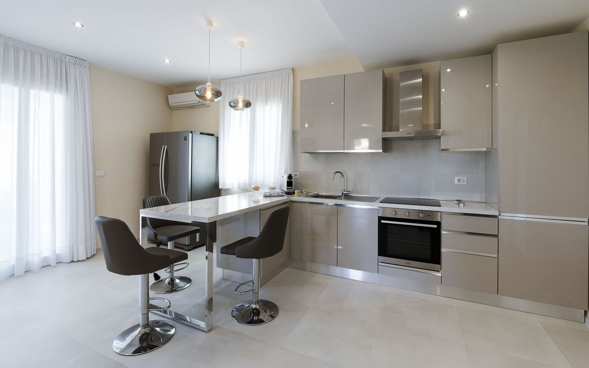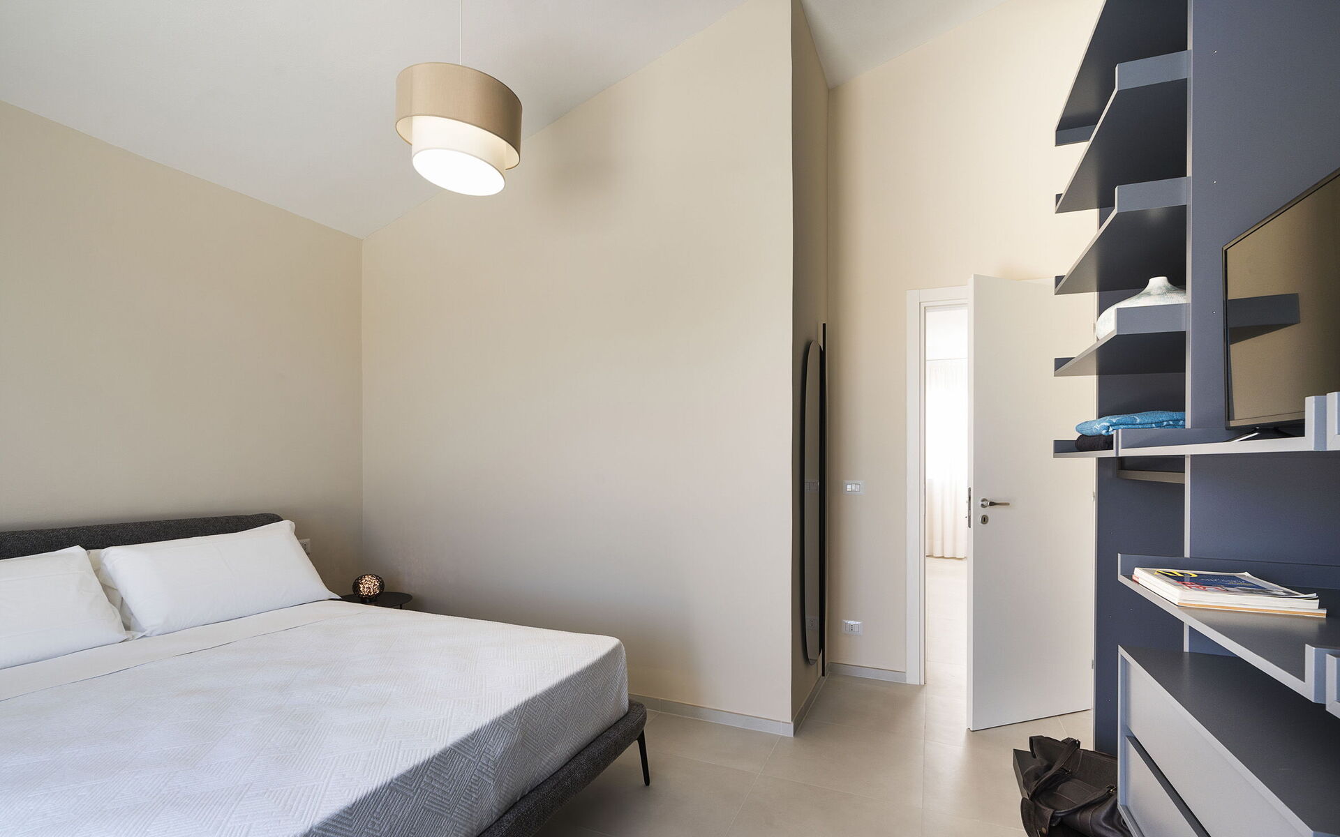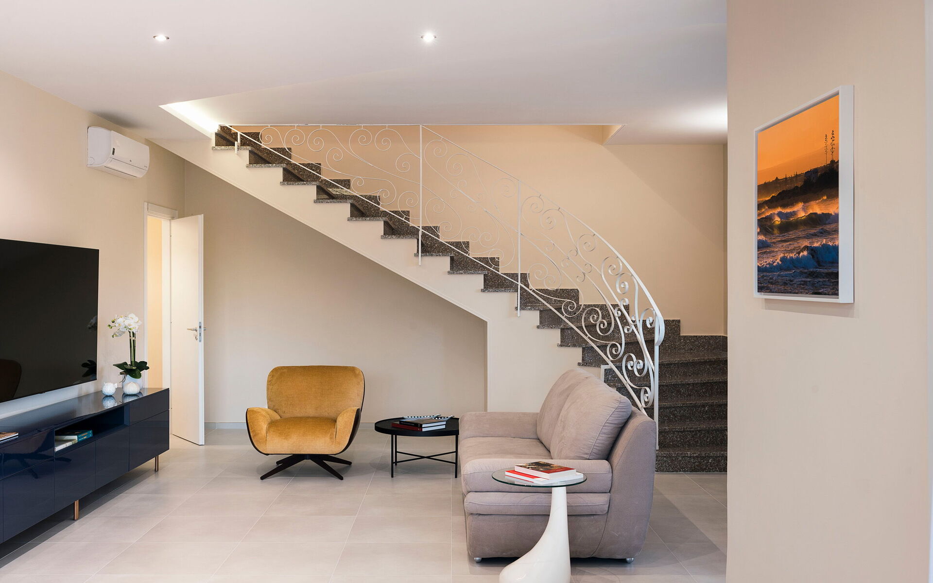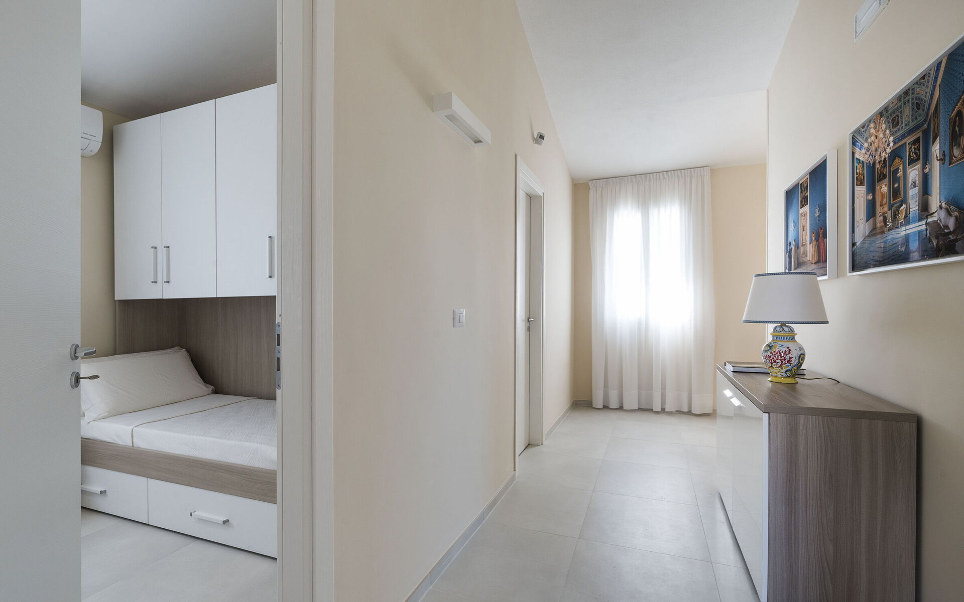 Gli interni, accoglienti e ben organizzati, si sviluppano su due livelli. Al piano terra si trovano un ampio soggiorno con zona pranzo, una cucina completamente accessoriata, una lavanderia e un bagno con doccia. Il primo piano, raggiungibile tramite una comoda scala interna, ospita la zona notte: una camera matrimoniale con bagno privato dotato di doccia, una seconda camera matrimoniale, un ulteriore bagno con doccia e una cameretta con due letti singoli. La villa è interamente climatizzata e dispone di aria condizionata in ogni ambiente, Wi-Fi, smart TV, lavatrice, lavastoviglie, macchine per caffè espresso e americano, macchina del ghiaccio, forno a legna, barbecue e parcheggio privato.