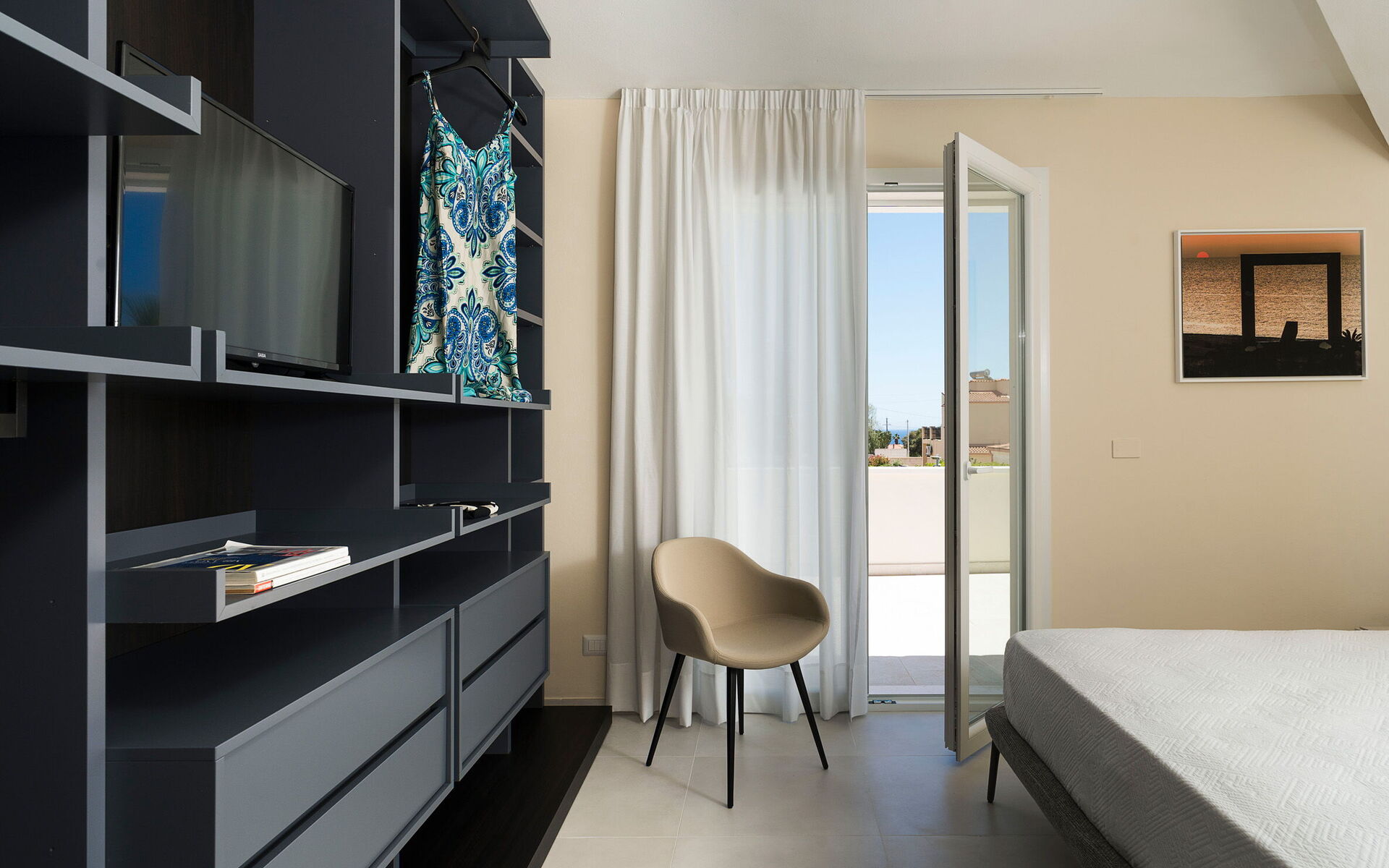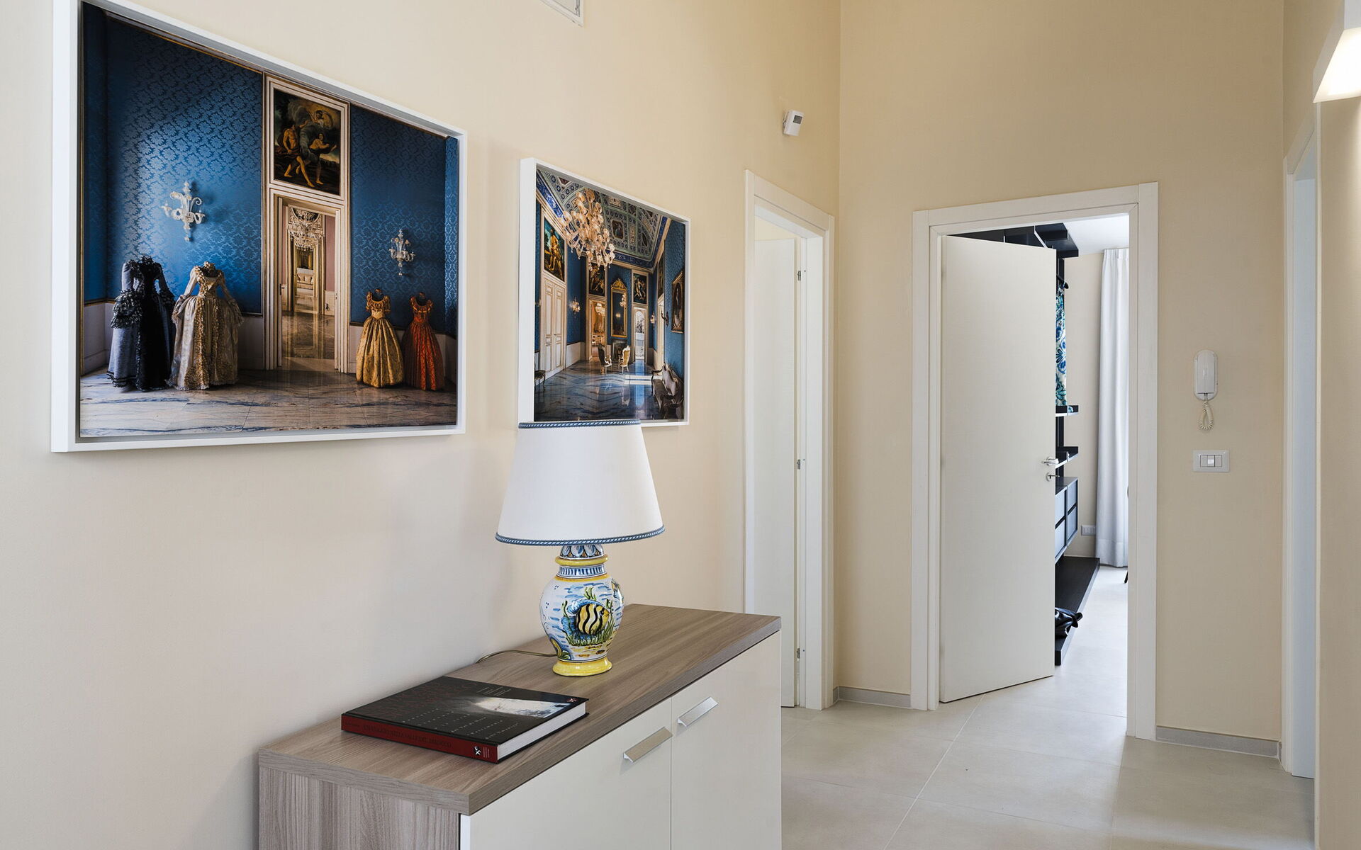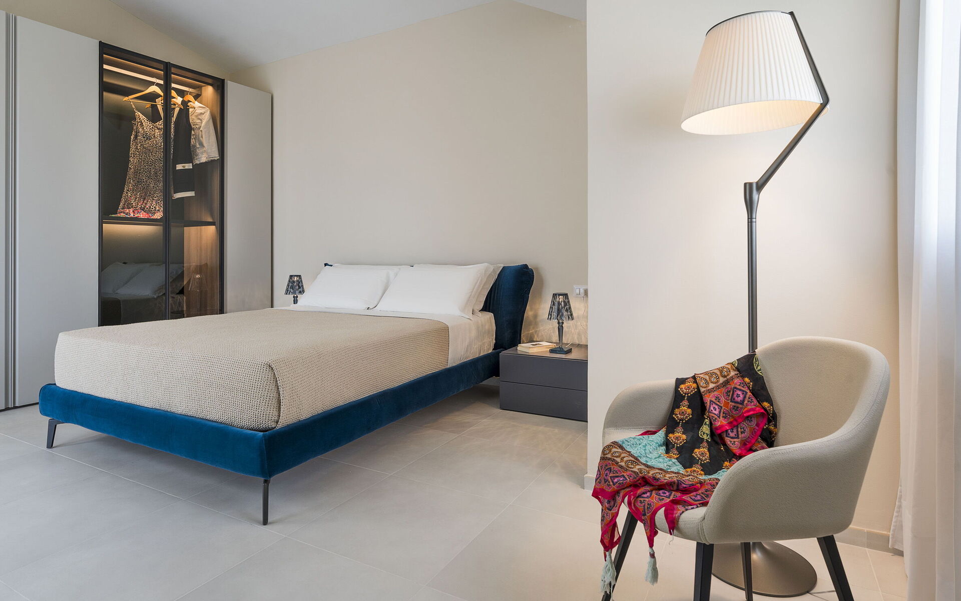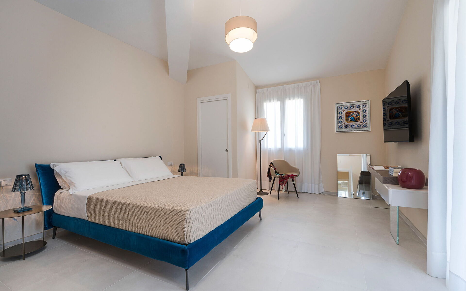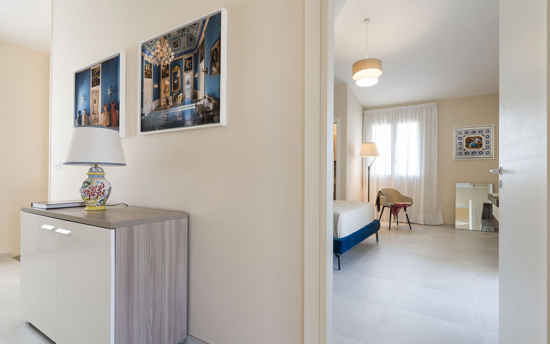 Gli interni, accoglienti e ben organizzati, si sviluppano su due livelli. Al piano terra si trovano un ampio soggiorno con zona pranzo, una cucina completamente accessoriata, una lavanderia e un bagno con doccia. Il primo piano, raggiungibile tramite una comoda scala interna, ospita la zona notte: una camera matrimoniale con bagno privato dotato di doccia, una seconda camera matrimoniale, un ulteriore bagno con doccia e una cameretta con due letti singoli. La villa è interamente climatizzata e dispone di aria condizionata in ogni ambiente, Wi-Fi, smart TV, lavatrice, lavastoviglie, macchine per caffè espresso e americano, macchina del ghiaccio, forno a legna, barbecue e parcheggio privato.