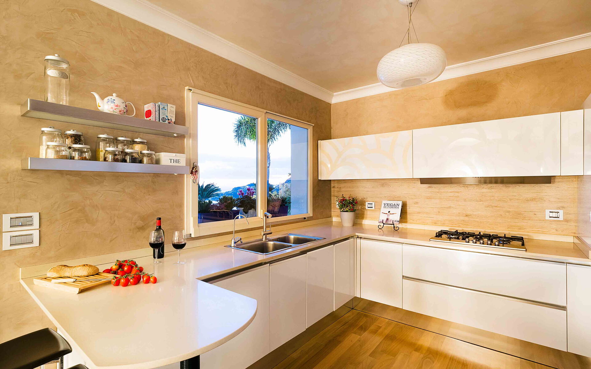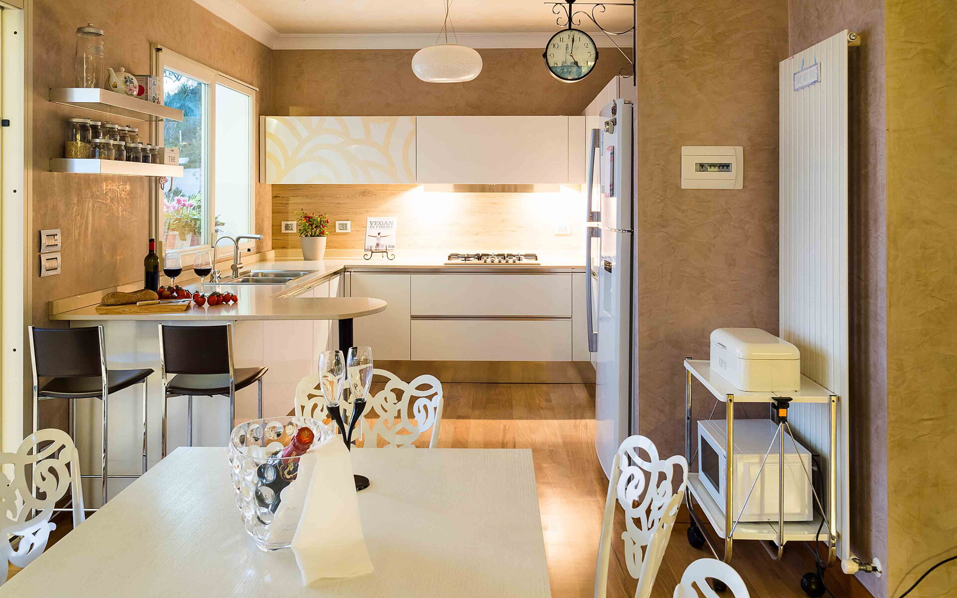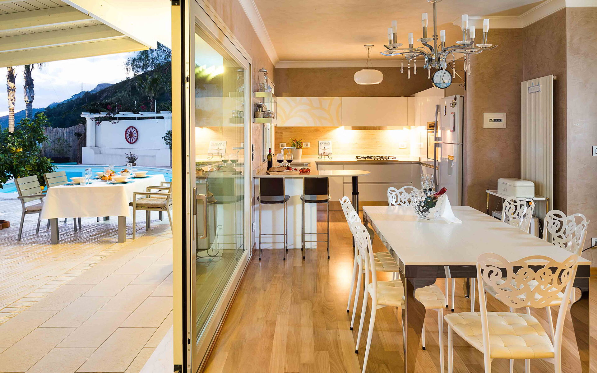 Villa Luce può ospitare comodamente fino a 7 ospiti e si sviluppa su due livelli. La villa, raffinata ed elegante, offre degli ambienti interni accoglienti, pensati e progettati per donare agli ospiti il massimo del comfort. Dalla veranda si accede, tramite una bellissima e luminosa vetrata, al soggiorno, dove troviamo la cucina, completamente equipaggiata e dotata di: frigo e freezer, forno, forno microonde, piano cottura, bollitore, lavastoviglie, macchina per caffè espresso, mixer e piastra elettrica. Al piano terra troviamo inoltre una camera da letto matrimoniale, una camera con letto alla francese, una camera singola ed un bagno completo di doccia. Attraverso una scala a chiocciola, che collega internamente i due livelli si accede al primo piano, dove si trova un’ultima camera matrimoniale ed un bagno completo di vasca e doccia.