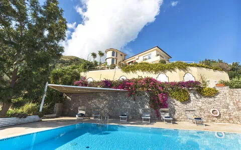 Dalla terrazza si accede direttamente alla villa, dove gli ospiti vengono accolti da un’ampia e luminosa zona living composta da cucina attrezzata, area pranzo e confortevoli divani, perfetti per momenti di convivialità e relax. Da questo ambiente si raggiungono le prime due camere da letto: una matrimoniale con bagno en suite e una camera con letti separati alla francese, oltre a un ulteriore bagno completo di doccia. Una scenografica scala a chiocciola, impreziosita da finestre panoramiche, conduce al piano superiore. Qui si trovano altre due camere da letto, entrambe con bagno privato, e la quinta camera, la prestigiosa Master Suite. Quest’ultima dispone di vasca idromassaggio, ampia doccia e di uno spazioso balcone privato che offre scorci sul mare semplicemente incomparabili. La villa è inoltre dotata di tutti i comfort necessari per un soggiorno senza pensieri: lavatrice, asciugatrice, lavastoviglie, ferro e asse da stiro, TV, cassetta di sicurezza e caminetto. La cucina, completamente attrezzata, dispone di bollitore, tostapane, mixer, forno tradizionale, forno a microonde e macchina da caffè, per garantire la massima praticità in ogni momento della giornata.