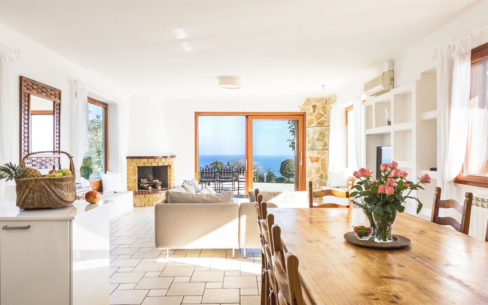 Aria condizionata, Caminetto, Cucina ben attrezzata, Divano, Forno, Freezer, Frigo, Internet WiFi, Lavastoviglie, Macchina da caffè (Italiana), Microonde, Piano Cottura, Tavolo da pranzo, Televisione, Tostapane, Uscita sulla veranda