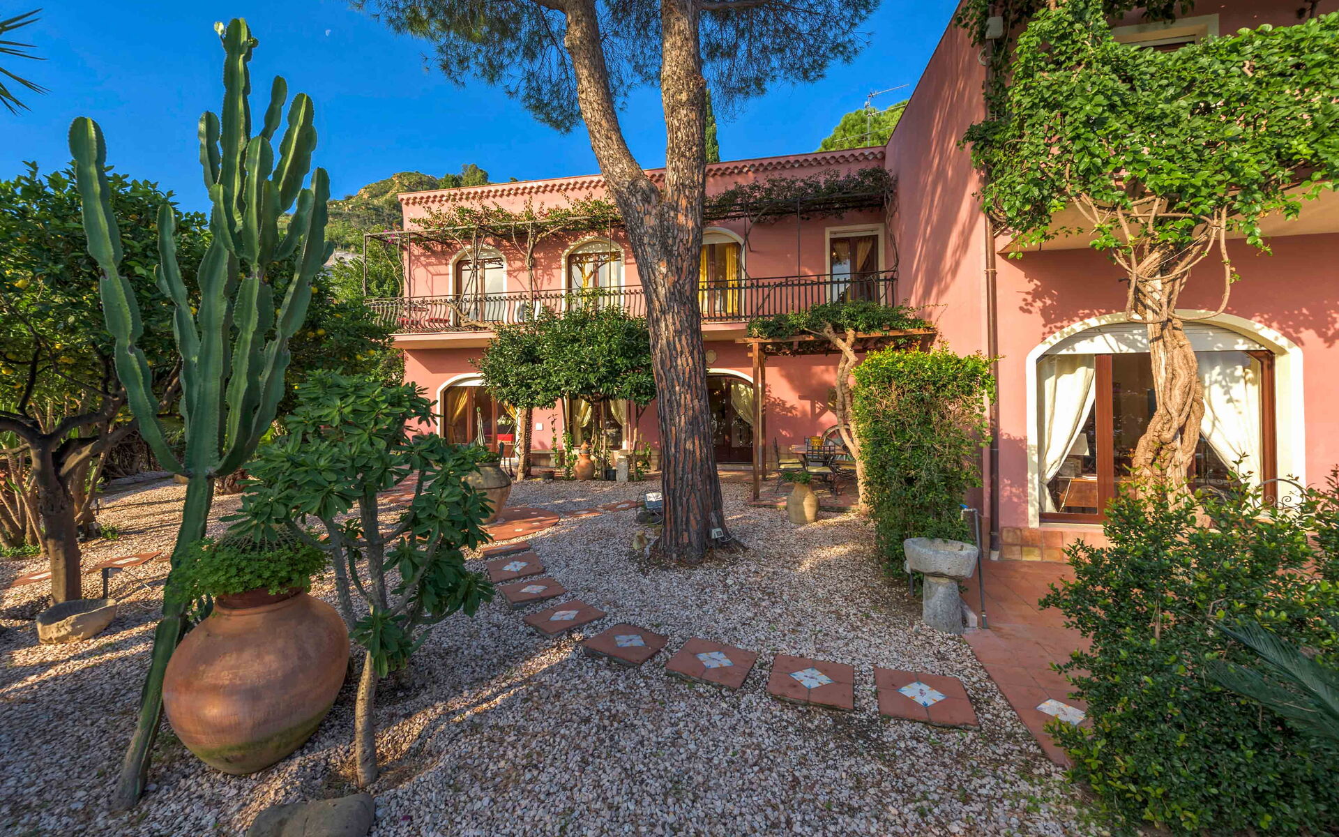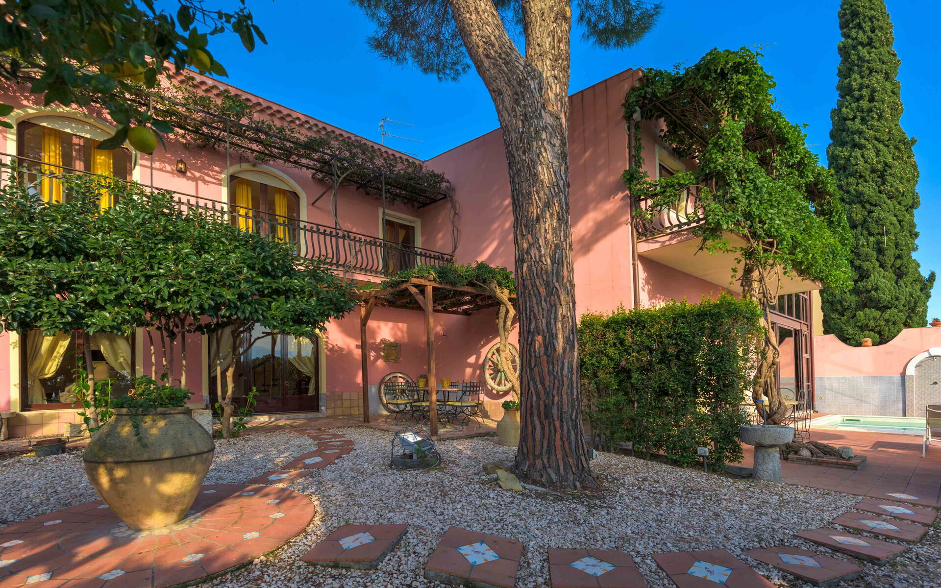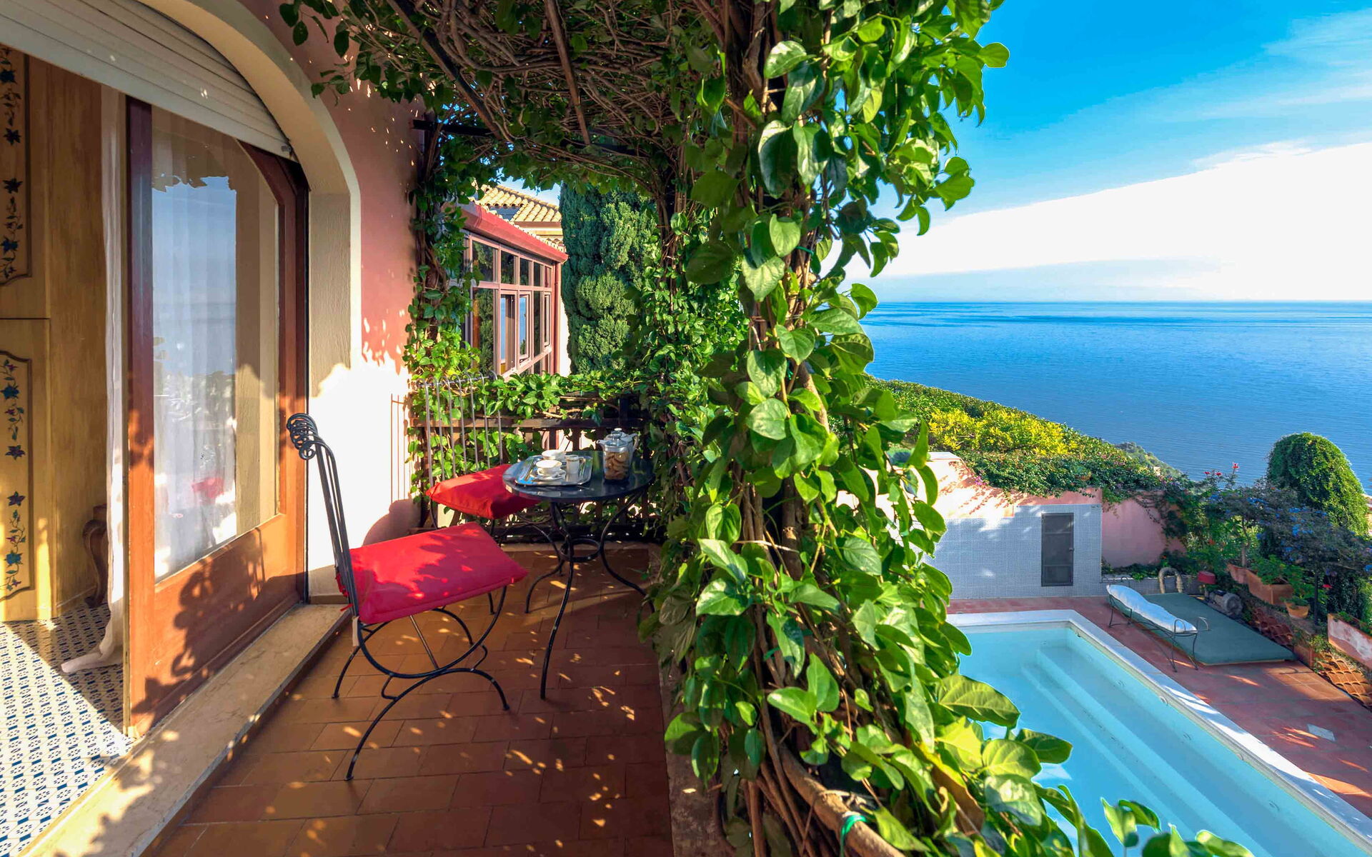 Villa La Boheme è una panoramica villa con piscina situata nella splendida Taormina. La villa è il luogo perfetto per chi è alla ricerca di una vacanza all’insegna del relax ma allo stesso tempo vuole scoprire tutte le bellezze storiche, artistiche e architettoniche che la Sicilia può offrire ai suoi visitatori. La struttura è perfetta per essere usata come base di partenza per esplorare in pochi chilometri le zone circostanti, come le vicine spiagge di Mazzarò e dell’Isola Bella, Catania, i paesini del Parco dell’Etna, le gole dell’Alcantara ed i borghi marinari della Riviera dei Ciclopi. Ciò che rende unica villa La Boheme è la sua straordinaria vista sul mare cristallino circostante, una veduta che vi lascerà senza parole. La struttura è anche vicina ai luoghi d’interesse della bellissima Taormina, come il Teatro Antico, il Corso Umberto, le eleganti boutique del centro e ai vari ristoranti e locali serali che animano il suo centro storico. Villa La Boheme è inserita all’interno di uno splendido e rigoglioso giardino ricco di numerose piante tipiche di queste zone. Di fronte alla villa si trova la meravigliosa piscina (dimensioni 5mt x 7 mt, profondità min 1,50 mt - max 1,50 mt), perfettamente esposta al sole, dotata di sdraio, ombrelloni e doccia esterna, luogo ideale per rilassarsi e rinfrescarsi durante le giornate estive più calde. Vicino alla piscina troviamo anche una veranda dotata di tavolo da pranzo e sedie, perfetta per gustare i vostri pasti all’aria aperta con gli amici o con la famiglia.