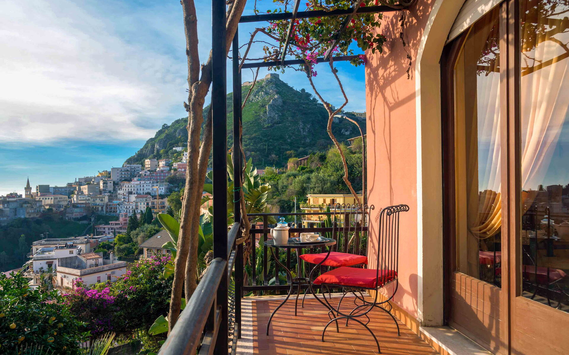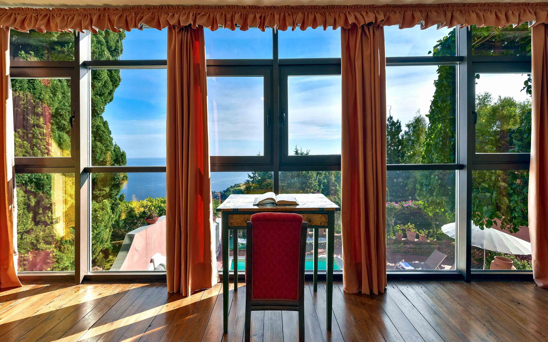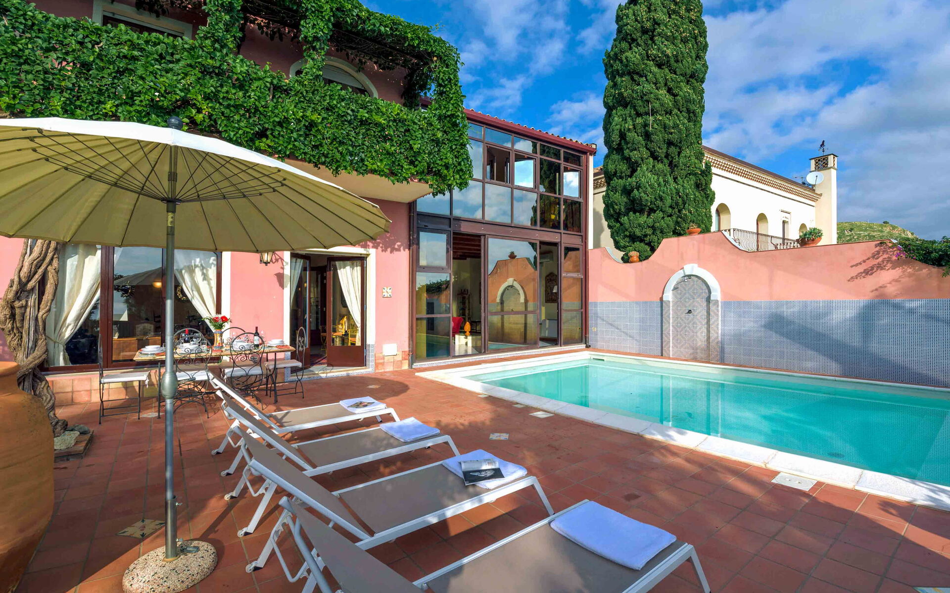 Villa La Boheme è una panoramica villa con piscina situata nella splendida Taormina. La villa è il luogo perfetto per chi è alla ricerca di una vacanza all’insegna del relax ma allo stesso tempo vuole scoprire tutte le bellezze storiche, artistiche e architettoniche che la Sicilia può offrire ai suoi visitatori. La struttura è perfetta per essere usata come base di partenza per esplorare in pochi chilometri le zone circostanti, come le vicine spiagge di Mazzarò e dell’Isola Bella, Catania, i paesini del Parco dell’Etna, le gole dell’Alcantara ed i borghi marinari della Riviera dei Ciclopi. Ciò che rende unica villa La Boheme è la sua straordinaria vista sul mare cristallino circostante, una veduta che vi lascerà senza parole. La struttura è anche vicina ai luoghi d’interesse della bellissima Taormina, come il Teatro Antico, il Corso Umberto, le eleganti boutique del centro e ai vari ristoranti e locali serali che animano il suo centro storico. Villa La Boheme è inserita all’interno di uno splendido e rigoglioso giardino ricco di numerose piante tipiche di queste zone. Di fronte alla villa si trova la meravigliosa piscina (dimensioni 5mt x 7 mt, profondità min 1,50 mt - max 1,50 mt), perfettamente esposta al sole, dotata di sdraio, ombrelloni e doccia esterna, luogo ideale per rilassarsi e rinfrescarsi durante le giornate estive più calde. Vicino alla piscina troviamo anche una veranda dotata di tavolo da pranzo e sedie, perfetta per gustare i vostri pasti all’aria aperta con gli amici o con la famiglia.