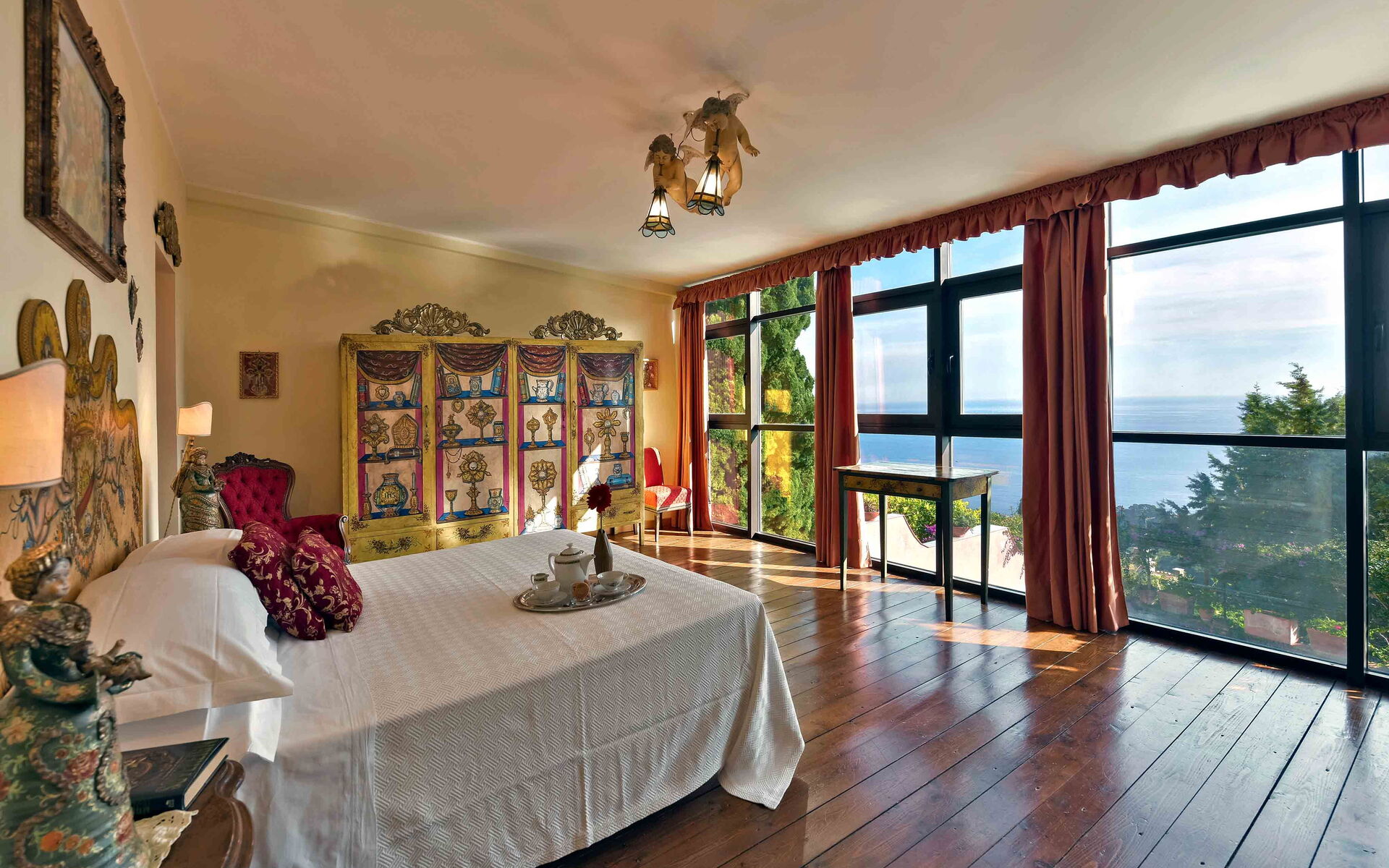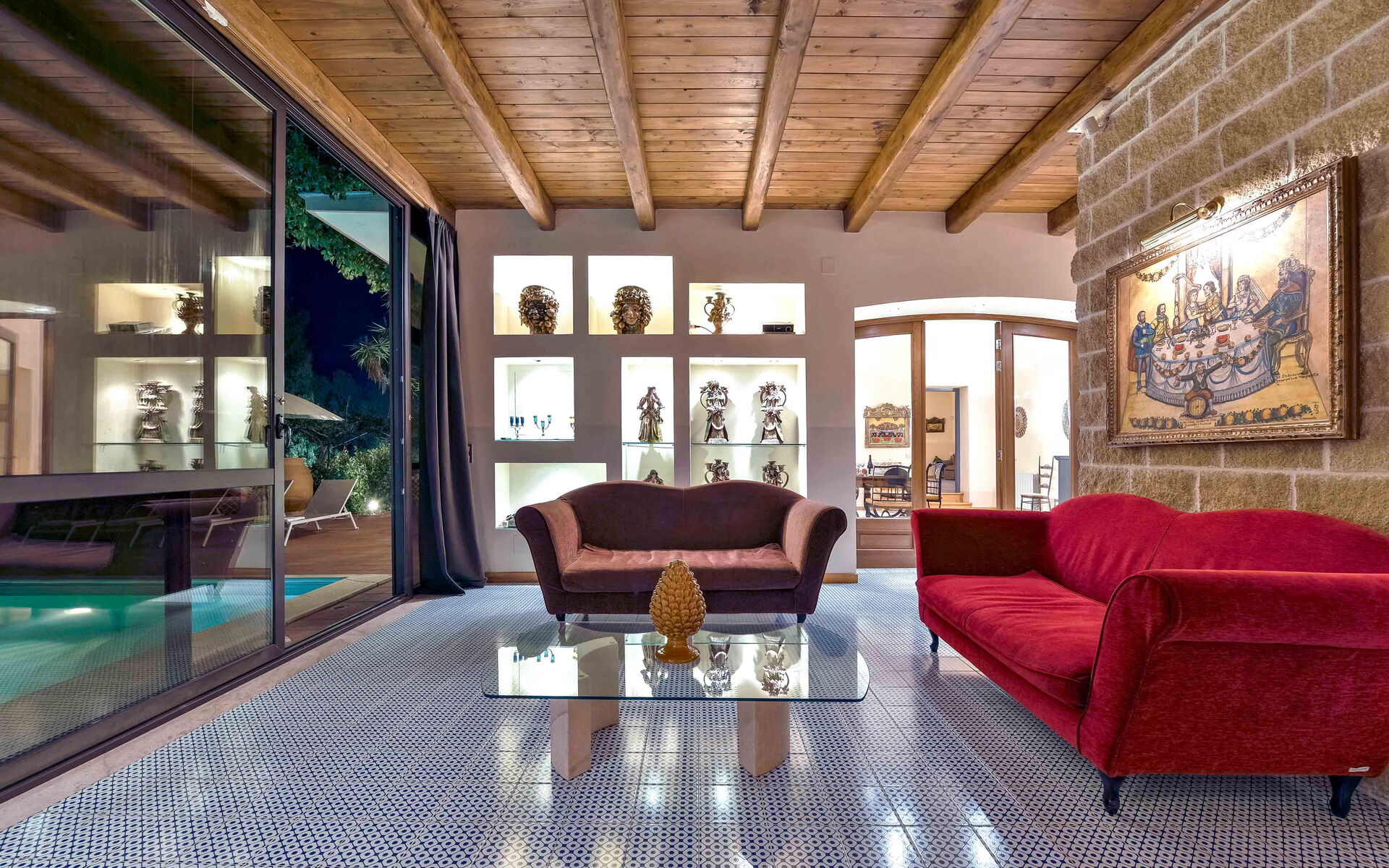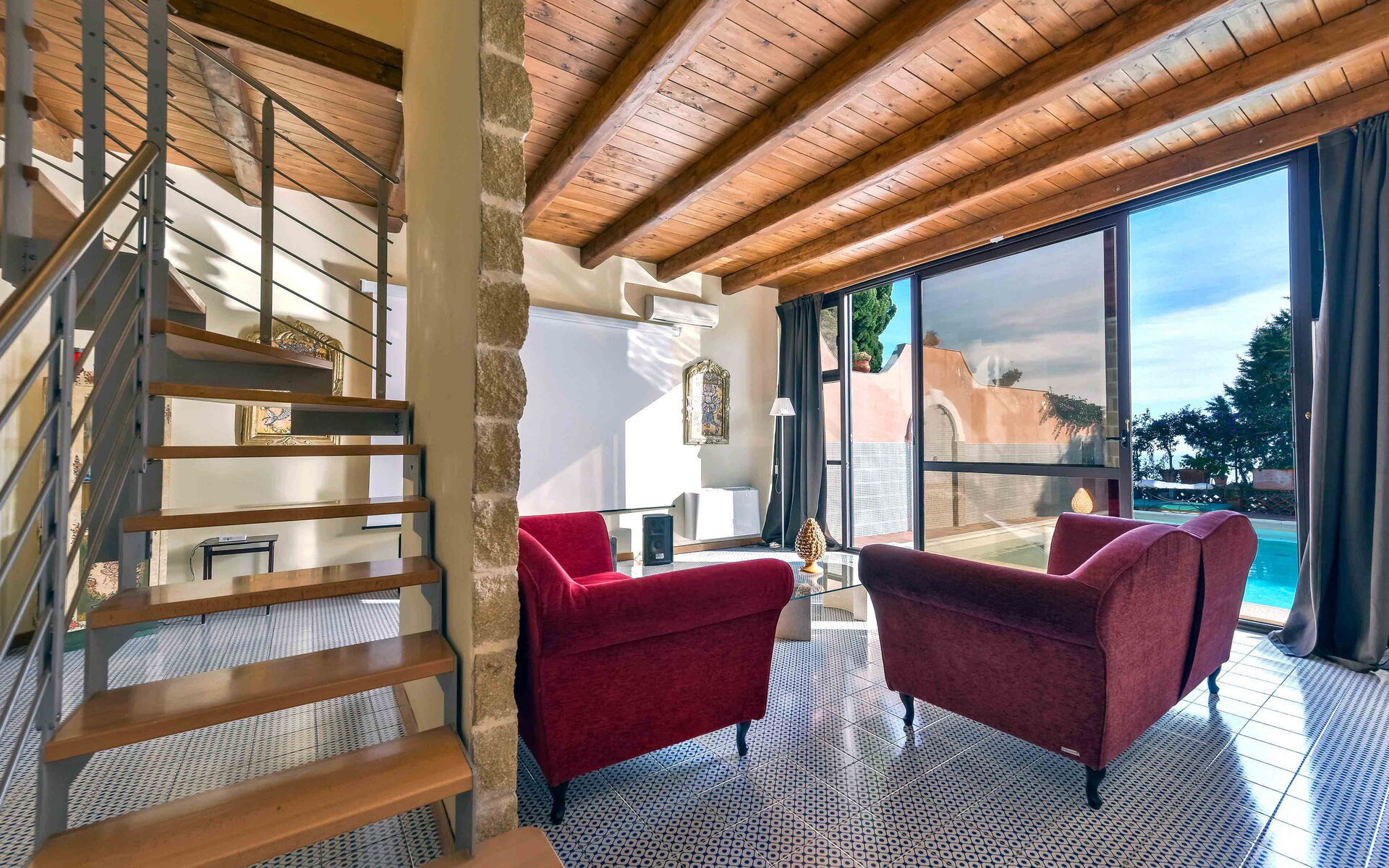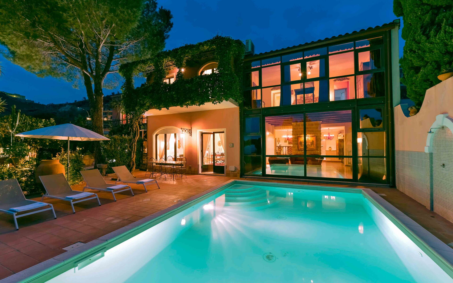Villa La Boheme può comodamente ospitare fino a 10 ospiti e si sviluppa su due livelli. Gli interni della villa sono stati sapientemente progettati in un bellissimo stile siciliano, utilizzando antiche ceramiche e mobili d’antiquariato, che donano alla villa eleganza e raffinatezza. A piano terra la villa si apre su un luminoso soggiorno dotato di divano, poltrona e TV maxi schermo, con delle belle vetrate con vista sulla piscina. Proseguendo oltre troviamo un salotto completo di un bellissimo camino ornamentale, divani, uno studio, una piccola sala da tè e una sala da pranzo dotata di tavolo e sedie. Procedendo oltre vi è la cucina, completamente equipaggiata e dotata di: frigo e freezer, forno microonde, forno, tostapane, bollitore, macchina per caffè americano, macchina per caffè espresso, lavastoviglie, frullatore e piano cottura. Completano il piano terra una camera matrimoniale con bagno en-suite con doccia, e un bagno di servizio. Salendo al piano superiore, percorrendo una scalinata che sale dalla zona living e che collega i due livelli, si accede alla zona notte. Al primo piano si trovano una splendida camera matrimoniale con una vista mozzafiato sul panorama circostante, dotata di bagno en-suite con vasca da bagno, una seconda camera matrimoniale, un bagno con doccia, una camera matrimoniale dotata di bagno en-suite con doccia, e una camera doppia completa di bagno en-suite con doccia.
