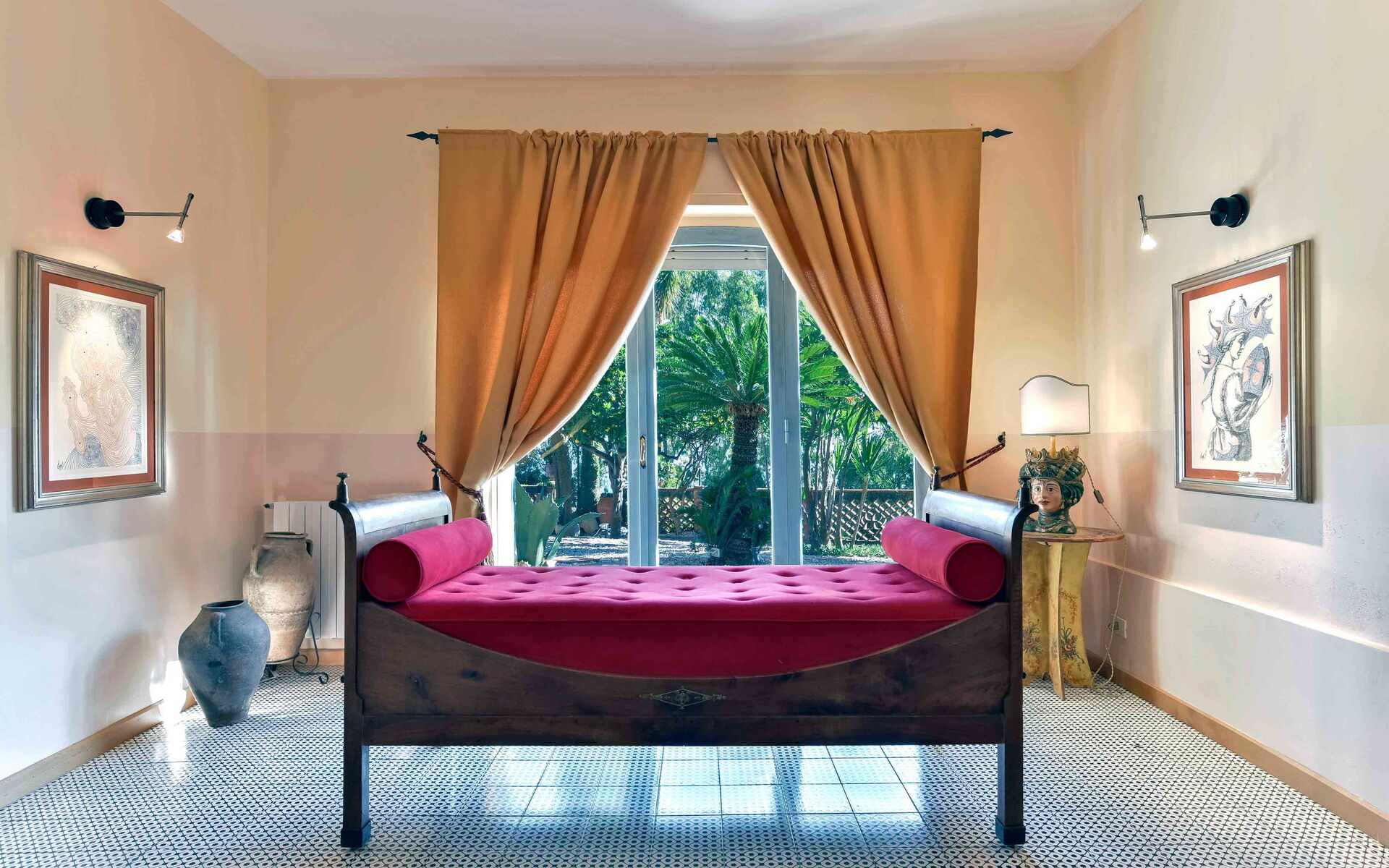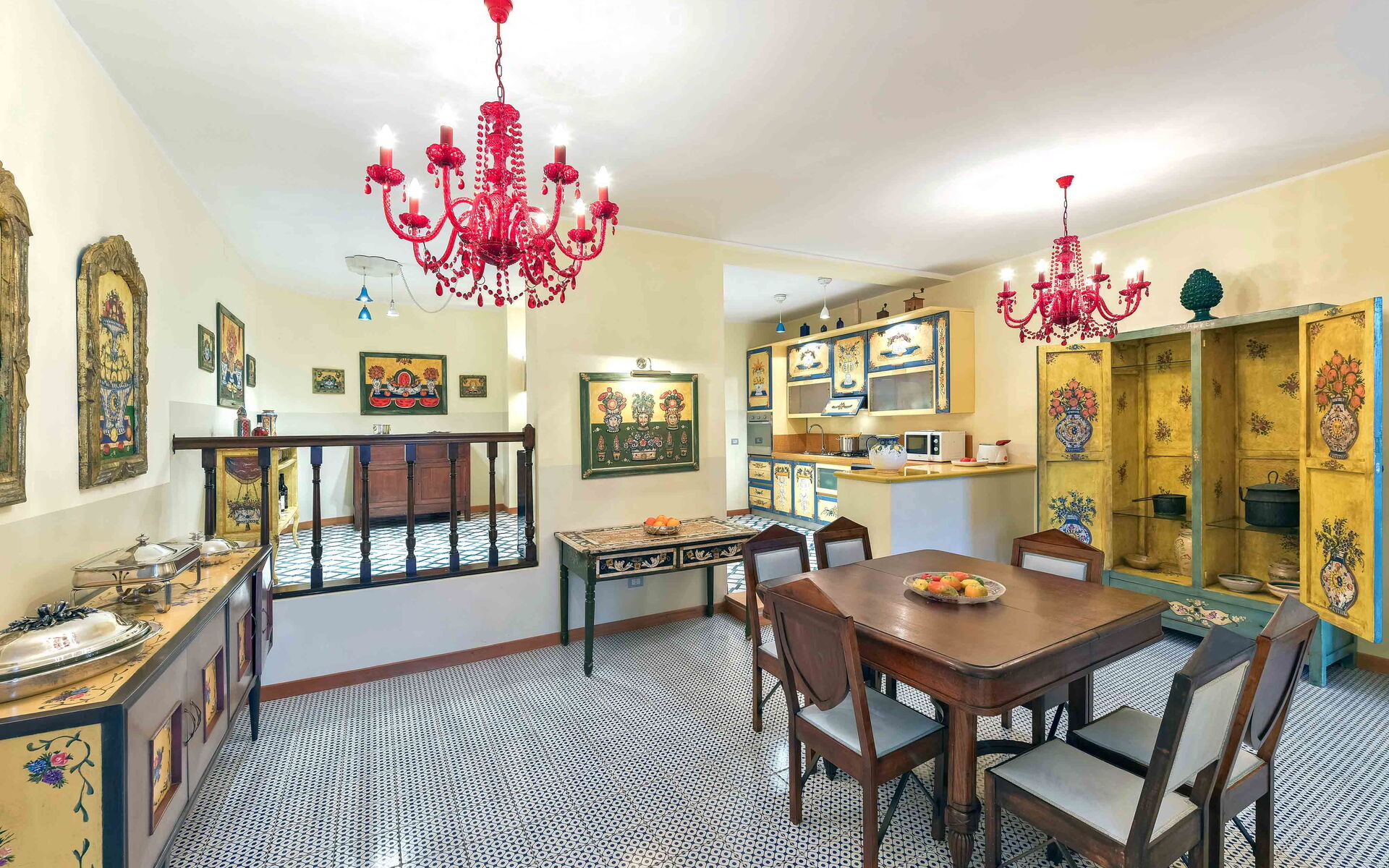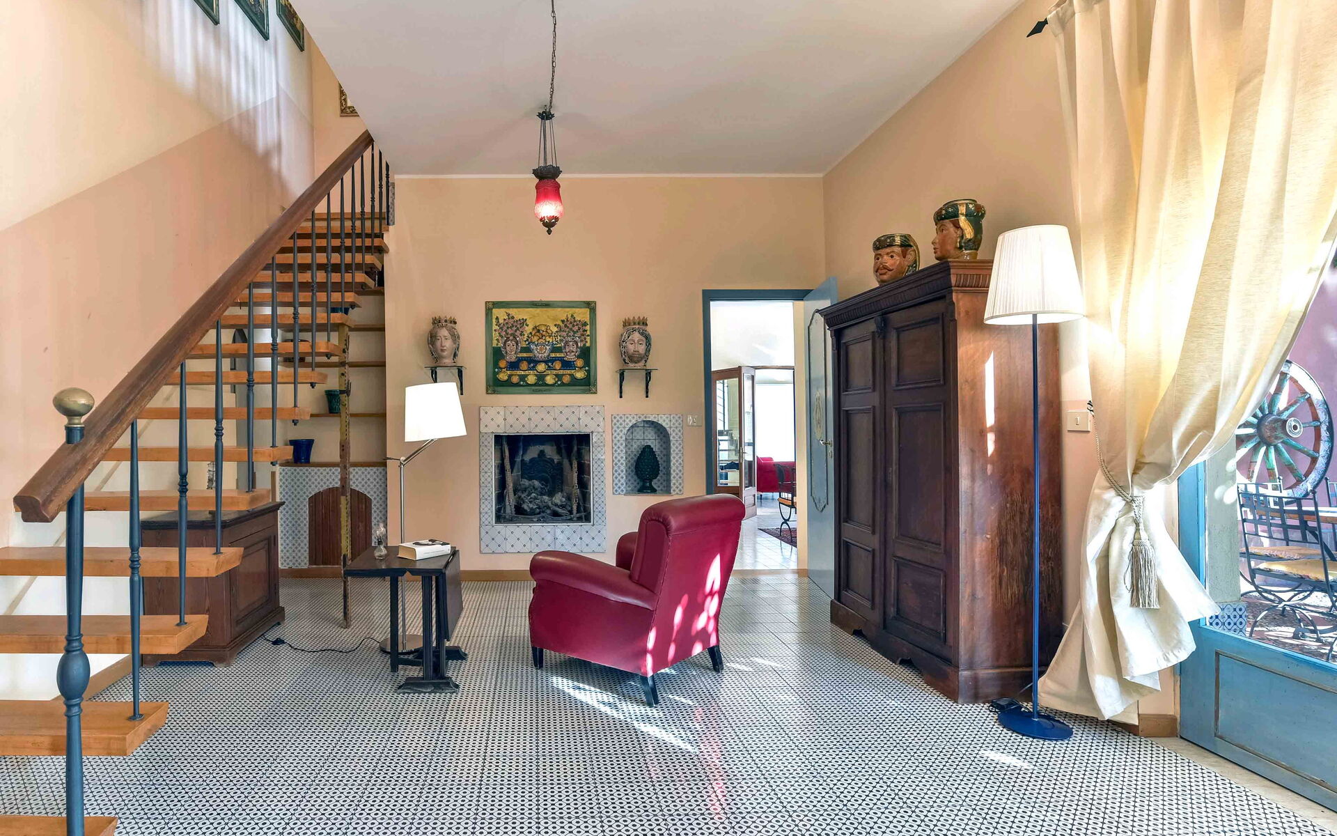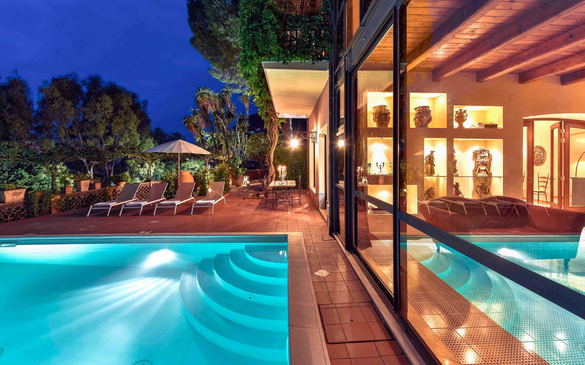 Villa La Boheme può comodamente ospitare fino a 10 ospiti e si sviluppa su due livelli. Gli interni della villa sono stati sapientemente progettati in un bellissimo stile siciliano, utilizzando antiche ceramiche e mobili d’antiquariato, che donano alla villa eleganza e raffinatezza. A piano terra la villa si apre su un luminoso soggiorno dotato di divano, poltrona e TV maxi schermo, con delle belle vetrate con vista sulla piscina. Proseguendo oltre troviamo un salotto completo di un bellissimo camino ornamentale, divani, uno studio, una piccola sala da tè e una sala da pranzo dotata di tavolo e sedie. Procedendo oltre vi è la cucina, completamente equipaggiata e dotata di: frigo e freezer, forno microonde, forno, tostapane, bollitore, macchina per caffè americano, macchina per caffè espresso, lavastoviglie, frullatore e piano cottura. Completano il piano terra una camera matrimoniale con bagno en-suite con doccia, e un bagno di servizio. Salendo al piano superiore, percorrendo una scalinata che sale dalla zona living e che collega i due livelli, si accede alla zona notte. Al primo piano si trovano una splendida camera matrimoniale con una vista mozzafiato sul panorama circostante, dotata di bagno en-suite con vasca da bagno, una seconda camera matrimoniale, un bagno con doccia, una camera matrimoniale dotata di bagno en-suite con doccia, e una camera doppia completa di bagno en-suite con doccia.