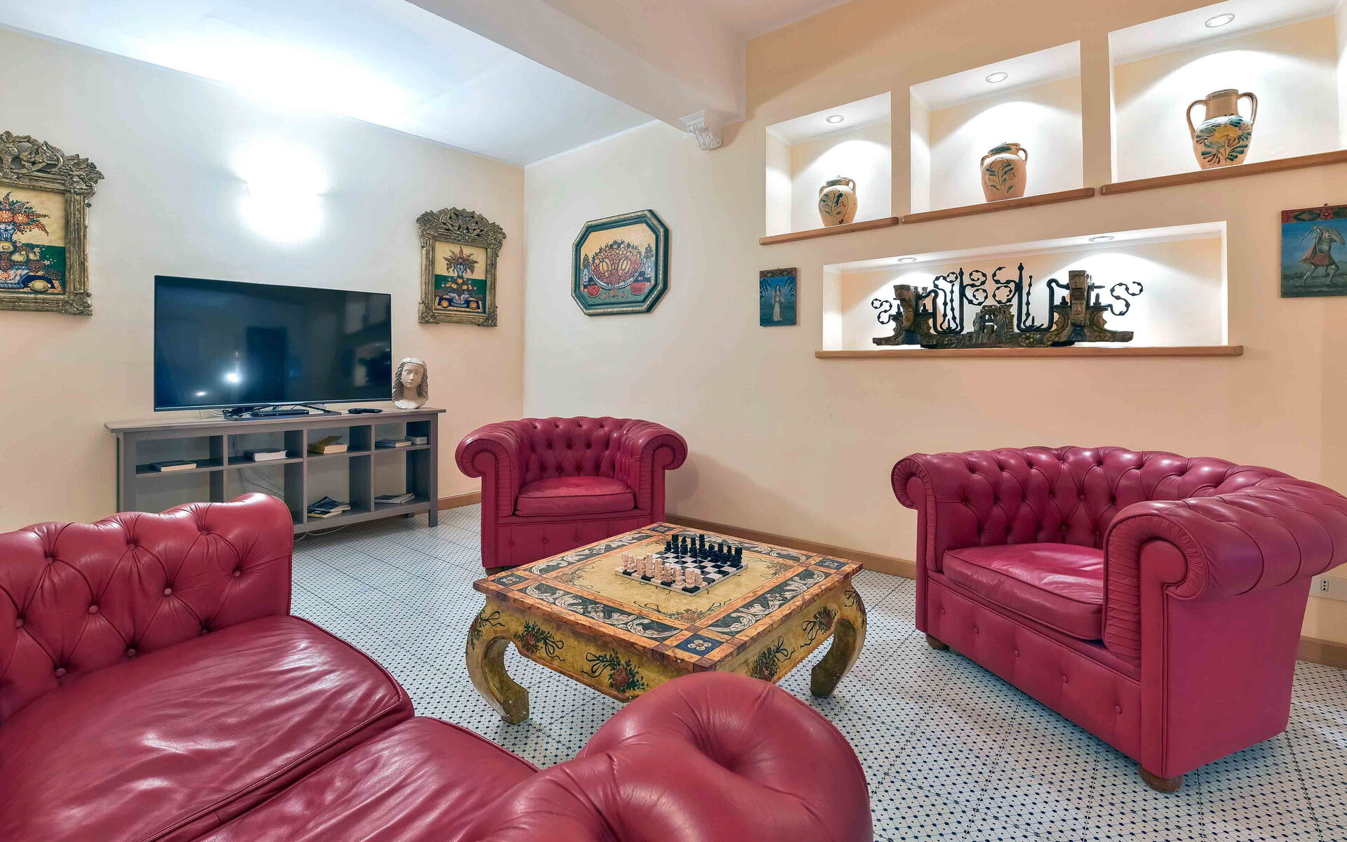 - Ampio soggiorno con TV, divano e poltrona.