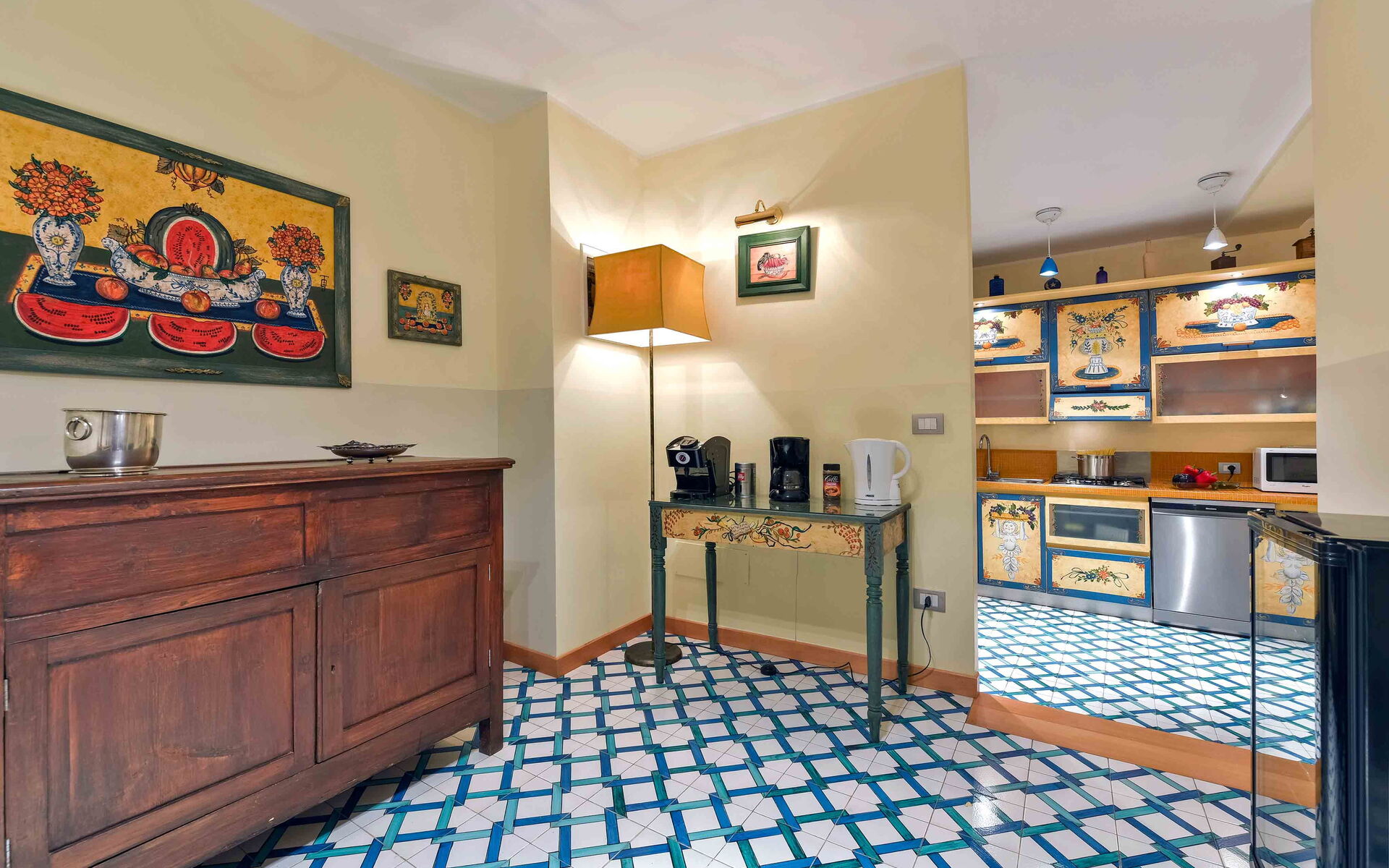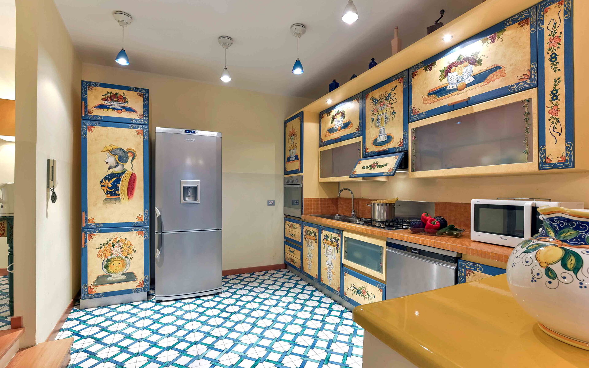 - Cucina completamente equipaggiata e completa di: frigo e freezer, forno microonde, forno, tostapane, bollitore, macchina per caffè americano, macchina per caffè espresso, lavastoviglie, frullatore e piano cottura.