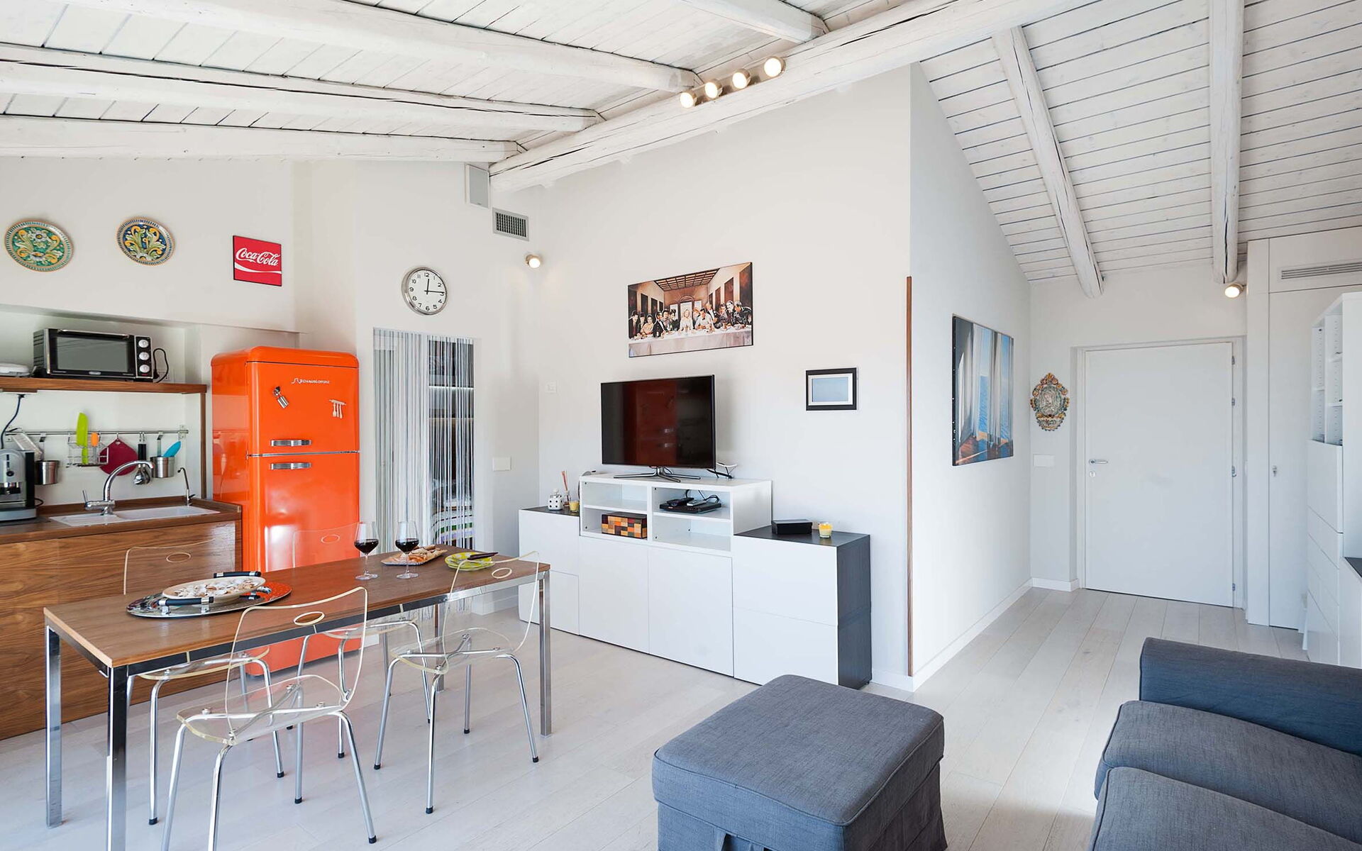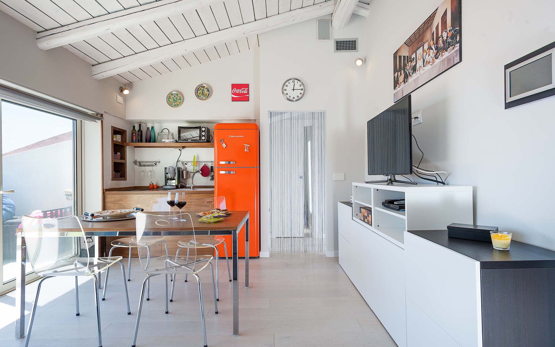 - Soggiorno open space dotato di divano, Tv, tavolo da pranzo con sedie, e cucina, completamente equipaggiata e dotata di: frigorifero, freezer, macchinetta per caffè espresso, forno elettrico, forno microonde, fuochi elettrici, lavastoviglie e tostapane.