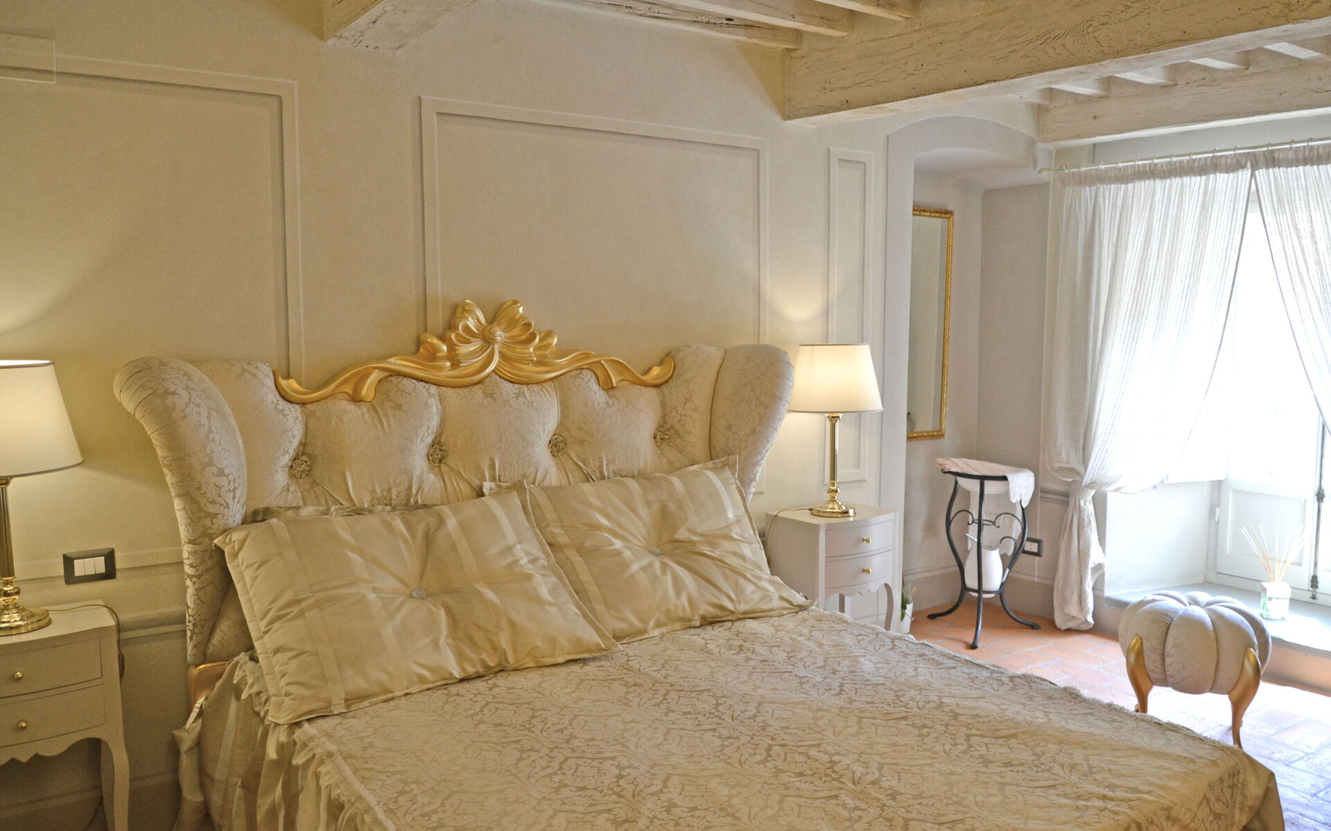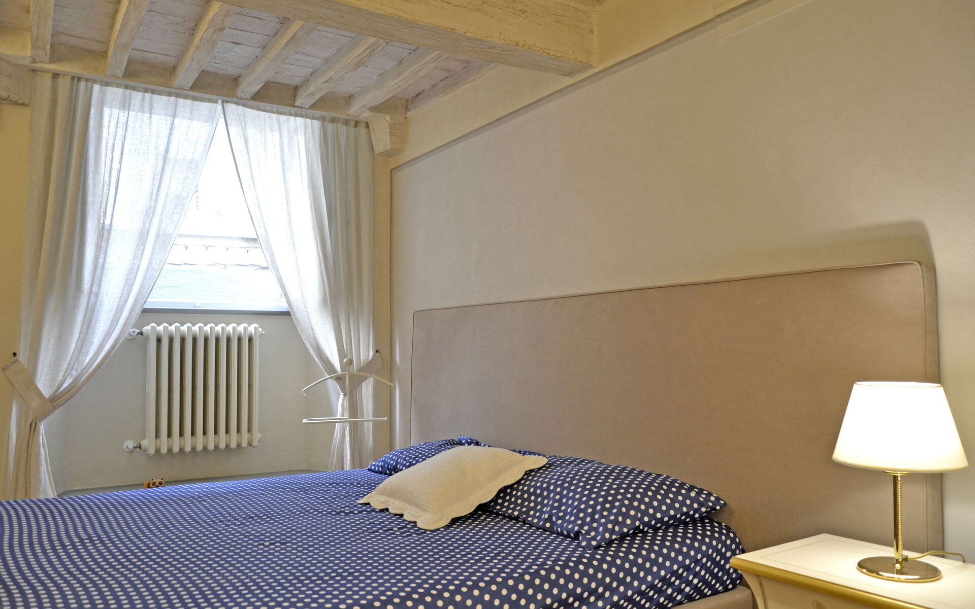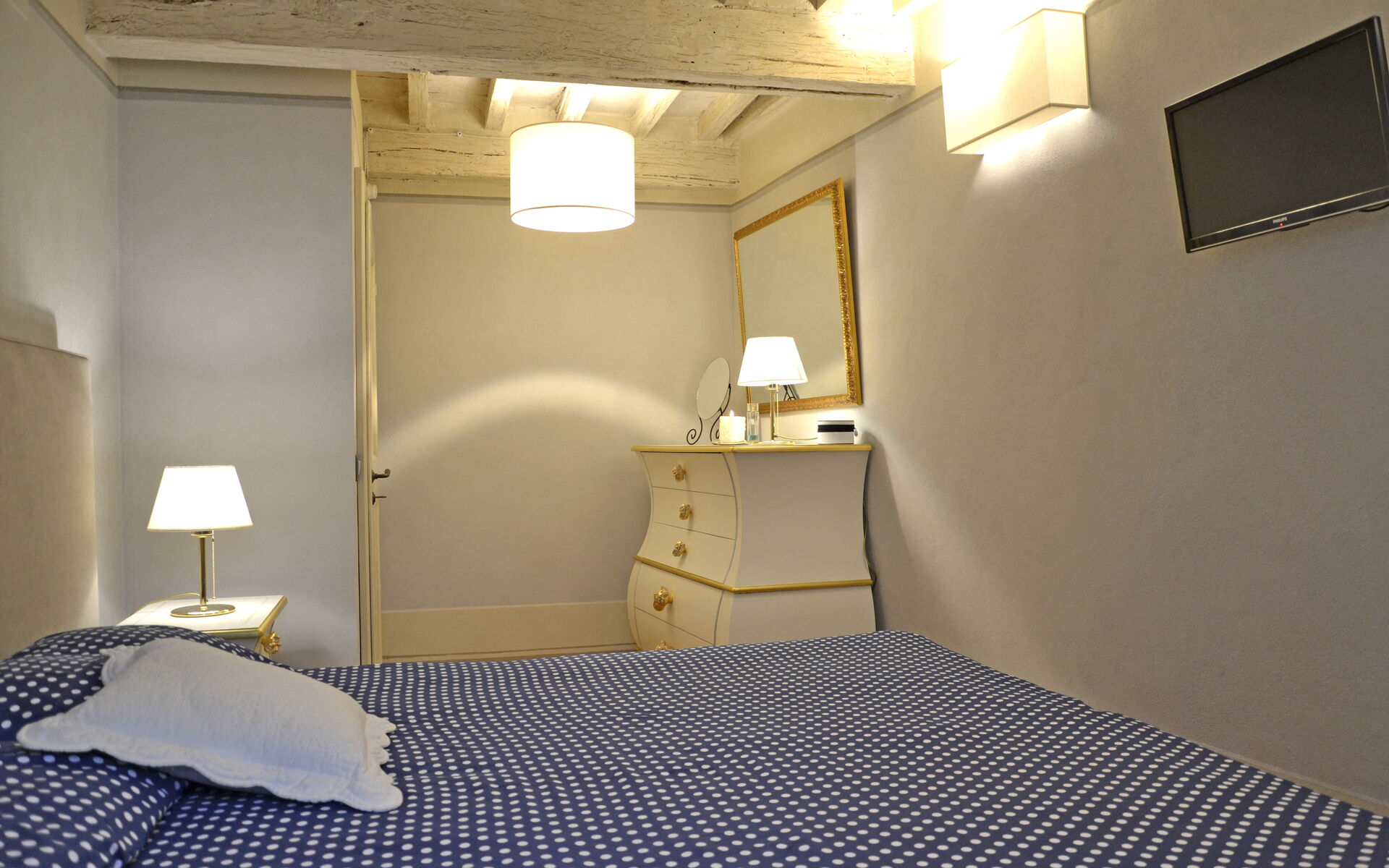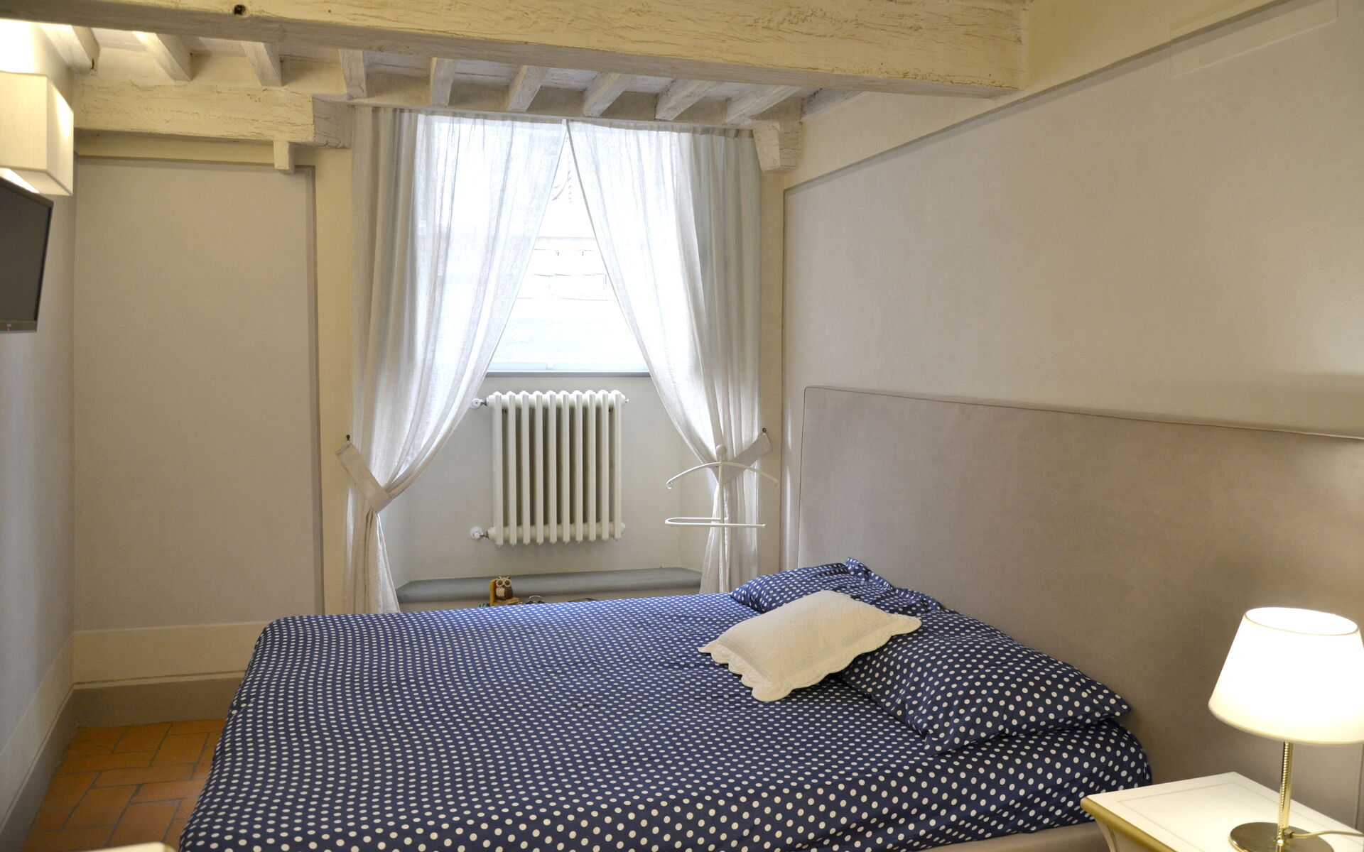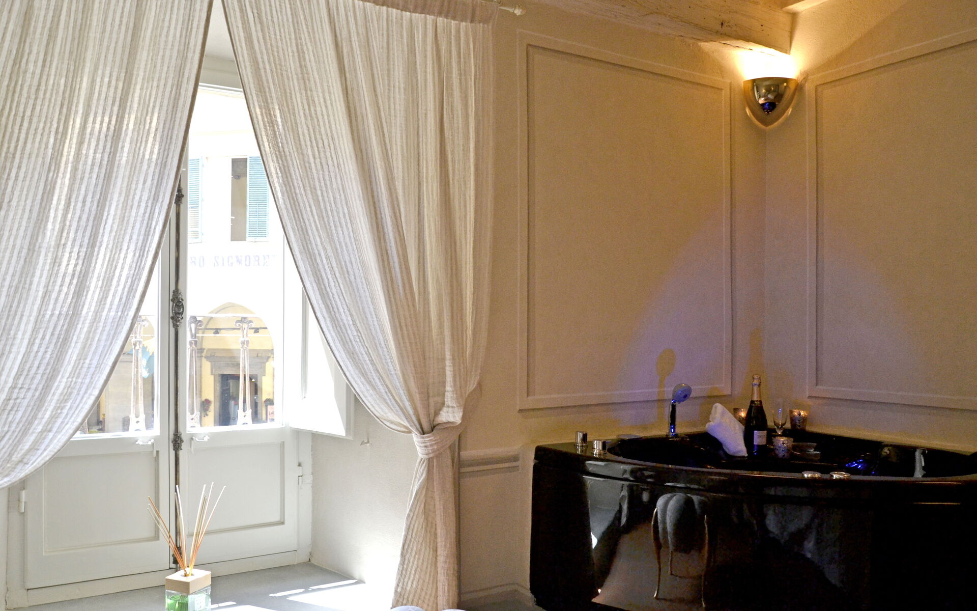 Dal soggiorno si accede anche alla zona notte composta da 2 camere e da 1 bagno. La prima delle due camere è una romantica camera matrimoniale composta da un letto matrimoniale, da un guardaroba e da una bellissima vasca idromassaggio a vista. La camera gode anche dell'affaccio su Piazza Signorelli.