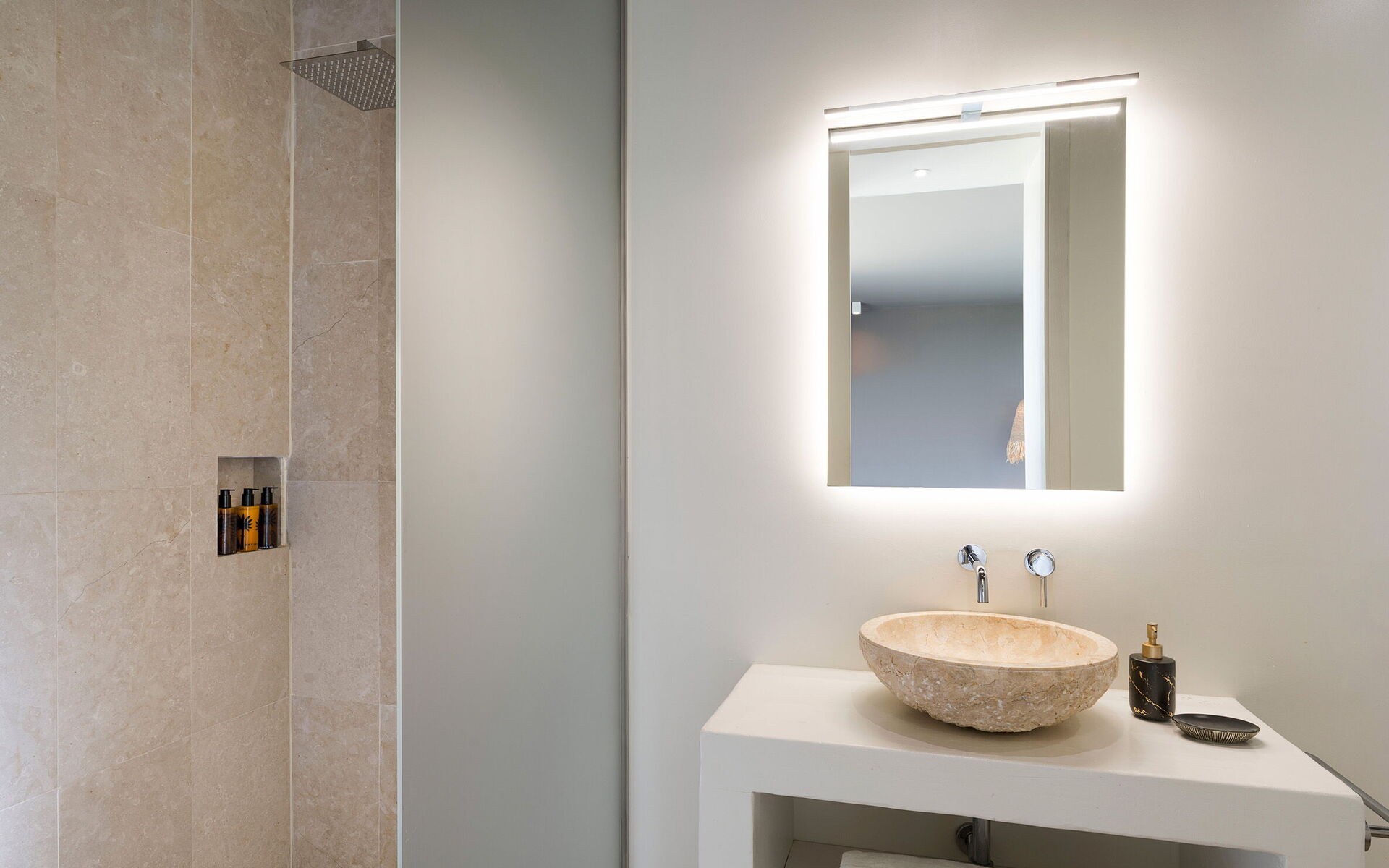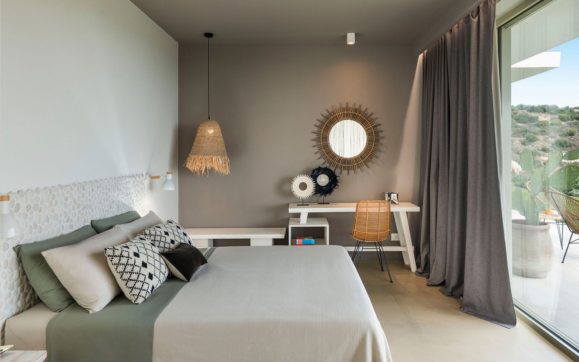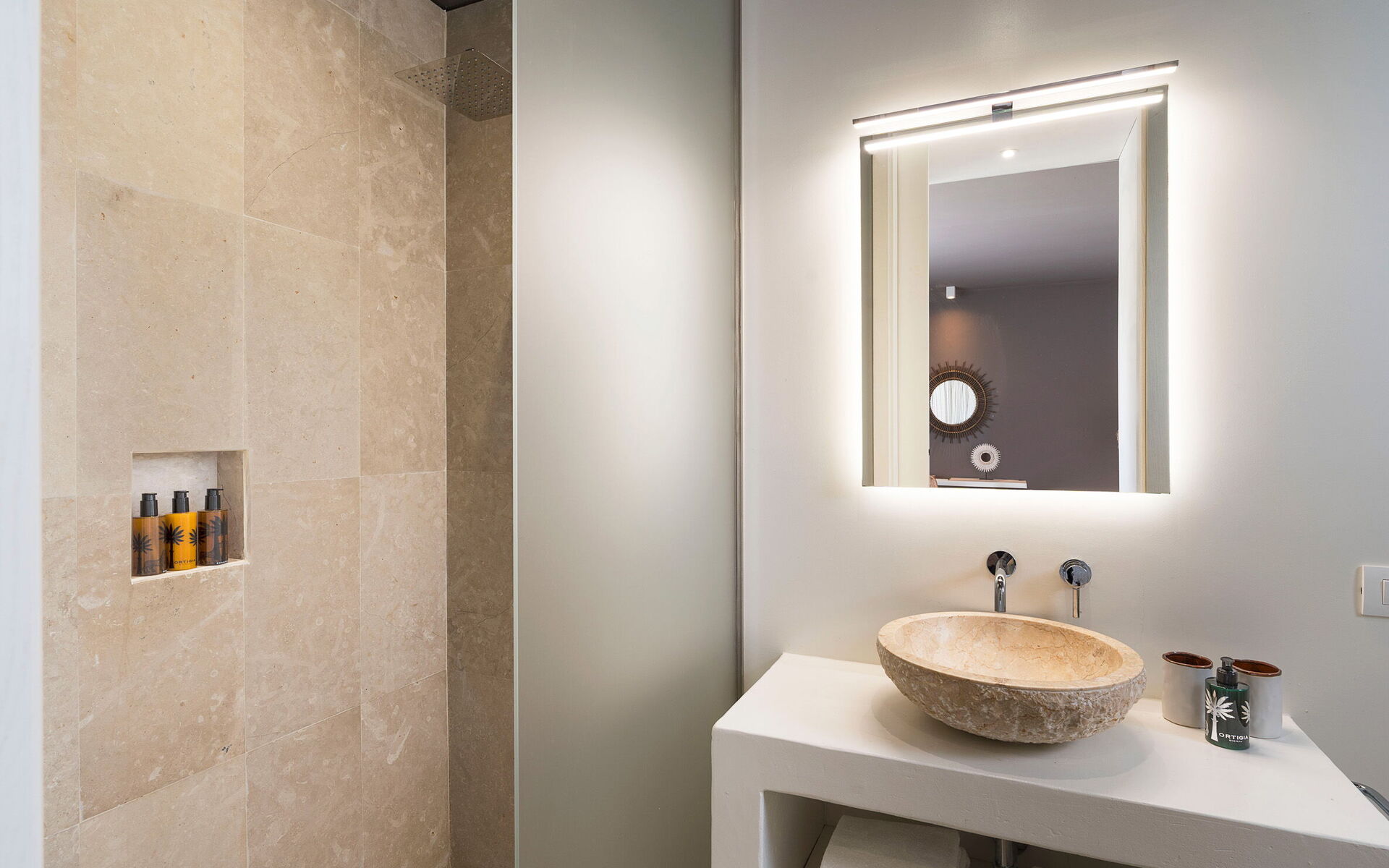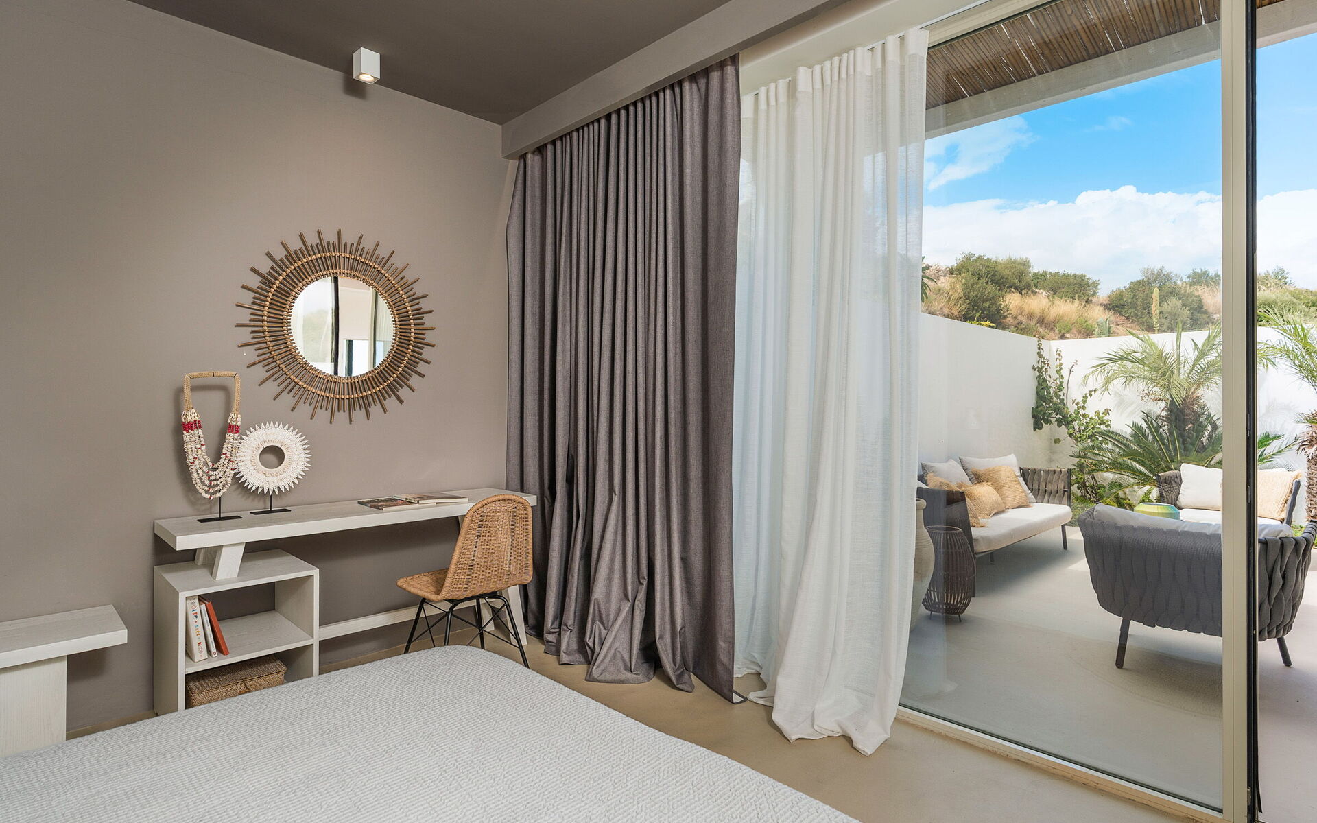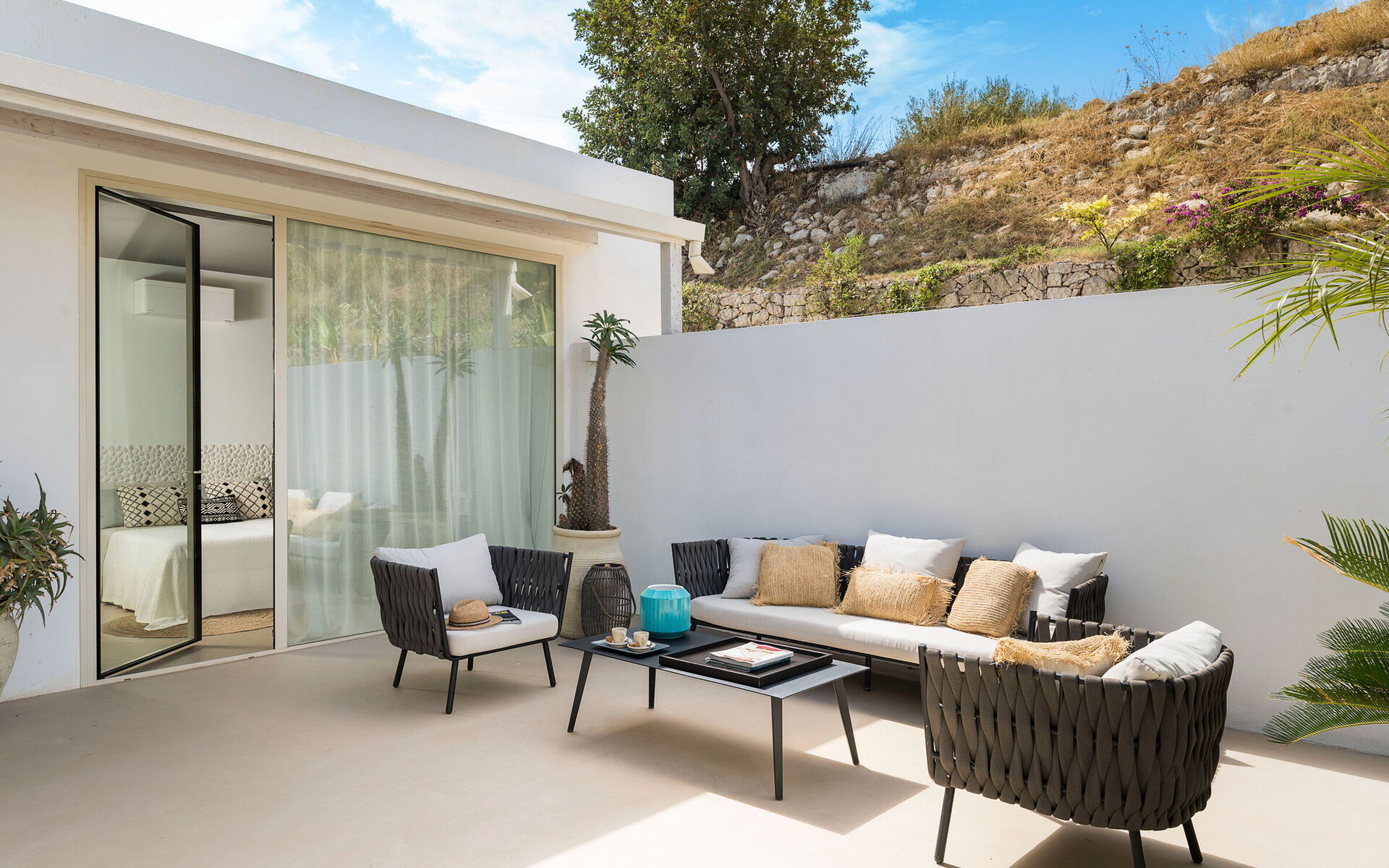 Inside, Villa Petite Afrique features welcoming, bright, and well-appointed interiors all on one level, offering comfort for up to 6 guests across 3 bedrooms and 3 bathrooms. The main living area includes a large living room with lounge and dining space, and a fully equipped kitchen — perfect for social gatherings and everyday living. There is one double bedroom with an en-suite bathroom connected to the living space, and two additional double bedrooms (one convertible to twin beds) accessed from the outside, each with its own en-suite shower room. The villa is equipped with air conditioning in all rooms, Wi-Fi, Smart TV, Hi-Fi system, dishwasher, washing machine and other modern comforts, ensuring a pleasant stay.