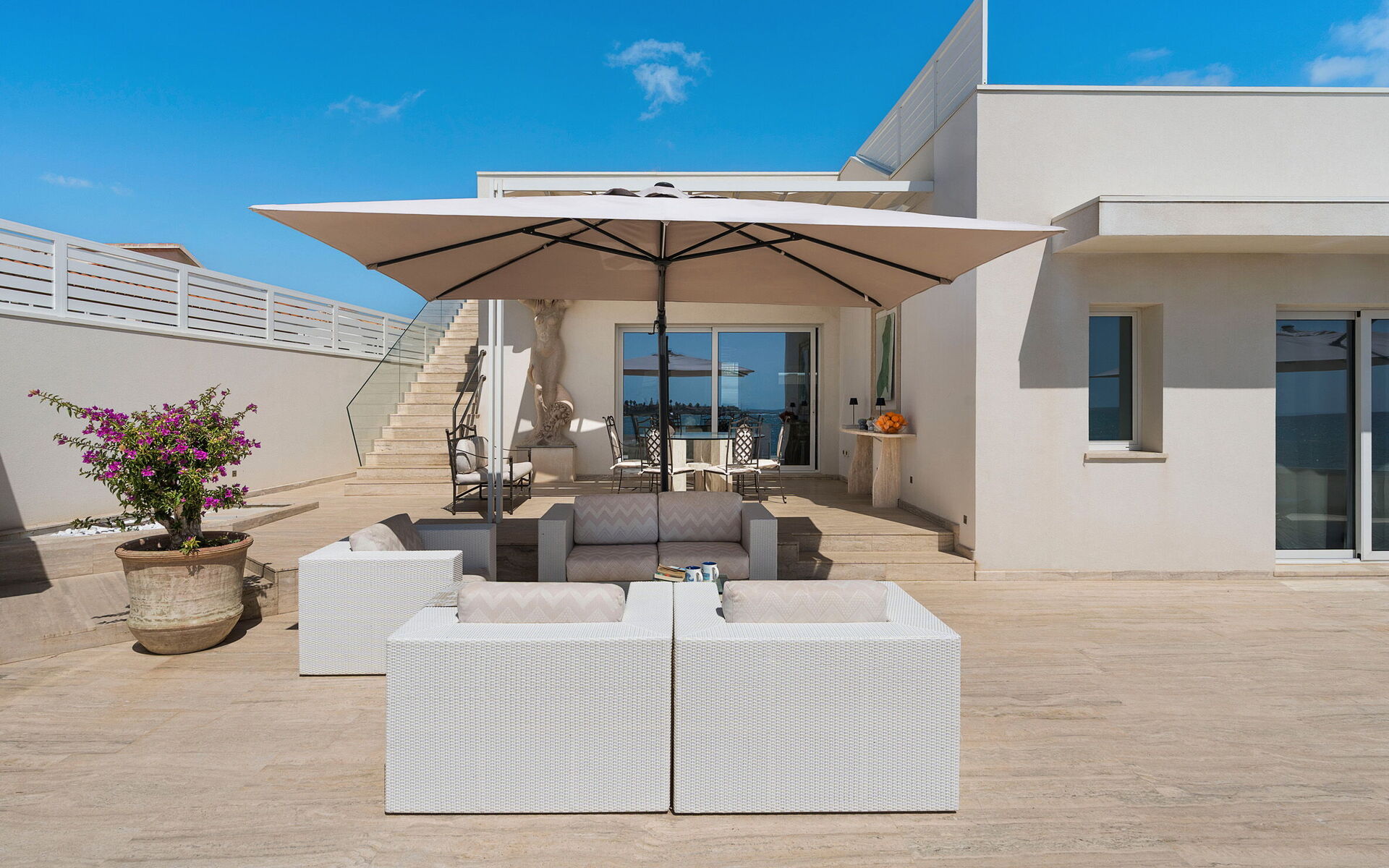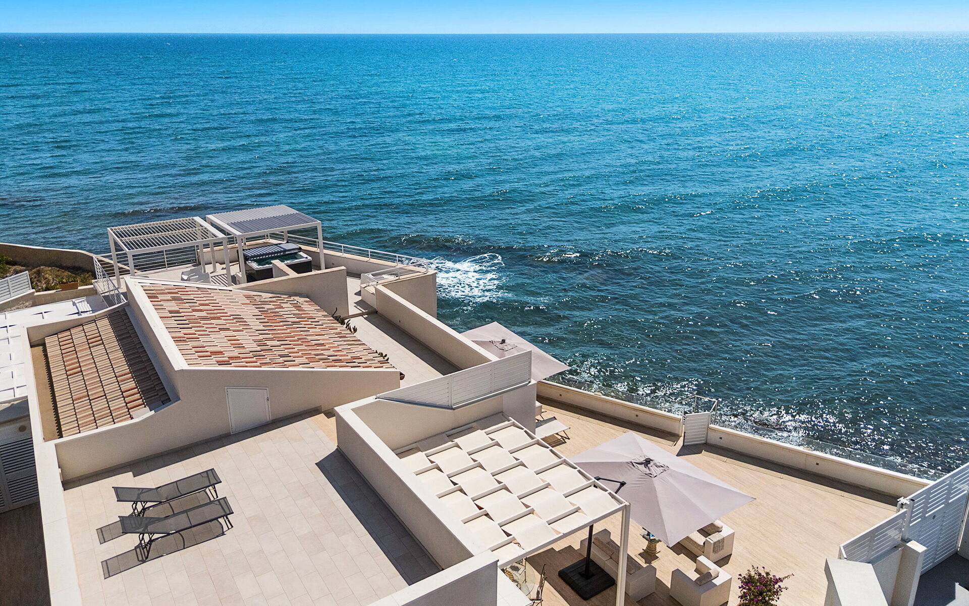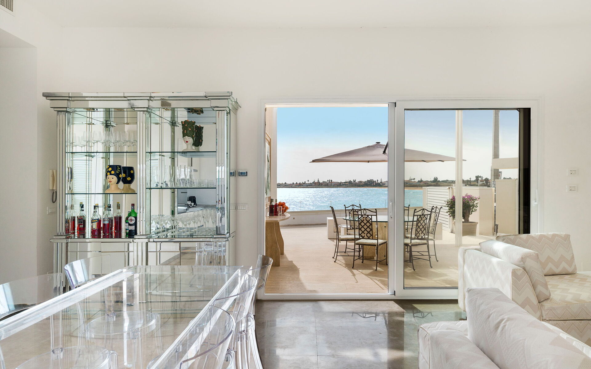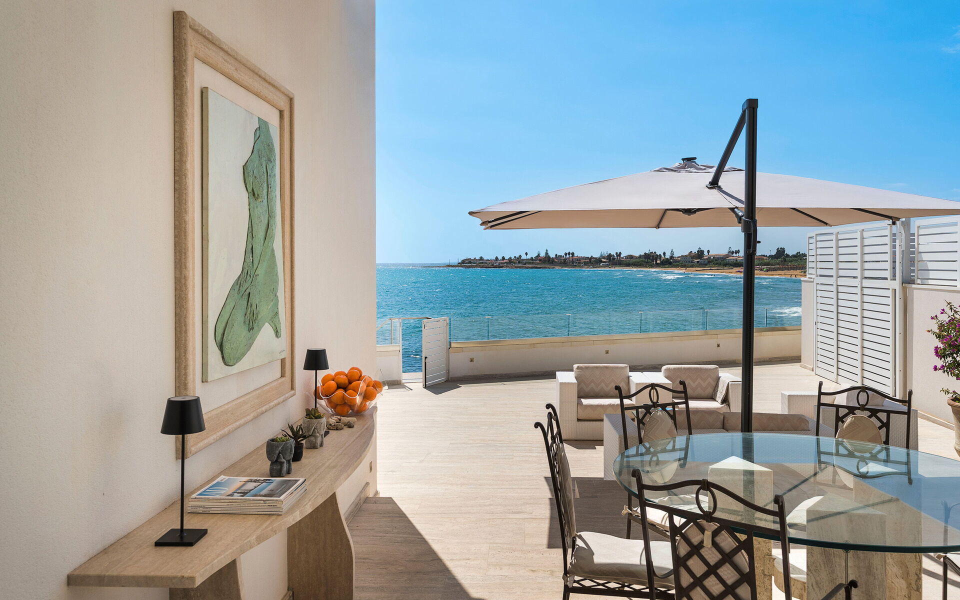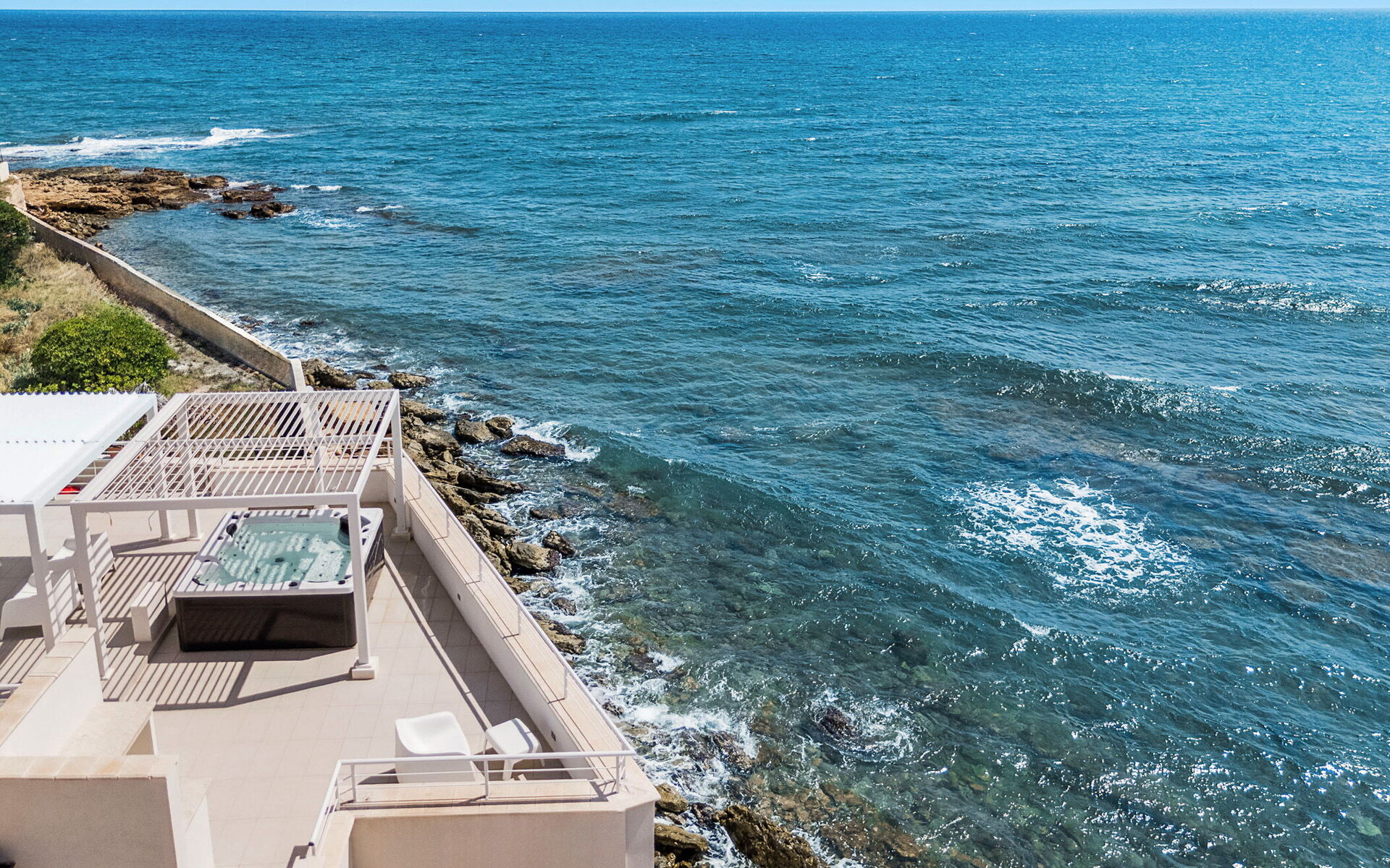 Exclusive cliffside residence overlooking the sea in Avola, near Siracusa. Mare Dentro offers private access to the rocky coastline and the sea, and is located just over 100 meters from a beautiful sandy beach, easily reachable on foot. Recently built, the villa features a solarium and a spacious, fully furnished terrace, offering breathtaking views over the Avola coastline.