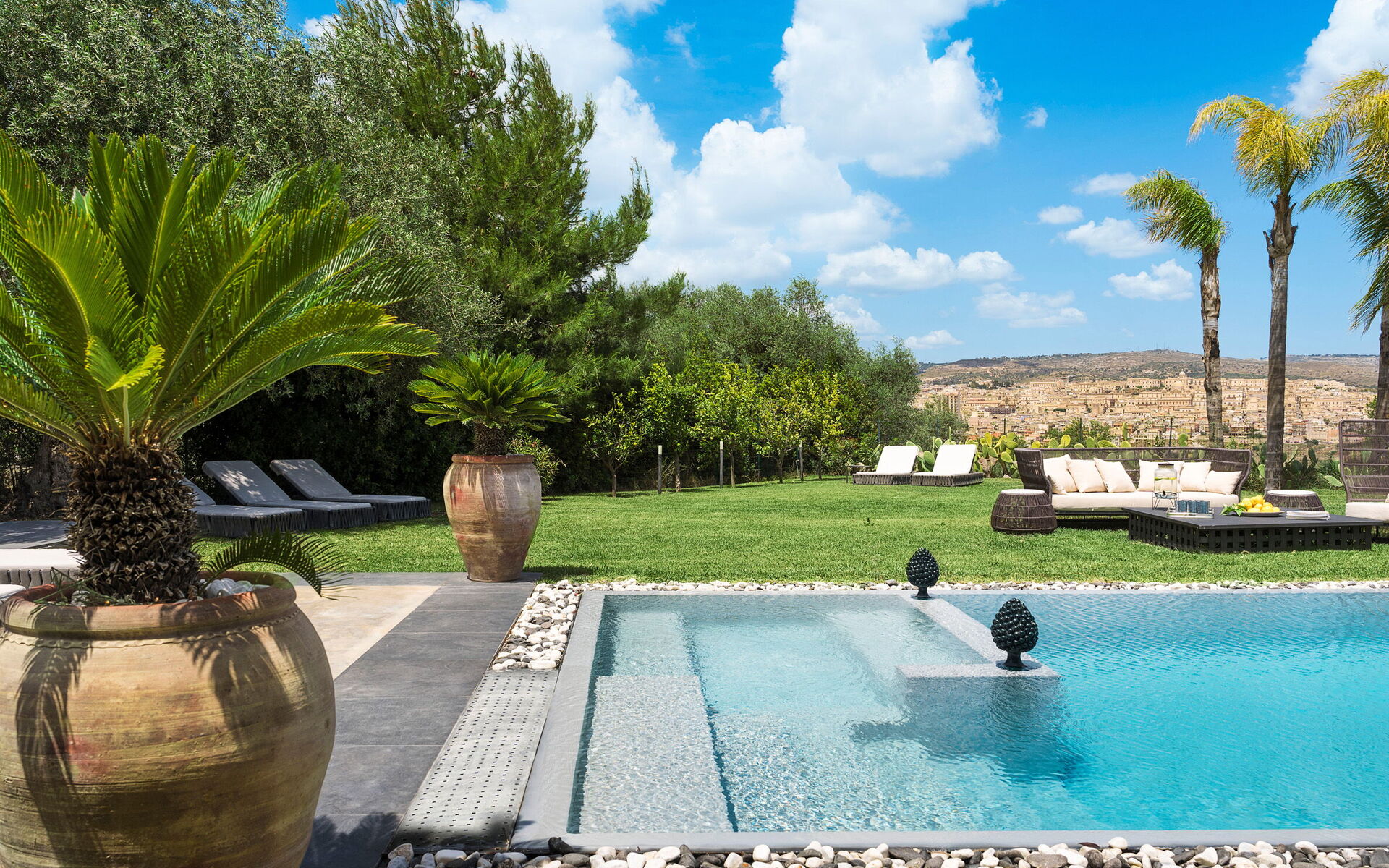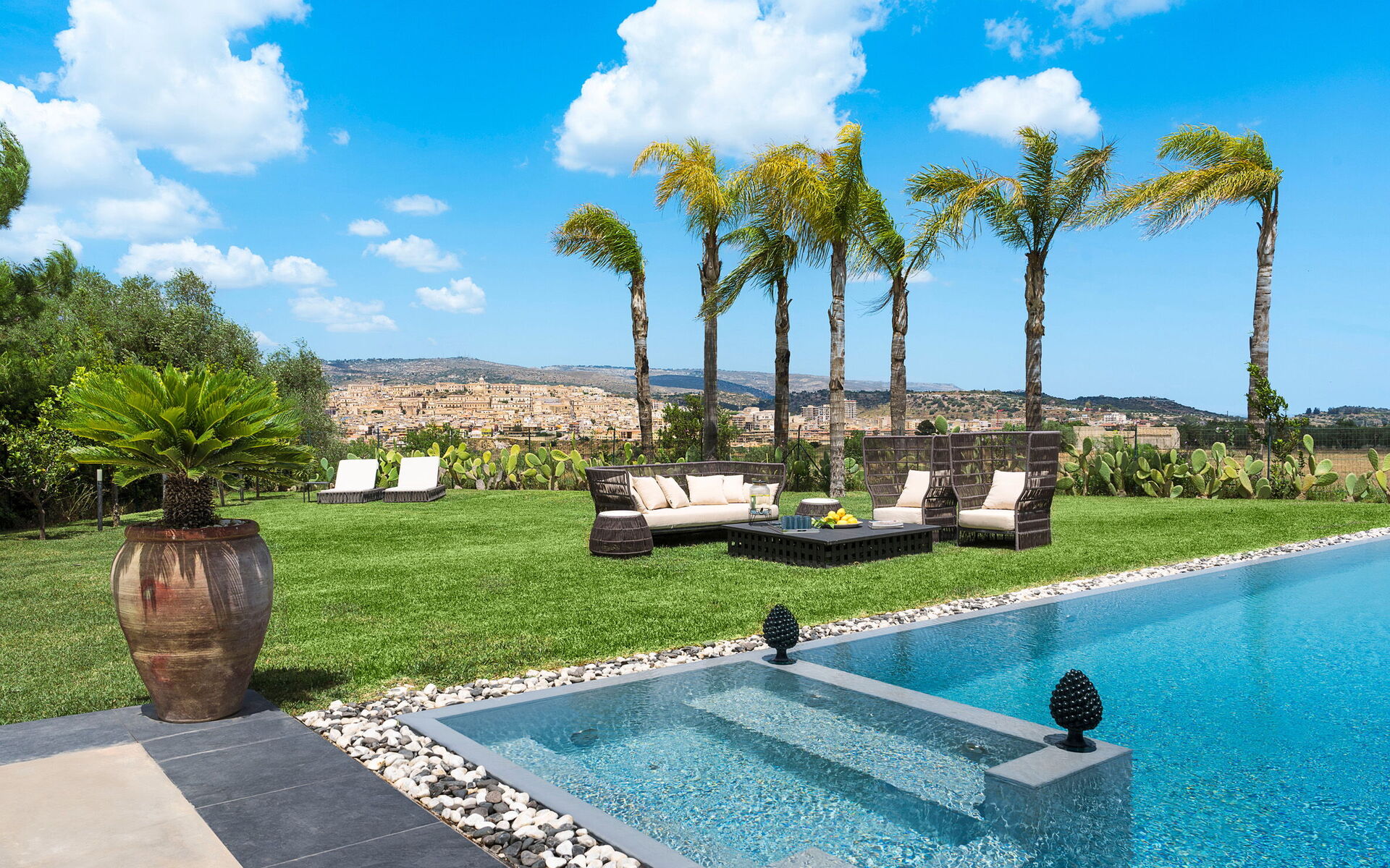 Villa Agnese is an exclusive residence with a private swimming pool, set in a panoramic location in the countryside surrounding Noto. Surrounded by a spacious garden with olive trees, aromatic and ornamental plants, the property also features a unique safari-style lodge tent housing a games room with a pool table, table football, and table tennis. Villa Agnese boasts a large private swimming pool with a hydromassage area, perfect for cooling off and enjoying moments of pure relaxation in complete privacy.