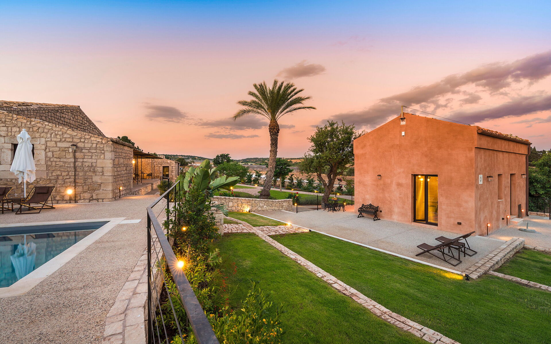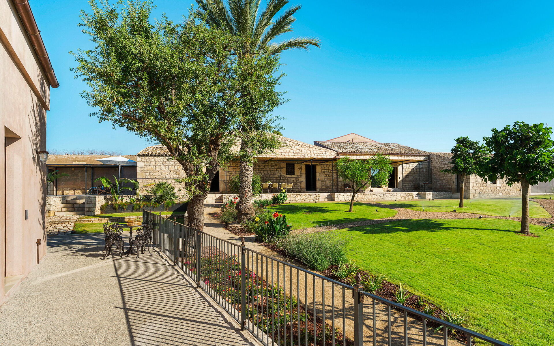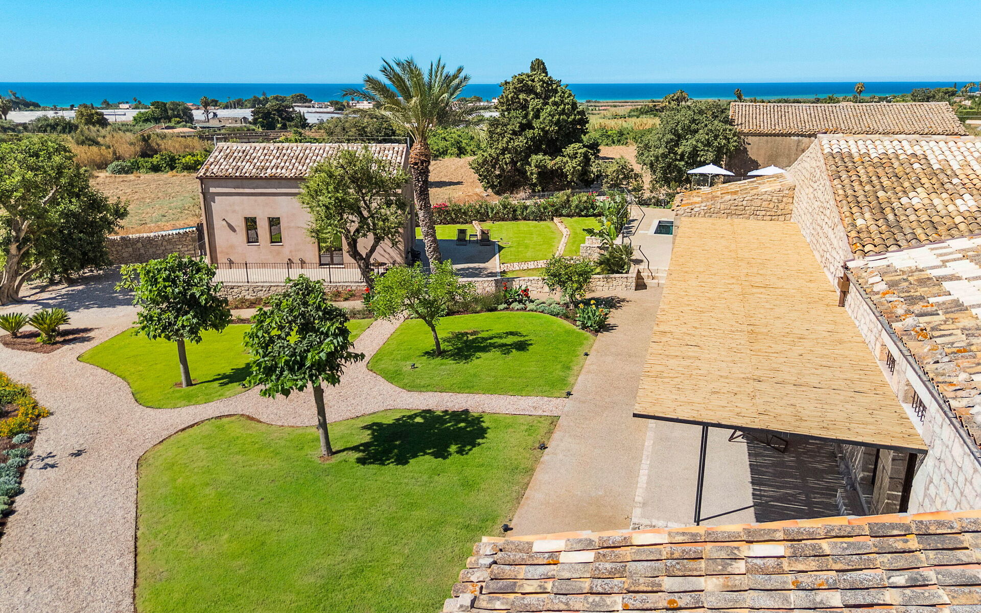The residence, recently renovated with great care, has preserved its original architectural features while offering refined and comfortable living spaces. The property consists of a main building and a separate dependance, ensuring generous space and an excellent layout. The main building includes a bright living room, a fully equipped kitchen, one double bedroom with en-suite shower room, a loft-style double/twin bedroom, and an additional bathroom with shower. Also within the main building, but with independent external access, there is another double bedroom with en-suite shower room, as well as a suite featuring a living area with kitchenette and a double/twin bedroom with en-suite shower room. The dependance houses the fifth double bedroom with en-suite shower room and a cozy living area with a small kitchen, offering additional privacy and comfort. All beds are king size (180/90 x 200 cm). The interiors are spacious and fully equipped with modern amenities, including air conditioning throughout, Wi-Fi, two smart TVs, washing machine, dryer, dishwasher, electric oven, microwave, three refrigerators, three espresso coffee machines, barbecue, outdoor shower, and private parking. The location is ideal for exploring some of south-eastern Sicily’s most charming destinations, such as the baroque towns of Scicli, Modica and Ragusa Ibla, the seaside villages of Donnalucata and Marina di Ragusa, as well as Marzamemi, Noto and Syracuse to the north.