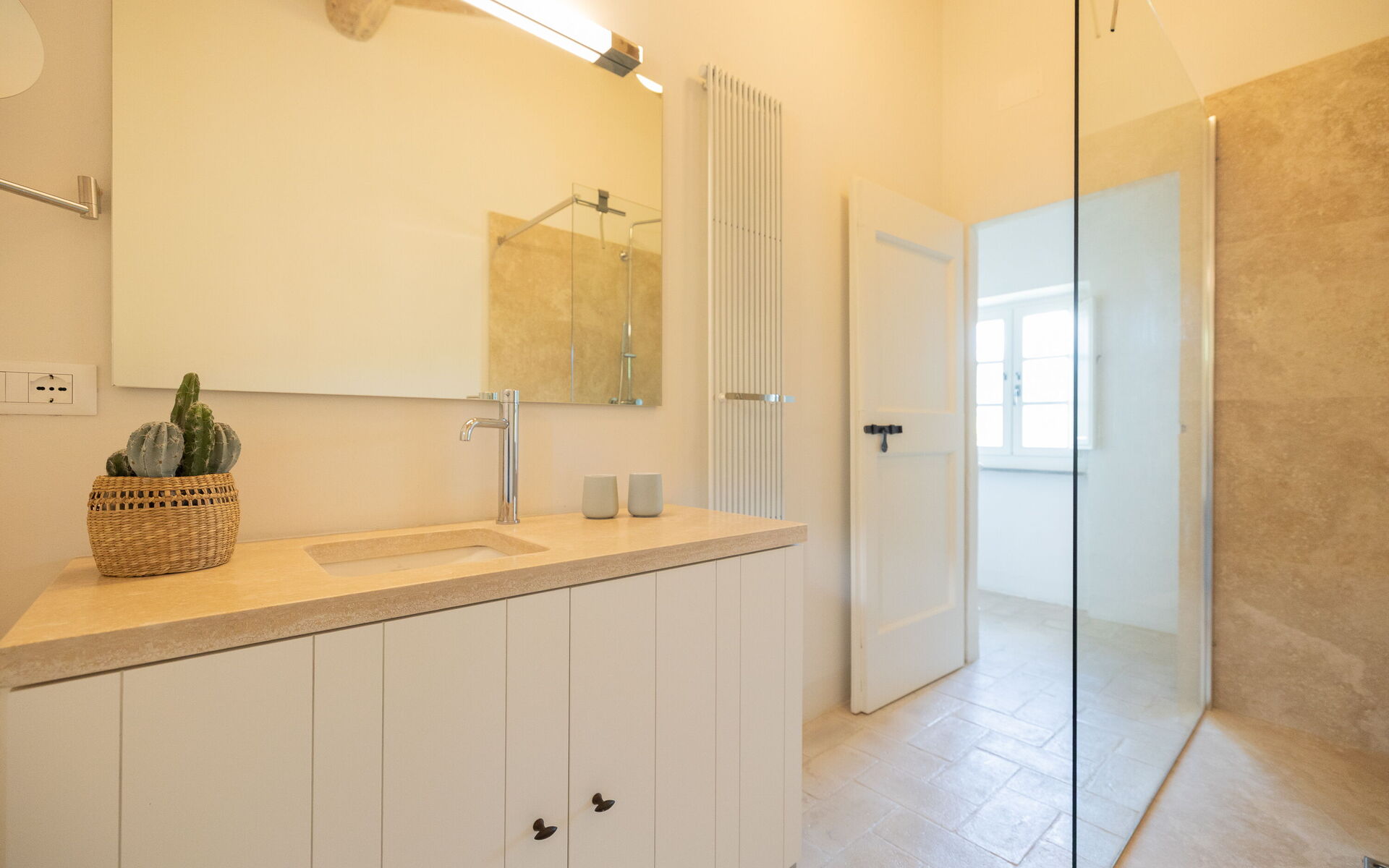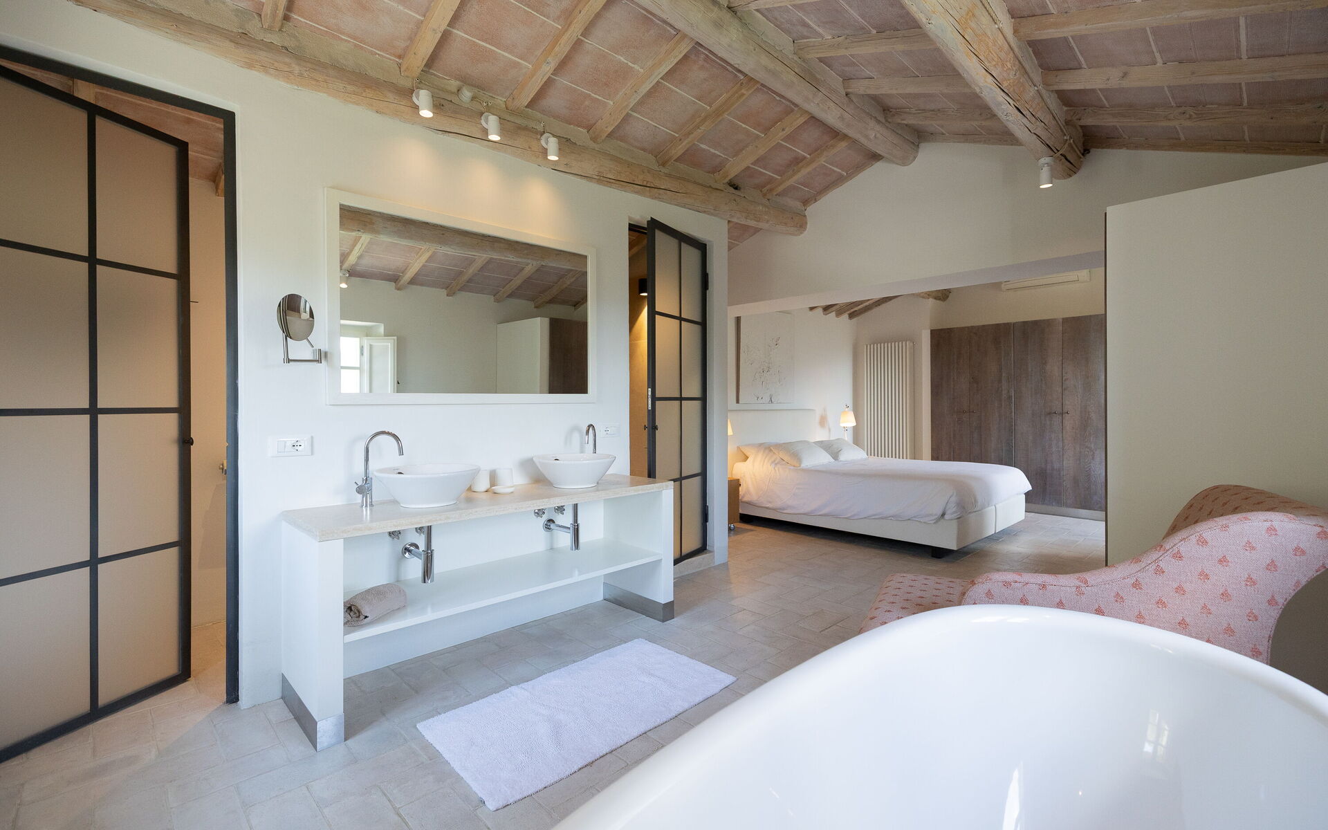 Going up the steps to the first floor you will find the sleeping area: you will be struck by the first of the three bedrooms, a beautiful suite with double bed, chaise longue and open bath in the room where you can spend moments of complete relaxation. The room also has a double washbasin in plain sight. The toilet and shower are divided by doors.