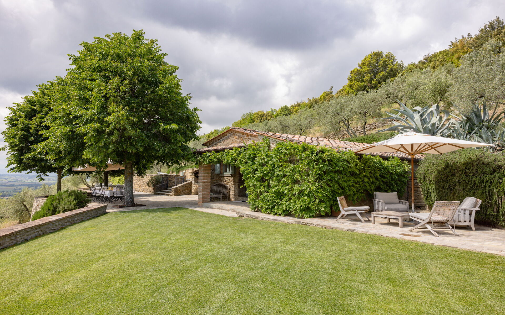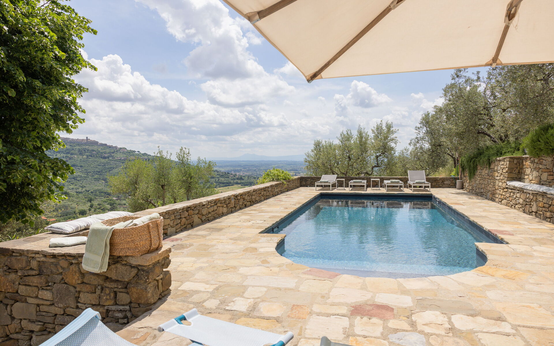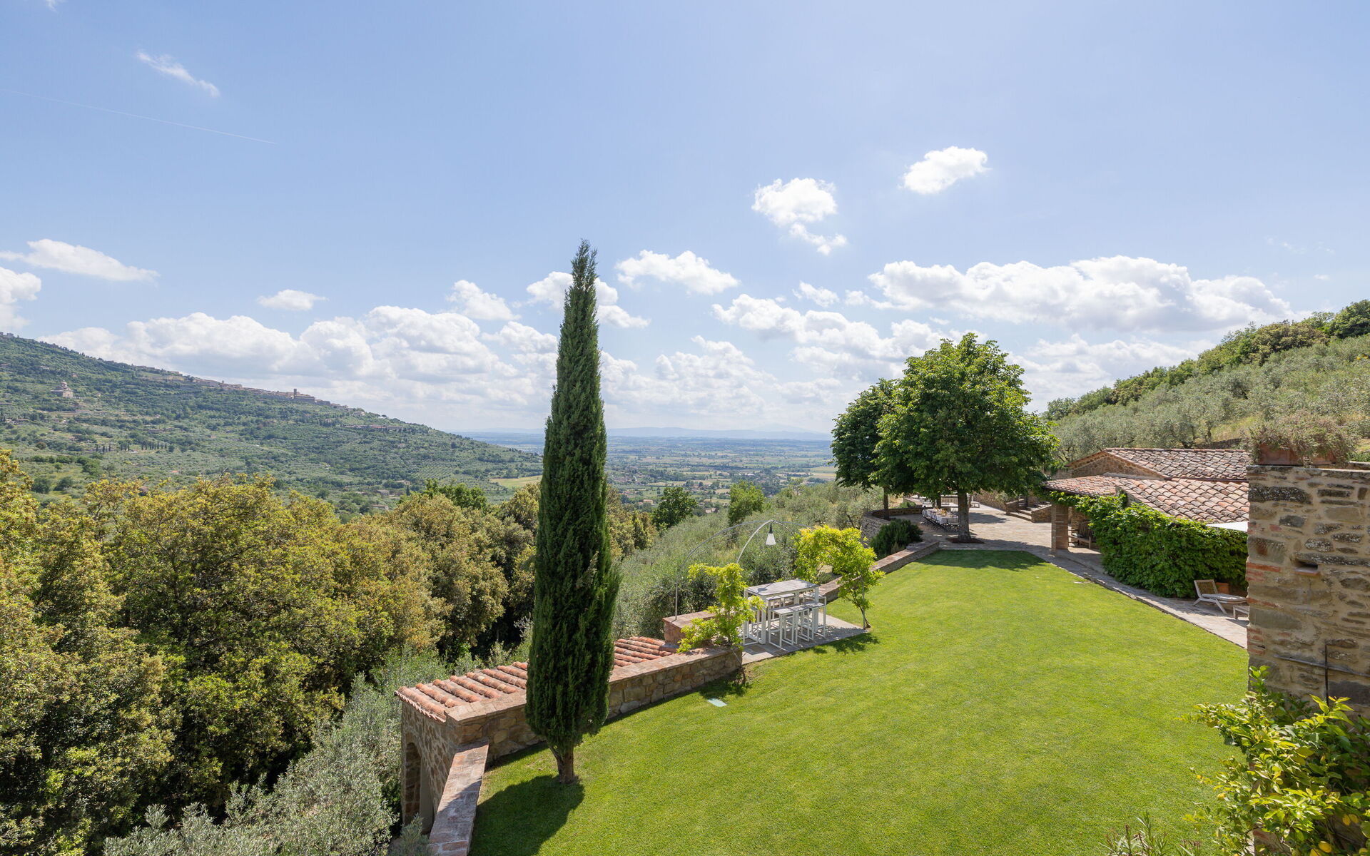 Immersed in the heart of Tuscany, nestled on the south side of the hill where the ancient Etruscan town of Cortona is located, lies Tenuta Pomona, a place where one can live an unforgettable experience, in a property of undisputed charm and luxury. The villa enjoys one of the most beautiful views of the Cortona hillside, thanks to its panoramic position with breathtaking views of the Val di Chiana and the Cortona skyline. The villa is privately located away from traffic noise and is set in a scenario where vegetation, olive trees and the typical terraces of this particular hill cone create a place of rare beauty and strong visual impact.