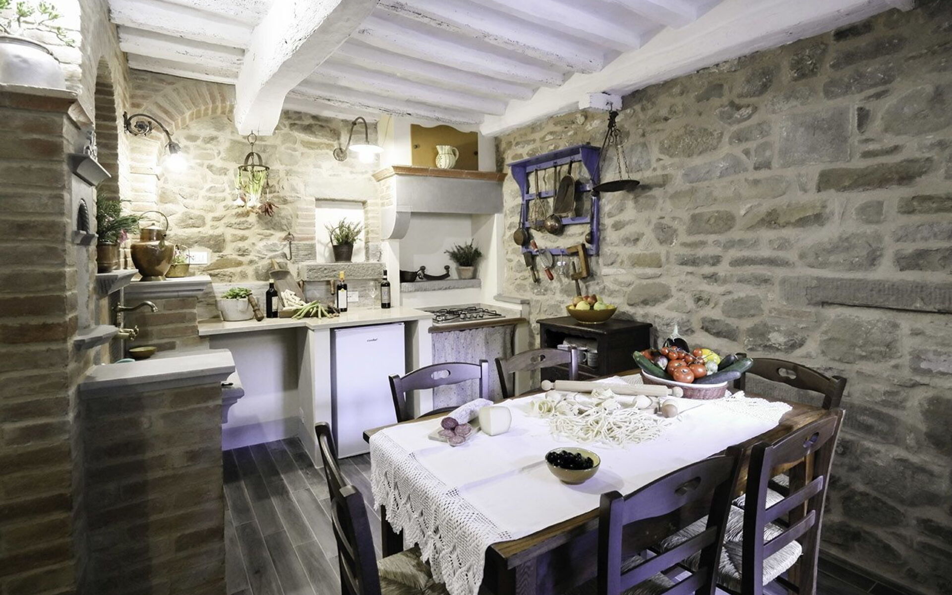 Casa Caterina develops on 3 floors and it has spacious and bright rooms (total 100 sqm) and can accommodate up to a maximum of 6 guests (2 double bedrooms and 1 double sofa bed). A small yet lovely private garden complete with table and chairs will allow you to spend moments of relaxation by reading a book or enjoying your al fresco dinings. You access the building by 2 private entrances, one directly from the garden and the other from a main door with a comfortable stone staircase that leads to the first floor. The ground floor is composed of a fully equipped kitchen, a living room with Sat Tv and a double sofa bed and it allows you to access both the garden and the staircase which lead to the first floor. A bathroom with shower complete the floor. Going up the stairs you reach the first floor that consists of a lovely living area with a second fully equipped kitchen with dining table and chairs in front of the beautiful stone fireplace. On this level, characterized by stone floors, you will also have a comfortable bathroom with shower and Sat TV.