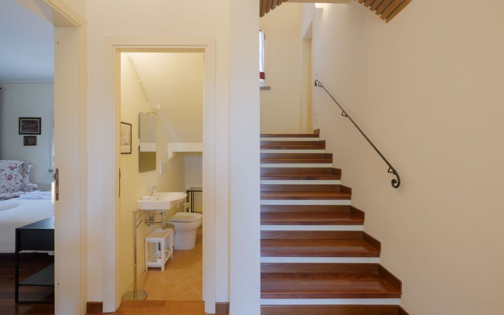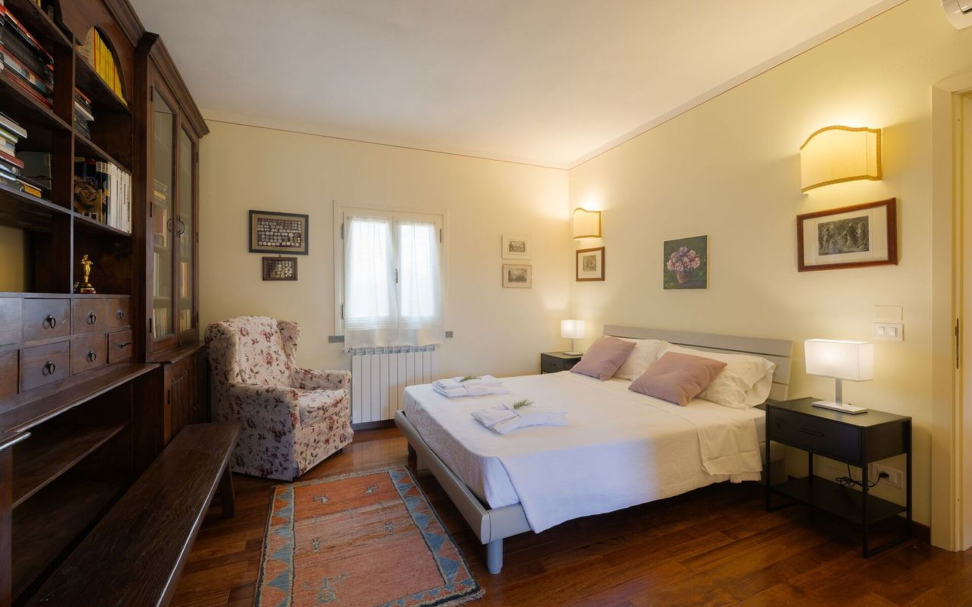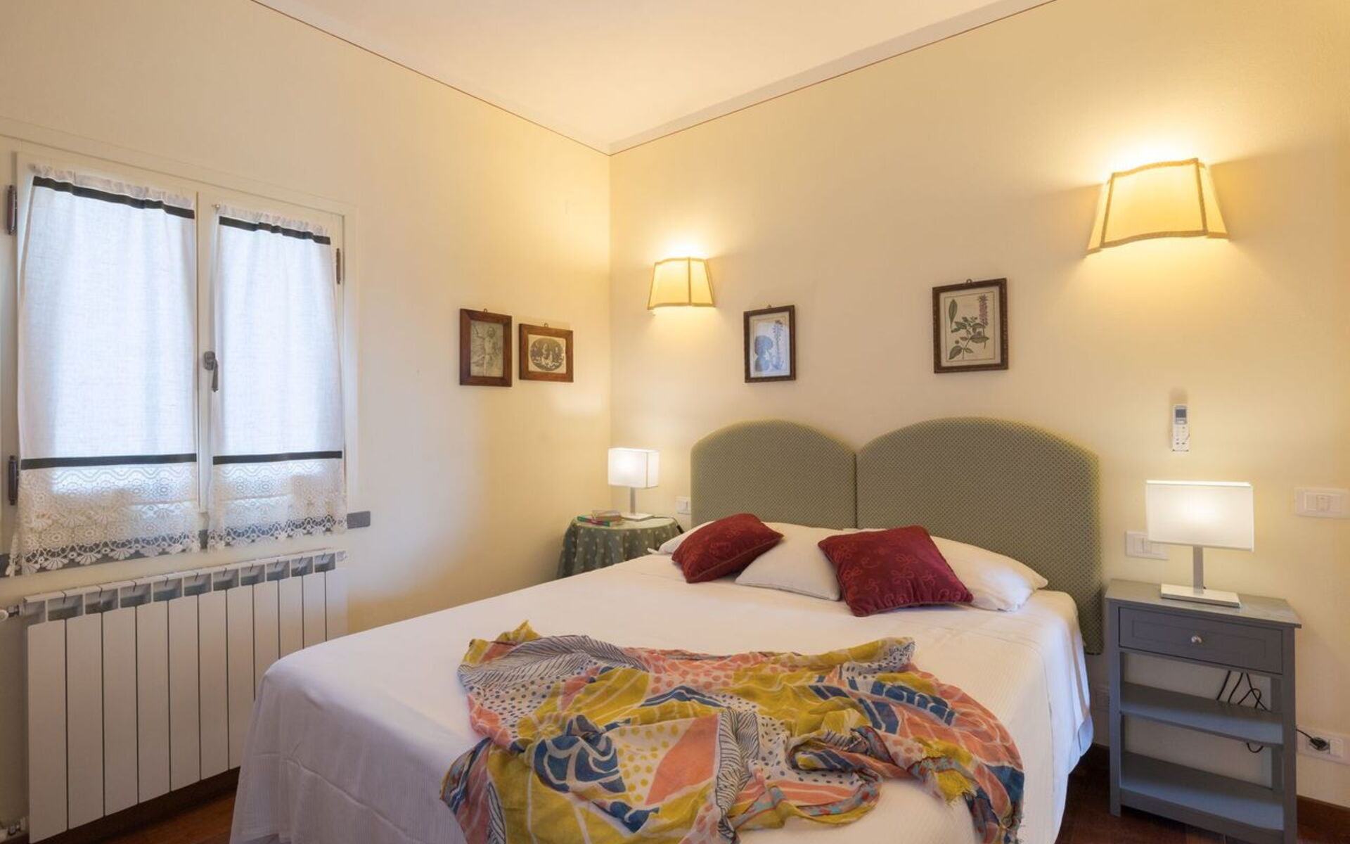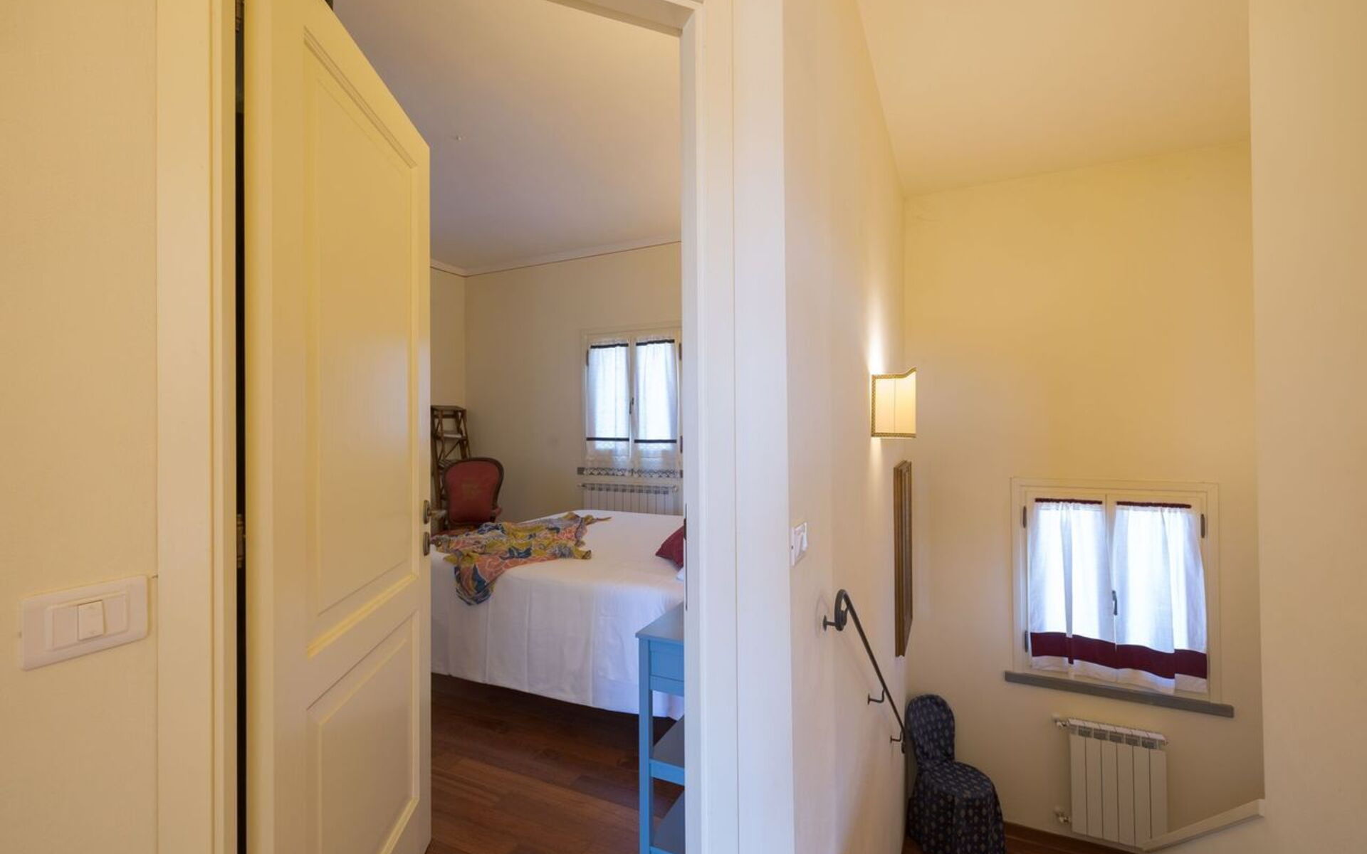 Villa Elena can easily host up to 6 people, and it spread over two levels connected by an internal staircase. The Villa, recently renovated, has got modern and elegant settings. It is characterized by a beautiful parquet floor in all the house and valuable finishes. From the main door you can directly access to an entrance/hallway where, on your left, there is the first of the three bedrooms, a wide double bedroom complete with a beautiful and refined studio area, where there is a big library and a large sofa. Next to the bedroom there is a toilet. On the right of the entrance, there is the living area composes of a stone fireplace, sofa and armchairs, a big dining table and a Smart TV. From the living room you can directly access to the kitchen through a Saloon door. The kitchen is modern and spacious, fully equipped and provided with all necessary to cook your favourite dishes and it is connected directly to the outdoor veranda where you have wide spaces for relax and for eating at your disposal. From the veranda you can access to a room used as a laundry room, complete with washer and dryer.