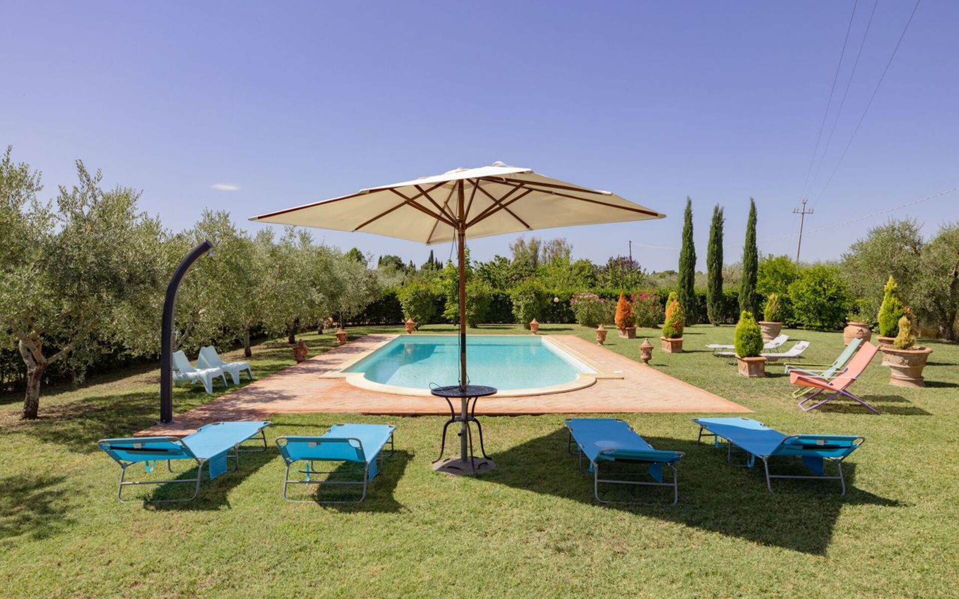 Villa Elena is perfect both for those who are looking for a secluded and quiet place, and want to easily reach the city of Cortona and the most beautiful cities in Tuscany and Umbria, as Montepulciano, Montalcino, Arezzo, Pienza, Orvieto, Assisi and many others. The property is completely fenced and it is set into a wonderful garden full of flowers and olive trees. The swimming pool area is perfectly sun exposed during all day, and it will become the perfect place where you can refresh yourself during the hot summer days. The swimming pool is complete of deckchairs, sun umbrellas and a bathroom.