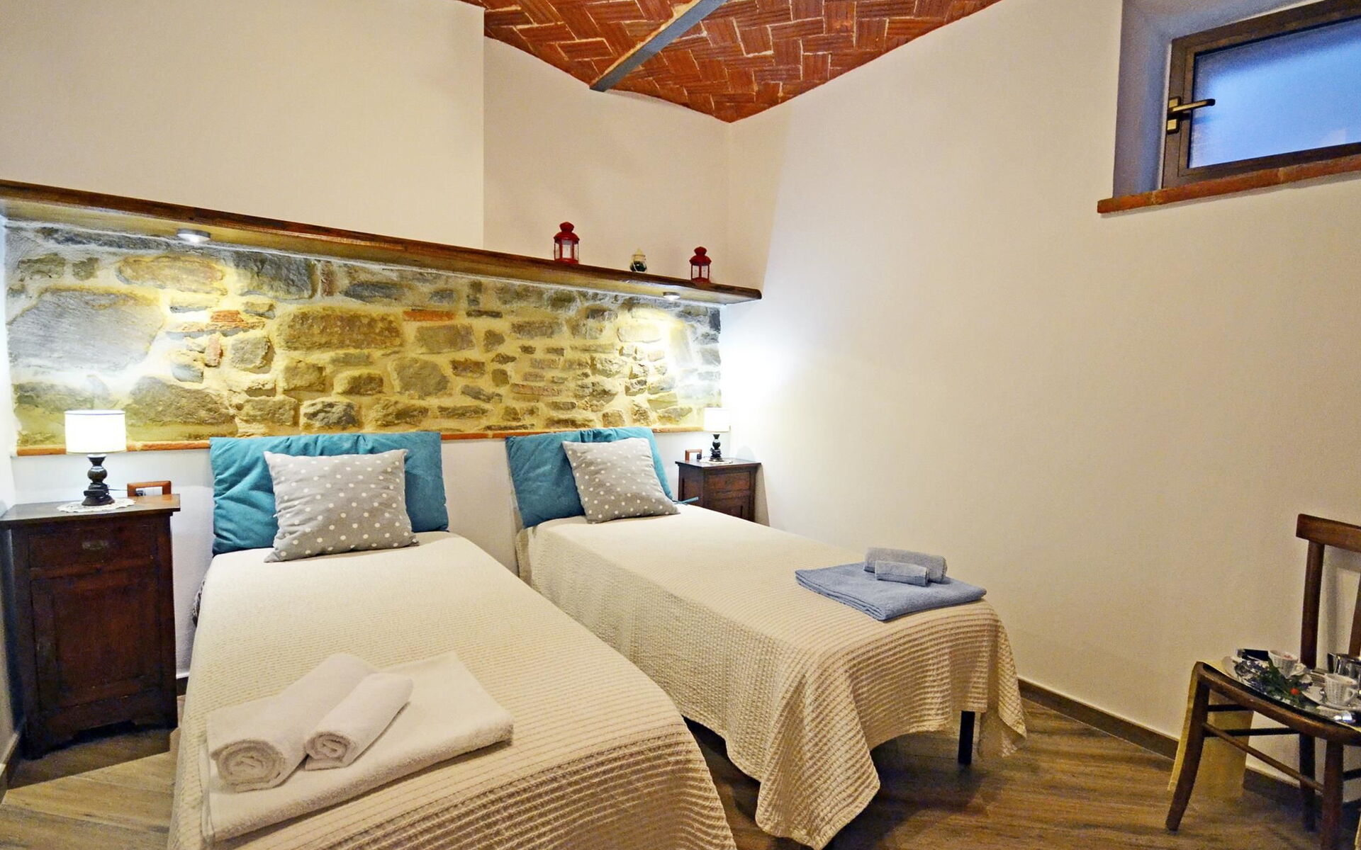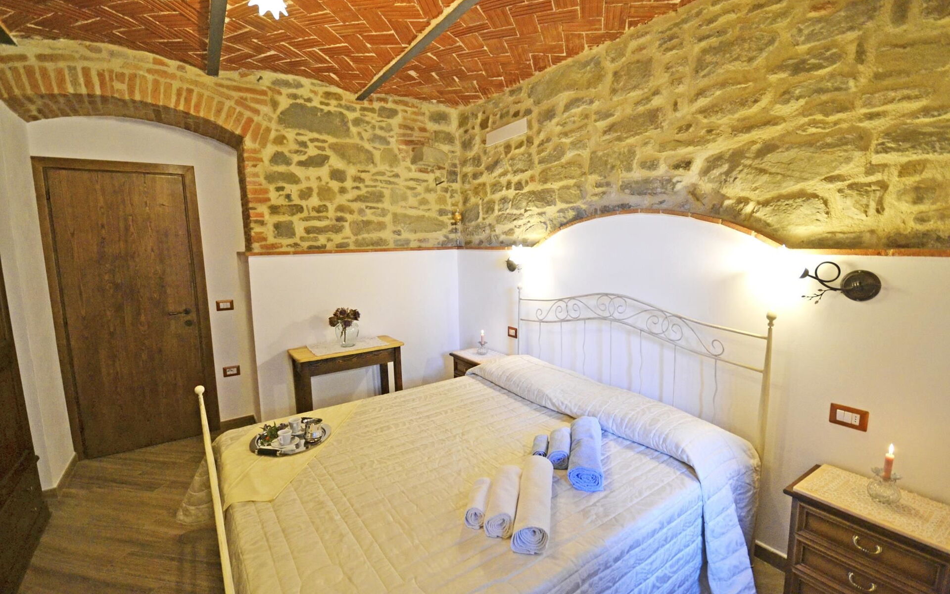 A large masonry arch divides the kitchen from the living room. In this second space you have at your disposal a sofa. Completing the room is a nice fireplace and TV. The sleeping area consist of a double with with en-suite bathroom with shower and 1 twin room (convertible into double if necessary). The apartment is completed by a spacious bathroom with shower.